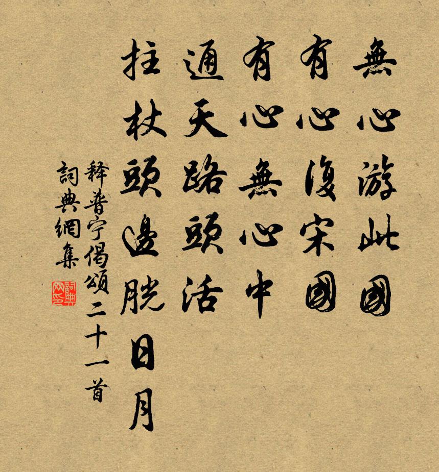 詩詞名句歷史字典書法欣賞書法字典國語詞典說文解字康熙字典古漢語字典標 題 作 者 詩 句 偈頌二十一首作者:釋普寧 朝代:宋代偈頌二十一首原文無心游此國,有心復宋國。有心無心中,通天路頭活。拄杖頭邊胱日月。詩詞問答問:偈頌二十一首的作者是誰?答:釋普寧問:偈頌二十一首寫於哪個朝代?答:宋代釋普寧偈頌二十一首書法欣賞偈頌二十一首書法作品詩詞推薦游寶應寺游酢〔宋代〕崒嵂三帶帶白灣,誰開蘭若翠微間。竹林雲懶禪心定,草徑苔荒屐齒斑。天入碧嵐成玉宇,鳥飛青嶂出塵寰。此中次韻王起宗勉為高子明繪松岩圖方回〔宋代〕松下客攜琴,岩中人讀書。聲氣相應求,妙寫人畫圖。灑落真意趣,冷淡閒工夫。體中脫不佳,明窗時自娛。誰方送李明甫召除奉常簿陳棣〔宋代〕壑主臨軒達四聰,皎如麗日明高穹。傾葵發蔀燭幽隱,熙然萬物還春風。鼎新百度躋時雍,西垣東省羅鵷鴻。鋒車小亭詩蘇泂〔宋代〕小亭西角杏花明,寂寞聞鶯但一聲。九十日春今五十,自挼紅蕊繞階行。游翠岩六首舒坦〔宋代〕繆悠此投閒,邂逅如得請。終日對林僧,是樂非世境。千秋紙上塵,萬事空中影。既往悔可追,無能味何永。仍幸次韻袁升之游雲寺鴻慶院山茶之什蒲瀛〔宋代〕年年花葉炫虛空,歲月循環十二宮。對植霜天無賴碧,特開金地可耿紅。長春此閏何妨別,密雪交加有底同。不必晚春病起呈擇之治臣司馬光〔宋代〕風日正和柔,身輕喜病瘳。懶拋殘蠹簡,暖脫弊貂裘。值客開青眼,逢花忘白頭。家家好春色,何處可同游。碧泉興作即事有感因續魏武之詩胡宏〔宋代〕對酒當歌,人生幾何。往者如江,來者如何。往來無盡,弗移弗那。奉身理物,何少何多。天長地久,我生靡它。偈六十三首釋道寧〔宋代〕雲收天際,霧卷長空。坐立儼然,誰家風月。這裡薦得,早涉崎嶇。更待商量,般雪填井。不許夜行剛把火,直須戲題湖上常建〔唐代〕湖上老人作磯(島)頭,湖裡桃花水卻流。竹竿裊裊波無(白波)際,不知何者吞吾鉤?謁漢世祖廟劉希夷〔唐代〕舂陵氣初發,漸台首未傳。列營百萬眾,持國十八年。運開朱旗後,道合赤符先。宛城劍鳴匣,昆陽鏑應弦。獷獸題棲碧山為淦龔舜咨賦傅若金〔元代〕山人愛山如李白,幽棲還在碧雲深。松杉繞屋清宵響,雷雨懸崖白晝陰。石上每同仙客坐,花間猶恐世人尋。京華浣溪沙史達祖〔宋代〕不見東山月露香。姚家借得小芬芳。亂鶯隨趁過宮牆。香珀碾花嬌有意,綠茸繡葉澀無光。御封春酒幾時嘗。劉大資輓詞二首陳與義〔宋代〕天柱欹傾日,堂堂墮虜圍。遂聞王蠋死,不見華元歸。一代名超古,千年淚染衣。當時如有繼,猶足變危機。好事近朱敦儒〔宋代〕我不是神仙,不會煉丹燒藥。只是愛閒耽酒,畏浮名拘縛。種成桃李一園花,真處怕人覺。受用現前活計,且行歌送惠儔禪者釋重顯〔宋代〕少林風規,何太蕭酒。籠古罩今,睥真睨假。誰雲發機射虎,自笑品類觀馬。劍客茫茫不要呈,甑人往往須擒下。過蘇州曉上人院朱慶餘〔唐代〕夏滿律當清,無中景自生。移松不避遠,取石亦親行。經案離時少,繩床著處平。若將林下比,應只欠泉聲。初冬章上人院皮日休〔唐代〕寒到無妨睡,僧吟不廢禪。尚關經病鶴,猶濾欲枯泉。靜案貝多紙,閒爐波律煙。清譚兩三句,相向自翛然。貧居陳某〔宋代〕秋風山木飛,秋日獨行時。身共衣冠老,妻嫌富貴遲。自分澆菊水,閒寫詠貧詩。此意不可說,夜窗明月知。和劉右司見寄六絕一律吳潛〔宋代〕撩我歸心更欲歸,綠英已是換紅菲。分明不似高空鳥,無弋無矰到處飛。名句推薦昨夜東風入武陽,陌頭楊柳黃金色。李白《早春寄王漢陽》 桃花水到報平渠,喜動新流見躍魚。黃圖安《閒詠二絕》 寵錫從仙禁,光華出漢京。張九齡《奉和聖制送尚書燕國公赴朔方》 春陰垂野草青青,時有幽花一樹明。蘇舜欽《淮中晚泊犢頭》 回眸一笑百媚生,六宮粉黛無顏色。白居易《長恨歌》 牆頭馬上遙相顧,一見知君即斷腸。白居易《井底引銀瓶·止淫奔也》 成人不自在,自在不成人。佚名《增廣賢文·下集》 凡與敵戰,若陷在危亡之地,當激勵將士決死而戰,不可懷生,則勝。佚名《百戰奇略·第五卷·危戰》 霰雪紛其無垠兮,雲霏霏而承宇。屈原《九章》 星垂平野闊,月涌大江流。杜甫《旅夜書懷》