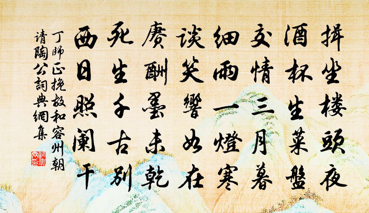 詩詞名句歷史字典書法欣賞書法字典國語詞典說文解字康熙字典古漢語字典標 題 作 者 詩 句 挽故和容州朝請陶公作者:丁師正 朝代:宋代挽故和容州朝請陶公原文揖坐樓頭夜,酒杯生菜盤。交情三月暮,細雨一燈寒。談笑響如在,賡酬墨未乾。死生千古別,西日照闌乾。詩詞問答問:挽故和容州朝請陶公的作者是誰?答:丁師正問:挽故和容州朝請陶公寫於哪個朝代?答:宋代丁師正挽故和容州朝請陶公書法欣賞挽故和容州朝請陶公書法作品詩詞推薦和寄仵判院八首趙希逢〔宋代〕寶笈瓊函世人傳,感君重諾訂金千。相應未值南來雁,謂戲前言斷不然。行香子·秋與蘇軾〔宋代〕昨夜霜風。先入梧桐。渾無處、迴避衰容。問公何事,不語書空。但一回醉,一回病,一回慵。朝來庭下,光陰如感皇恩(壽趙總管)葉景山〔宋代〕十月小春時,蓂舒六翠。天佑皇家誕賢裔。熊羆協夢,疑是麒麟分瑞。世間無限事,都如意。粉陣香圍,香嬌玉媚梅村吳偉業〔清代〕枳籬茅舍掩蒼苔,乞竹分花手自栽。不好詣人貪客過,慣遲作答愛書來。閒窗聽雨攤詩卷,獨樹看雲上嘯台。桑落謁金門(送康伯檜)張元乾〔宋代〕清光溢。影轉畫檐涼入。風露一天星斗濕。無雲天更碧。滿引送君何惜。記取吾曹今夕。目斷秋江君到日。潮來風竹章雲心〔宋代〕萬朵奇雲繞屋飛,雲心修竹綠猗猗。孤高不為風霜折,正直只應天地知。四海久無龍化處,千年幾具雁來時。晉林華景洞呂願中〔宋代〕斯洞名華景,累累乳石懸。虛崖疑月窟,絕頂瞰江湍。岩底金仙寺,峰頭玉井蓮。地形居眾外,氣象偉無前。徙仗西江月 戲呈仲敬,並其母兄劉敏中〔元代〕掌上*雛玉嫩,眼中麝錦香庖。鐵郎痴小阿瓊嬌。十歲婆兒最巧。已許卯君書癖,更看坡老詩豪。畫堂仙媼醉春醪句蔡卞〔宋代〕對掌紫樞參大政,同扶赫日上中天。武功縣中作三十首(一作武功縣閒居)姚合〔唐代〕縣去帝城遠,為官與隱齊。馬隨山鹿放,雞雜野禽棲。繞舍惟藤架,侵階是藥畦。更師嵇叔夜,不擬作書題。方拙古鳥夜啼 玉簪元好問〔金代〕花中閒遠風流。一枝秋。只枉十分清瘦不禁愁。人慾去。花無語。更遲留。記得玉人遺下玉搔頭。江南逢李龜年杜甫〔唐代〕岐王宅里尋常見,崔九堂前幾度聞。正是江南好風景,落花時節又逢君。碧雲亭晚眺二首岳珂〔宋代〕閒步碧雲亭,寒郊弄晚晴。牛羊分暝色,禽鳥有春聲。城柳風猶勁,溪梅冰共清。屋樑正殘照,西望憶長庚。醉桃園(送春)趙鼎〔宋代〕青春不與花為主。花正開時春暮。花下醉眠休訴。看取春歸去。鶯愁蝶怨春知否。欲問春歸何處。只有一尊芳醑。秀聚亭陳瓘〔宋代〕曉色春風裡,維舟一小亭。看山渾不倦,待得雪峰青。戲次前韻寄王鞏二首蘇轍〔宋代〕白馬貂裘錦幕,離觴瀲灩手親持。頭風欲待歌詞愈,肺病甘從酒力欺。不分歸心太匆草,更憐人事苦縈縻。相逢和送雙鴨洪皓〔宋代〕可惜雙鳧脫氄毛,獵師飛放豈辭勞。養賢曾食三千客,待使徒加十一牢。燔炙不須歌兔首,膳羞何必用牛膏。庖人樂天寄重和晚達冬青一篇,因成再答劉禹錫〔唐代〕風雲變化饒年少,光景蹉跎屬老夫。秋隼得時凌汗漫,寒龜飲氣受泥塗。東隅有失誰能免,北叟之言豈便無。振臂慵王令〔宋代〕衣冠慵整鬢慵梳,萬事從來靜有餘。卻笑嵇康慵未得,區區猶作絕交書。送李端叔從定州先生辟晁補之〔宋代〕中山老帥岩廊姿,不用猶作諸侯師。毛錐變化有風雨,餘事亦足疲群兒。龍門爭騖貨趨肆,求貨安知於此市。百年名句推薦烽火連三月,家書抵萬金。杜甫《春望》 公子南橋應盡興,將軍西第幾留賓。杜審言《春日京中有懷》 泉眼無聲惜細流,樹陰照水愛晴柔楊萬里《小池》 千年史冊恥無名,一片丹心報天子。陸游《金錯刀行》 將欲歙之,必故張之;將欲弱之,必故強之;將欲廢之,必故興之;將欲取之,必故與之。老子《老子·道經·第三十六章》 東風兮東風,為我吹行雲使西來。李白《久別離》 盧家少婦鬱金堂,海燕雙棲玳瑁梁。沈佺期《古意呈補闕喬知之 / 古意 / 獨不見》 公生明,偏生暗,端愨生通,詐偽生塞,誠信生神,誇誕生惑。荀子《荀子·不苟》 竹樹無聲或有聲,霏霏漠漠散還凝。杜荀鶴《春日山中對雪有作》 斜陽流水推篷坐,翠色隨人慾上船紀昀《富春至嚴陵山水甚佳》