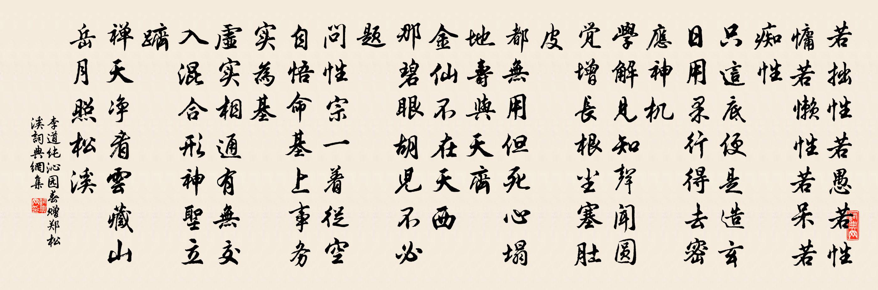 詩詞名句歷史字典書法欣賞書法字典國語詞典說文解字康熙字典古漢語字典標 題 作 者 詩 句 沁園春 贈鄭松溪作者:李道純 朝代:元代沁園春 贈鄭松溪原文若拙性若愚,若性慵若懶,性若呆若痴性。只這底便是,造玄日用,果行得去,密應神機。學解見知,聲聞圓覺,增長根塵塞肚皮。都無用,但死心塌地,壽與天齊。金仙不在天西。那碧眼胡兒不必題。問性宗一著,從空自悟,命基上事,務實為基。虛實相通,有無交入,混合形神聖立躋。禪天淨,看雲藏山嶽,月照松溪。詩詞問答問:沁園春 贈鄭松溪的作者是誰?答:李道純問:沁園春 贈鄭松溪寫於哪個朝代?答:元代問:沁園春 贈鄭松溪是什麼體裁?答:詞李道純沁園春 贈鄭松溪書法欣賞沁園春 贈鄭松溪書法作品詩詞推薦初聞得校書郎示同官三絕蘇轍〔宋代〕病後濁醪都少味,老來歡意苦無多。臨行寂寞空相對,不作新詩奈客何。過趙清獻故居王柏〔宋代〕隱隱數間清獻宅,只在城東竹樹中。龜鶴不知何去處,誰將白鹿繼高風。冬日觀漁獵者陸游〔宋代〕人閒漁獵各相從,南陌東阡處處逢。繡羽觸機余耿介,錦鱗出網尚噞喁。傍觀扶杖常移日,就買還家足御冬。更待紀事二十四首梁啓超〔清代〕匆匆羽檄引歸船,臨別更慳一握緣。今生知否能重見,一撫遺塵一惘然。【越調】柳營曲 賞春吳西逸〔元代〕花艷冶,柳欹斜,粉牆低畫樓人困也。庭院星列,羅綺雲疊,簇簇鬧蜂蝶。紫霞杯我輩豪俠,綠雲鬟仕女奇絕。烏用舊韻送魯元翰知洺州蘇軾〔宋代〕我在東坡下,躬耕三畝園。君為尚書郎,坐擁百吏繁。鳴蛙與鼓吹,等是俗物喧。永謝十年舊,老死三家村。惟君贈高效士劉克莊〔宋代〕季鹹莫測壺丘子,詹尹安知屈大夫。老子即今無可卜,問君活得幾年無。秋風生桂枝佚名〔宋代〕寒桂秋風動,蕭蕭自一枝。方將擊林變,不假舞松移。散翠幽花落,搖青密葉離。哀猿驚助褭,花露滴爭垂。遺韻寄題安福彭文昌春風樓二首楊萬里〔宋代〕不到安成二十年,故人相憶兩依然。彭家樓上春風裡,夢倚危欄俯百川。大晟府擬撰釋奠十四首佚名〔宋代〕庶幾屢空,淵源深矣。亞聖宣獻,百世宜祀。吉蠲斯辰,昭陳尊簋。旨酒欣欣,神其來止。又詠張立〔唐代〕去年今日到城都,城上芙蓉錦繡舒。今日重來舊遊處,此花憔悴不如初。折丹桂程大昌〔宋代〕童年未曉君恩重。教得能趨拱。重親帶笑酌天杯,聽祝語、殷勤捧。青衫得掛尤光寵。桂是蟾宮種。詩書濃處便生夜聞浣花江聲甚壯陸游〔宋代〕浣江之東當筰橋,奔流齧橋橋為搖。分洪初疑兩蛟舞,觸石散作千珠跳。壯聲每挾雷雨橫,巨勢潛借黿鼉驕。夢回曲江秦韜玉〔唐代〕曲沼深塘躍錦鱗,槐煙徑里碧波新。此中境既無佳境,他處春應不是春。金榜真仙開樂席,銀鞍公子醉花塵。明年過衡山贈廖處士張觀〔唐代〕未向漆園為傲吏,定應明代作征君。傳家奕世無金玉,樂道經年有典墳。帶雨小舟橫別澗,隔花幽犬吠深雲。到頭緣識宋太宗〔宋代〕世間何所益,樂善有馨香。貴賤雖差等,非違定不祥。春台宜勝地,花木收嚴霜。求取立身行,恆持但久長。曉賢師續佛壽頌黃庭堅〔宋代〕養子續佛壽,非為養色身。捧打石師子,只要實頭人。出家無正因,不得正命食。是真出家兒,不費秋毫力。講得村居陸游〔宋代〕白首歸來亦灌畦,任教鄰里笑棲棲。道心寧感兩雌雉?生計惟存五母雞。不恨閒門可羅爵,本知窮巷自多泥。暮聞出城別張又新,酬李漢李賀〔唐代〕李子別上國,南山崆峒春。不聞今夕鼓,差慰煎情人。趙壹賦命薄,馬卿家業貧。鄉書何所報,紫蕨生石雲。長安正月十六夜大雪次張守諸公二首陳造〔宋代〕詩款鈴齋到即通,細工時肯博粗工。政聲已獨當時步,人士飫觀前輩風。未分清新命開府,可能簡遠盡安豐。譚間名句推薦相顧無言,惟有淚千行。蘇軾《江城子·乙卯正月二十日夜記夢》 卻將萬字平戎策,換得東家種樹書。辛棄疾《鷓鴣天·有客慨然談功名因追念少年時事戲作》 斜陽流水推篷坐,翠色隨人慾上船紀昀《富春至嚴陵山水甚佳》 雲無心以出岫,鳥倦飛而知還。陶淵明《歸去來兮辭·並序》 窮則獨善其身,達則兼善天下。孟子《孟子·盡心章句上·第九節》 君言不得意,歸臥南山陲。王維《送別》 不憤不啟,不悱不發,舉一隅不以三隅反,則不復也。孔子弟子《論語·述而篇》 千萬恨,恨極在天涯。溫庭筠《夢江南·千萬恨》 何處相逢,登寶釵樓,訪銅雀台。劉克莊《沁園春·夢孚若》 涼月如眉掛柳灣,越中山色鏡中看。戴叔倫《蘭溪棹歌》