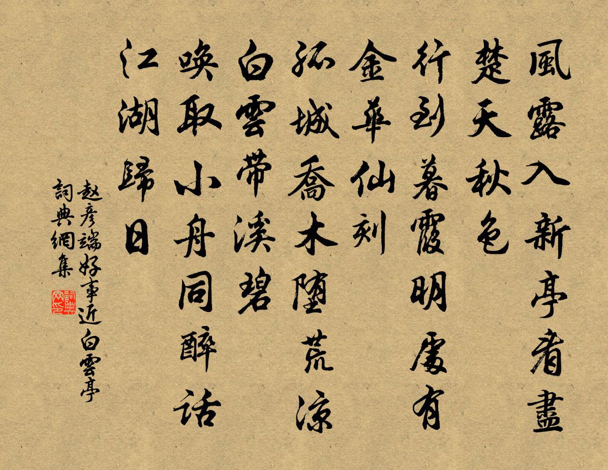 詩詞名句歷史字典書法欣賞書法字典國語詞典說文解字康熙字典古漢語字典標 題 作 者 詩 句 好事近(白雲亭)作者:趙彥端 朝代:宋代好事近(白雲亭)原文風露入新亭,看盡楚天秋色。行到暮霞明處,有金華仙刻。孤城喬木墮荒涼,白雲帶溪碧。喚取小舟同醉,話江湖歸日。詩詞問答問:好事近(白雲亭)的作者是誰?答:趙彥端問:好事近(白雲亭)寫於哪個朝代?答:宋代問:好事近(白雲亭)是什麼體裁?答:詞趙彥端好事近(白雲亭)書法欣賞好事近(白雲亭)書法作品詩詞推薦春夢紛紜楊萬里〔宋代〕燭花半作紫芝開,詩興頻遭白雨催。只有睡時愁可遣,春愁又向夢中來。留題龍隱岩□□李師中〔宋代〕亂峰凝碧□□□,曾有神龍此□□。□□已興甘澤去,高岩□葛□雲端。飲酒 其八陶淵明〔魏晉〕青松在東園,眾草沒其姿,凝霜殄異類,卓然見高枝。連林人不覺,獨樹眾乃奇。提壺撫寒柯,遠望時復為。吾生拄杖示子遹陸游〔宋代〕拄杖相從四十年,交情耐久獨依然。西窮巫峽岷江路,北抵岐山渭水邊。早已歸休弄泉石,老猶緩步歷風煙。會同土門范成大〔宋代〕污泥汨峻阪,狠石臥中路。睥睨無敢前,趑趄屢卻顧。長繩引籃輿,前挽後推去。吏士更叫號,作氣欲飛度。顛墜贈朱慶餘校書周賀〔唐代〕風泉盡結冰,寒夢徹西陵。越信楚城得,遠懷中夜興。樹停沙島鶴,茶會石橋僧。寺閣邊官舍,行吟過幾層。編續集戲書方回〔宋代〕朝衣已當酒家錢,更賣山中二頃田。盡聽小姬辭別院,單留老馬伴殘年。假令埋骨終無地,斷許知心獨有天。一事夏日山居好十首舒岳祥〔宋代〕夏日山居好,日長宜學文。金門堪避世,畝畝不忘君。林宿三冬雪,岩藏萬里雲。屈伸吾道在,何必雜人群。吳越吟二首邵雍〔宋代〕夫差丁未曾囚越,勾踐戊辰還滅吳。二十二年時返復,一如當日卻乘虛。奉和魯望樵人十詠樵歌皮日休〔唐代〕此曲太古音,由來無管奏。多雲采樵樂,或說林泉候。一唱凝閒雲,再謠悲顧獸。若遇采詩人,無辭收鄙陋。食荀釋慧空〔宋代〕機泉擣秔炊明璣,竹根燒筍然竹枝。錦繃稚子犢獻角,玉版阿師囊穎錐。同槃若覺風味好,對客不知寒涕垂。古來三昧諸頌釋印肅〔宋代〕無根樹子,混盳非出入。頭尾應皆急,妙了過這邊,渡海何曾濕。白須蒲壽宬〔宋代〕月照當襟雪,終剪施摩詰。我作白須行,而得養生術。十六日大雪方回〔宋代〕長至前逾一月晴,忽然細細雨無聲。中宵變作今□□,□得樓頭鼓角清。發通州文天祥〔宋代〕白骨叢中過一春,東將入海避風塵。姓名變盡形容改,猶有天涯相識人。雜曲歌辭。緩歌行李頎〔唐代〕小來託身攀貴游,傾財破產無所憂。暮擬經過石渠署,朝將出入銅龍樓。結交杜陵輕薄子,謂言可生復可死。一沉宮詞宋白〔宋代〕萬國車書一太平,宮花無數管弦聲。近臣入奏新祥瑞,昨夜黃河徹底清。宣甫宿約見過既而不至翌日有詩為示謹次元韻蘇頌〔宋代〕夙昔成嘉約,朝來不見過。出門非有礙,掩室返多魔。咫尺且猶爾,分攜將奈何。徘徊延望久,雲際待金波。水調歌頭(中秋)趙長卿〔宋代〕今夕知何夕,秋色正平分。嫦娥此際,底事越樣好精神。已是天高氣肅,那更清風灑灑,萬里沒纖雲。把酒臨風飲用坡仙梅花十韻訪梅劉黻〔宋代〕山寒木落峭孤台,南北常分冷暖開。自笑三生如結習,每來月下立蒼苔。名句推薦亂點碎紅山杏發,平鋪新綠水蘋生。白居易《南湖早春》 碧湖湖上柳陰陰,人影澄波浸,常記年時歡花飲。楊果《小桃紅·碧湖湖上柳陰陰》 春朝秋夜思君甚,愁見繡屏孤枕。魏承班《滿宮花·雪霏霏》 梅子金黃杏子肥,麥花雪白菜花稀。范成大《四時田園雜興·其二》 天公見玉女,大笑億千場。李白《短歌行》 中秋誰與共孤光。把盞悽然北望。蘇軾《西江月·世事一場大夢》 明日隔山嶽,世事兩茫茫。杜甫《贈衛八處士》 聚散匆匆,此恨年年有。魏夫人《點絳唇·波上清風》 寂寞柴門村落里,也教插柳記年華。趙元鎮《寒食書事》 惟天下至誠,為能盡其性。宋祁、歐陽修、范鎮、呂夏卿等《新唐書·列傳·卷八十二》