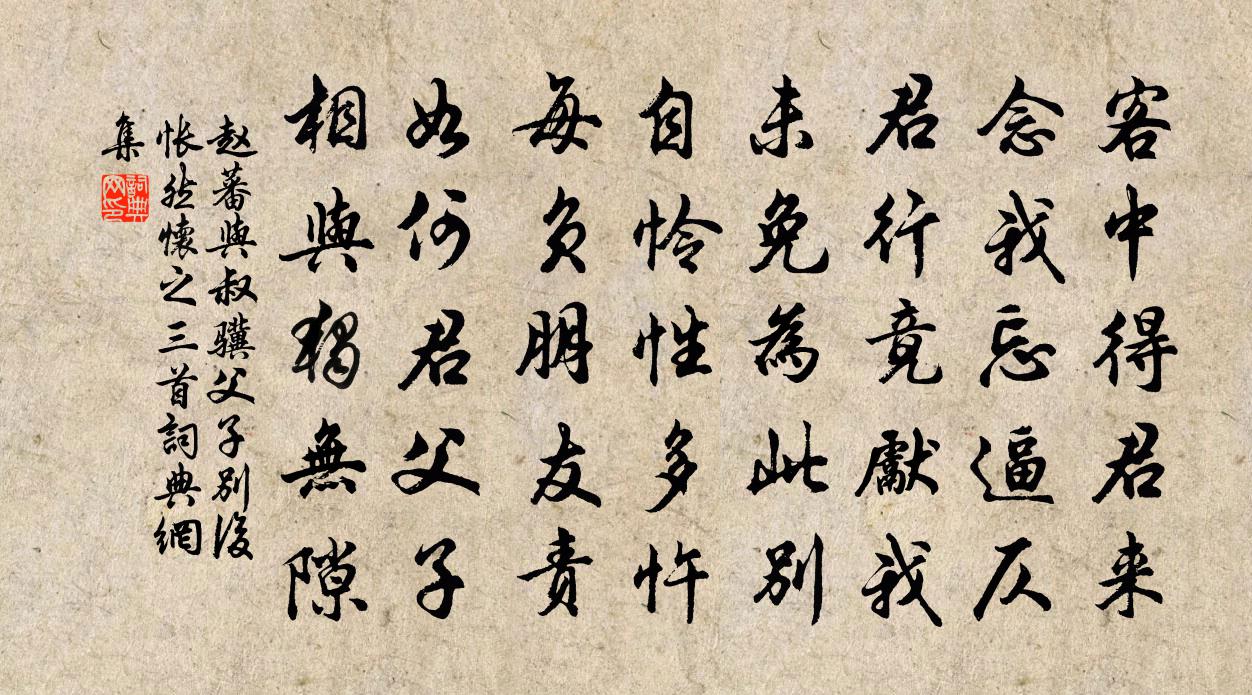 詩詞名句歷史字典書法欣賞書法字典國語詞典說文解字康熙字典古漢語字典標 題 作 者 詩 句 與叔驥父子別後悵然懷之三首作者:趙蕃 朝代:宋代原文客中得君來,念我忘逼仄。君行竟先我,未免為此別。自憐性多忤,每負朋友責。如何君父子,相與獨無隙。詩詞問答問:《與叔驥父子別後悵然懷之三首》的作者是誰?答:趙蕃問:該詩寫於哪個朝代?答:宋代書法欣賞與叔驥父子別後悵然懷之三首書法作品詩詞推薦贈韓道士(一作張佖詩)戴叔倫〔唐代〕日暮秋風吹野花,上清歸客意無涯。桃源寂寂煙霞閉,天路悠悠星漢斜。還似世人生白髮,定知仙骨變黃芽。東城陪梁大諫察院同登蔣山吳芾〔宋代〕山如屏障阜如鍾,中有巍巍古梵宮。六代興王俱掃跡,一僧遺堪尚摩空。萬松雪類長波掛,八水源從異域通。家在酬許察院曹勛〔宋代〕十載天涯客路身,不知何處是通津。華顛久已從公道,青眼遙思有故人。壯節未隨塵土變,窮愁專與歲時新。鄒枚節使少師王公輓詩二首李彌遜〔宋代〕晚歲閩江上,來從竹下賢。肯為文字飲,時訪祖師禪。念舊藏遺墨,忘形出近編。忍頌一卮酒,揮淚對新阡。小三洞於石〔宋代〕四山回合響幽泉,古木蒼藤路屈盤。一局殘棋雙鶴去,石屏空倚白雲寒。江上范成大〔宋代〕天色無情淡,江聲不斷流。古人愁不盡,留與後人愁!冬至前月赴季父梅花之集與韓蒲向憲唐乾諸人胡寅〔宋代〕不辭開後苦寒侵,為與騷人托契深。可但風光回歲律,更分華色掞儒林。欲歌白雪詞難和,試挽幽香力尚禁。等是野步十首陳普〔宋代〕流水數株殘柳,西風兩岩蘆花。荒草客愁遠道,夕陽牛帶歸鴉。次韻子瞻廣陵會三同舍各以其字為韻其一劉貢蘇轍〔宋代〕貢甫少多才,交遊一何眾。談詞坐傾倒,玉塵日揮弄。逡巡不為虐,巧捷有微中。群情忌超邁,微過出嘲諷。南遷對梅分韻得堂字釋斯植〔宋代〕霜風吹短髮,值此天氣涼。行行陰壑中,萬樹皆含芳。相對發微詠,巡用持華觴。嗟彼鹹平人,清風生我腸。花非劉郎詩蘇泂〔宋代〕白髮劉郎意自悲,桃山還是欲花時。一生漂轉成何事,留得玄都數首詩。臘月九日雪三絕句蘇轍〔宋代〕臘中得雪春宜麥,瓮里無糟寒惱人。未暇樽罍伴佳客,先將餅餌許比鄰。有感韓魯一首項安世〔宋代〕道散斯文體尚浮,韓魯力與化工侔。山瞻泰貸岩岩聾,河出崑崙混混流。長慶從官銷不得,熙寧丞相挽難留。滄州漁家傲(送台守江郎中)蘇軾〔宋代〕送客歸來燈火盡。西樓淡月涼生暈。明日潮來無定準。潮來穩。舟橫渡口重城近。江水似知孤客恨。南風為解佳人韓文公見大顛釋了惠〔宋代〕事繁求省要,省要事頻繁。縱得三平老,文公只姓韓。高郵送紫芝張弋〔宋代〕重逢又重別,把盞更悽然。明日帆開岸,平湖水接天。好詩應自作,狂夢與誰圓。我欲來相趁,揚州且住船。採桑子黃庭堅〔宋代〕城南城北看桃李,依倚年華。楊柳藏鴉。又是無言颭落花。春風一面長含笑,偷顧羞遮。分付誰家。把酒花前試問雜詠一百首石崇劉克莊〔宋代〕金谷觴豪友,珠樓擁艷姬。南交來處悖,東市悔何追。送裴騰李頎〔唐代〕養德為眾許,森然此丈夫。放情白雲外,爽氣連虬須。衡鏡合知子,公心誰謂無。還令不得意,單馬遂長驅。桑野六月二十八日入朱陀山寺洪咨夔〔宋代〕決決岩下泉,翛翛竹間路。破寂孤蜩吟,送暝疏鍾度。個裹欲求心,應生無所住。名句推薦寵辱不驚,肝木自寧陳繼儒《小窗幽記·集靈篇》 秋天一夜靜無雲,斷續鴻聲到曉聞。張仲素《秋閨思二首》 照野瀰瀰淺浪,橫空隱隱層霄。蘇軾《西江月·頃在黃州》 皎皎窗中月,照我室南端。潘安《悼亡詩三首》 蘭生幽谷,不為莫服而不芳。舟在江海,不為莫乘而不浮。君子行義,不為莫知而止休。劉安及其門客《淮南子·說山訓》 風自火出,家人;君子以言有物而行有恆。佚名《易傳·象傳下·家人》 傷情處,高城望斷,燈火已黃昏。秦觀《滿庭芳·山抹微雲》 少婦今春意,良人昨夜情。沈佺期《雜詩三首·其三》 袨服華妝著處逢,六街燈火鬧兒童。元好問《京都元夕》 死別已吞聲,生別常惻惻。杜甫《夢李白二首·其一》