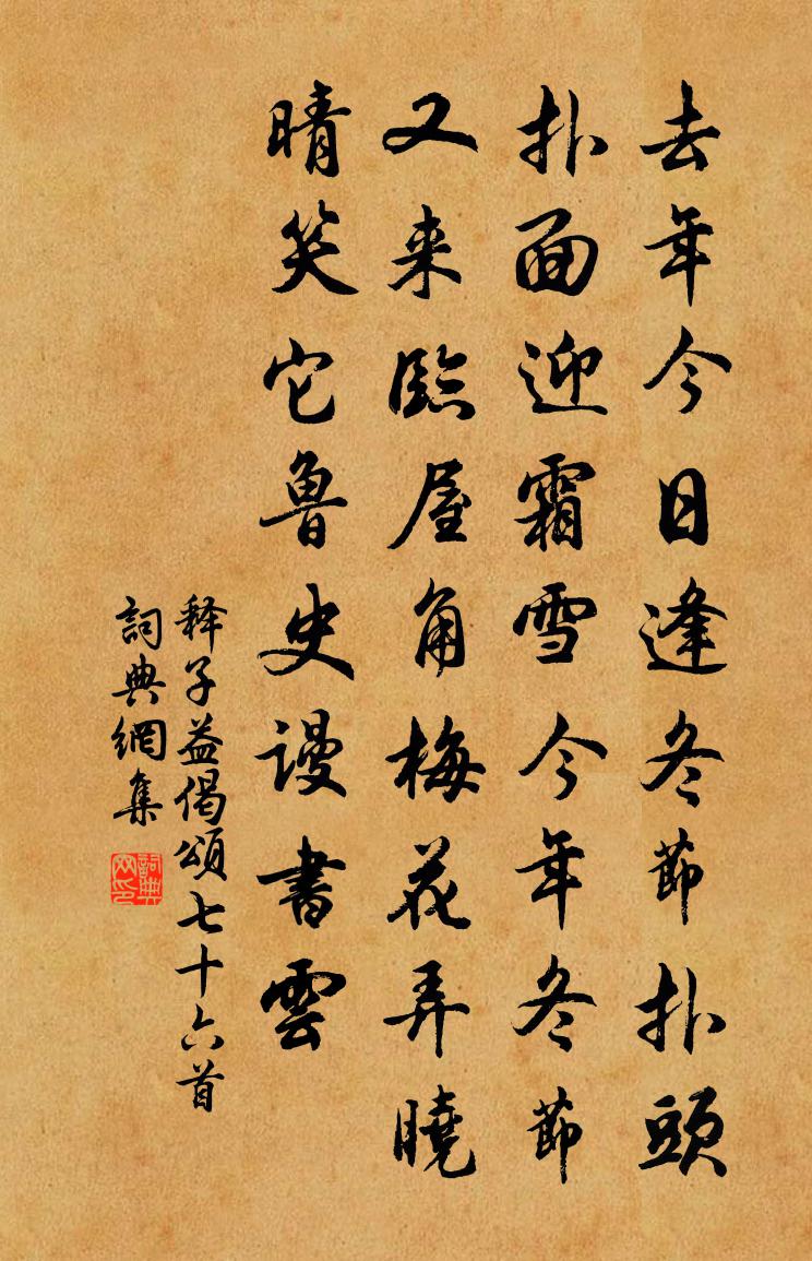 詩詞名句歷史字典書法欣賞書法字典國語詞典說文解字康熙字典古漢語字典標 題 作 者 詩 句 偈頌七十六首作者:釋子益 朝代:宋代偈頌七十六首原文去年今日逢冬節,撲頭撲面迎霜雪。今年冬節又來臨,屋角梅花弄曉晴。笑它魯史謾書雲。詩詞問答問:偈頌七十六首的作者是誰?答:釋子益問:偈頌七十六首寫於哪個朝代?答:宋代釋子益偈頌七十六首書法欣賞偈頌七十六首書法作品詩詞推薦宛丘道中張耒〔宋代〕日斜沙路馬翩翩,故欲迎涼不著鞭。誰解多情似新月,伴人歸去照人眠。賢者之孝二百四十首華寶林同〔宋代〕憶父去旱語,爾來七十秋。終焉不忍冠,灑淚望秦州。幽居陸游〔宋代〕策府還家又五年,心常無事氣常全。平生本不營三窟,此日何須直一錢!雨霽桑麻皆沃若,地偏雞犬亦翛然。閉門丙午七夕後一日晚抵松江塔下俞桂〔宋代〕到得垂虹迫暮煙,前村雨暗莫行船。幸然得與僧人熟,借得終宵客位眠。送黃舒文赴欽教劉克莊〔宋代〕博士文中貞,垂髫已定交。雅宜對紅藥,胡乃涉黃茅。薄有先生飯,全無弟子嘲。猶勝迂闊者,荷鍤墾荒郊。已巳七月游陽華李長庚〔宋代〕遙指斷崖如削瓜,碧雲一朵是陽華。莫言空洞中無物,須信嶄巉不可家。已聽泉聲響環佩,更看山色媚煙霞。一邱角招 故園舊有老梅數樹,自庚午至庚辰,十邵亨貞〔元代〕年來惟起步月前村之歡。辛巳正月二十四日,曹雲翁以紅萼一權見予,風度絕韻,舊感橫生,念之不置,因綴此闋上耿泉生朝楊簡〔宋代〕瞻彼雲台,有尋其武。祝阿發跡,中興元輔。落星寺陳舜俞〔宋代〕何年翠麓浮彭蠡,雲是寒星落鬥牛。遠水拍天圍淨界,野僧依石起朱樓。闌乾白日風吹雁,簾幕黃昏月近鷗。安住宿廬山絕頂山舍崔塗〔唐代〕一磴出林端,千峰次第看。長閒如未遂,暫到亦應難。谷樹雲埋老,僧窗瀑影寒。自嫌心不達,向此夢長安。溪亭話別周弼〔宋代〕芳時談古調,霅浦少人同。化日桃花外,歸船便隔春。題子瞻寺壁小山枯木二首黃庭堅〔宋代〕海內文章非畫師,能回筆力作枯枝。豫章從小有梁棟,也似鄭公雙鬢絲。又示段文昌佚名〔唐代〕去日既逢梅蕊綻,來時應見杏花開。偈頌一百三十六首釋惟一〔宋代〕故人義重,訪我岩扉。鳥啼花笑,雲淡風微。莫怪坐來頻勸酒,自從別後見君稀。述懷陳藻〔宋代〕病身四十未妻孥,墟墓那堪兩世孤。黃卷安貧無陋。[下缺]詠菊宋祁〔宋代〕壽客若為情,風流友麯生。殿秋安晚節,為隱被香名。曼衍南陽種,淒涼楚澤英。見山應自語,今古幾淵明。和中函晏尚書憶譙渦二首宋庠〔宋代〕縠浪如煙曲里深,使旗齋舫此幽尋。不知魚鳥思人否,曾費東山擁鼻吟。贈柳三解晁說之〔宋代〕海角那知有宮柳,故園春思尚依依。可憐風韻去人遠,一日花開天際飛。補史十忠詩四川制置使知重慶府張公珏劉壎〔宋代〕坤維拓提封,形勝古天府。血戰五十秋,零落餘八柱。江南傳箭急,誰暇此回顧。落日古渝城,杖鉞乃甚武。天東厭原山中曉行裘萬頃〔宋代〕碧雞夜半聲啁哳,喚起幽人步林樾。秋高風露著群木,無數寒光泣明月。松篁一徑宛如畫,石溜涓涓更清絕。山巔名句推薦多欲則貪,尚私則枉,其罪遂生。來俊臣《羅織經·閱人卷第一》 成大功者不小苛。劉向《說苑·政理》 莫笑他人老,終須還到老。佚名《增廣賢文·上集》 小時不識月,呼作白玉盤。李白《古朗月行》 二月賣新絲,五月糶新谷。聶夷中《詠田家 / 傷田家》 人非人不濟,馬非馬不走,土非土不高,水非水不流。戴聖《大戴禮記·曾子制言上第五十四》 鼎湖流水清且閒,軒轅去時有弓劍,古人傳道留其間李白《飛龍引二首·其二》 漢家天馬出蒲梢,苜蓿榴花遍近郊。李商隱《茂陵》 推手遽止之,濕衣淚滂滂韓愈《聽穎師彈琴》 庭院深深深幾許,楊柳堆煙,簾幕無重數。歐陽修《蝶戀花·庭院深深深幾許》