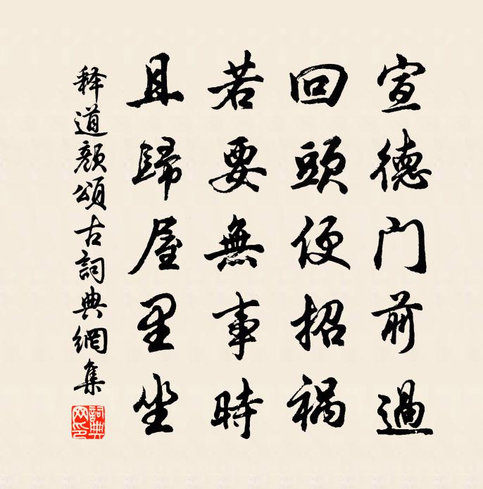 詩詞名句歷史字典書法欣賞書法字典國語詞典說文解字康熙字典古漢語字典標 題 作 者 詩 句 頌古作者:釋道顏 朝代:宋代頌古原文宣德門前過,回頭便招禍。若要無事時,且歸屋裡坐。詩詞問答問:頌古的作者是誰?答:釋道顏問:頌古寫於哪個朝代?答:宋代釋道顏頌古書法欣賞頌古書法作品詩詞推薦招隱汪遵〔唐代〕罷聽泉聲看鹿群,丈夫才策合匡君。早攜書劍離岩谷,莫待蒲輪輾白雲。清曠靜坐鄧深〔宋代〕草迷犢角掛林筍,風起繭毛楊樹花。不見黃鶯飛上柳,得知深處暗藏鴉。戲用晁補之韻蘇軾〔宋代〕昔我嘗陪醉翁醉,今君但吟詩老詩。清詩咀嚼那得飽,瘦竹瀟灑令人飢。試問鳳凰飢食竹,何如駑馬肥苜蓿。知君次韻寄上七兄黃庭堅〔宋代〕學得屠龍長縮手,鏈成五色化蒼煙。誰言遊刃有餘地,自信無功可補天。啼鳥笑歌追暇日,飽牛耕鑿望豐年。荷鋤九日書懷黃庚〔宋代〕客鬢同秋老,鄉心逐雁飛。重陽今日是,三徑幾時歸。籬下多 * ,門前少白衣。無人慰岑寂,獨立對斜暉。貽青陽宰李中〔唐代〕征賦常登限,名山管最多。吏閒民訟少,時得訪煙蘿。三封田墅宋祁〔宋代〕清和遷首序,岑寂此憑欄。澗雨虹前罷,林櫻鳥後殘。野姿連草向,天影入池寬。日暮嚴城阻,裴回惜據鞍。清平樂晏幾道〔宋代〕雙紋彩袖,笑捧金船酒。嬌妙如花輕似柳,勸客千春長壽。艷歌更倚疏弦,有情須醉尊前。恰是可憐時候,玉嬌今送安南裴都護權德輿〔唐代〕忽佩交州印,初辭列宿文。莫言方任遠,且貴主憂分。迥轉朱鳶路,連飛翠羽群。戈船航漲海,旌旆卷炎雲。絕徼贈丹陽橫山周處士惟長李白〔唐代〕周子橫山隱,開門臨城隅。連峰入戶牖,勝概凌方壺。時作白紵詞,放歌丹陽湖。水色傲溟渤,川光秀菰蒲。當其別趙文卿明府陳造〔宋代〕人品推君第一流,論文向我肯綢繆。日從紅粉追譚笑,家置青編紀唱酬。轉首各乘鳧背去,幾時同作鳳城游。臨風過鑑湖陳著〔宋代〕越城勝境素來夸,才入東關分外嘉。八百頃荷西子態,幾千餘寺賀君家。畫屏山色饒煙水,麗錦天光落晚霞。惜景漸至涪州先寄王使君武元衡〔唐代〕治教通夷俗,均輸問大田。江分巴字水,樹入夜郎煙。毒霧含秋氣,陰岩蔽曙天。路難空計日,身老不由年。將命離臨安舟中有懷山藪朱文之子聊作五絕以寄史堯弼〔宋代〕親庭遙望屬坤隅,恁子還家與說吾。為道江南足魚蟹,鄉來不復似臞儒。燈齊己〔唐代〕幽光耿耿草堂空,窗隔飛蛾恨不通。紅燼自凝清夜朵,赤心長謝碧紗籠。雲藏水國城台里,雨閉松門殿塔中。金屋聲聲慢侯善淵〔元代〕心浮易動,熟景難忘。驅馳鎮日忙忙。已過中年,有若日暮之光。恰如殘燈怕曉,似風飄、敗葉凋黃。最苦處,嘆天台書事十三首曹勛〔宋代〕束髮名場歷百艱,荷恩早許出清班。未能脫跡塵埃外,已愛著身泉石間。夢洞庭釋敬安〔清代〕昨夜汲洞庭,君山青入瓶。倒之煮團月,還以浴繁星。一鶴從受戒,群龍來聽經。何人忽吹笛,使我松間醒。西齋秋感二十首方回〔宋代〕吾所學詩伯,近世惟二陳。稍換後山骨,複寫簡□□。□□足活法,亦復窺天珍。妙年張文潛,晚節呂居仁。書名次韻孔彥常舍人曝書秦觀〔宋代〕上帝圖書府,傳觀詔特容。嘉賓蒼佩玉,盛饌紫駝峰。散帙牙籤亂,開函錦襲重。君羹如可請,願備北堂供。名句推薦可憐赤壁爭雄渡,唯有蓑翁坐釣魚。杜牧《齊安郡晚秋》 月過十五光明少,人到中年萬事休。佚名《增廣賢文·上集》 我閉南樓看道書,幽簾清寂在仙居。李白《早秋單父南樓酬竇公衡》 一片春愁待酒澆。江上舟搖,樓上簾招。蔣捷《一剪梅·舟過吳江》 細草微風岸,危檣獨夜舟。杜甫《旅夜書懷》 道傍榆莢仍似錢,摘來沽酒君肯否。岑參《戲問花門酒家翁》 蓄恩不倦,以一取萬。黃石公《三略·上略》 侈而墮者貧,而力而儉者富。韓非及後人《韓非子·顯學》 盛而不驕,勞而不矜其功。左丘明《國語·越語·范蠡進諫勾踐持盈定傾節事》 江水三千里,家書十五行。袁凱《京師得家書》