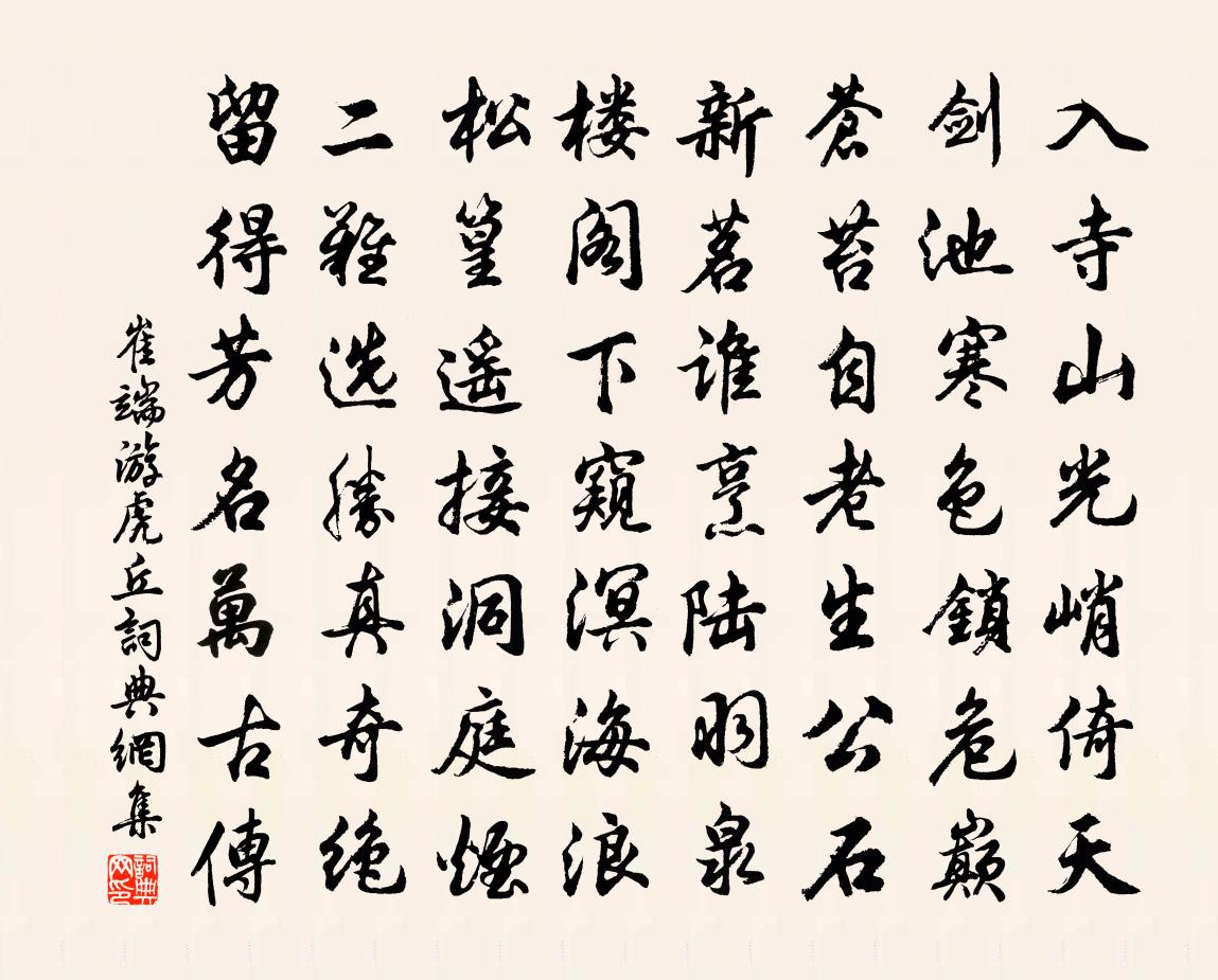 詩詞名句歷史字典書法欣賞書法字典國語詞典說文解字康熙字典古漢語字典標 題 作 者 詩 句 游虎丘作者:崔端 朝代:宋代游虎丘原文入寺山光峭倚天,劍池寒色鎖危巔。蒼苔自老生公石,新茗誰烹陸羽泉。樓閣下窺溟海浪,松篁遙接洞庭煙。二難選勝真奇絕,留得芳名萬古傳。詩詞問答問:游虎丘的作者是誰?答:崔端問:游虎丘寫於哪個朝代?答:宋代崔端游虎丘書法欣賞游虎丘書法作品詩詞推薦中書令程文簡輓辭三首蘇頌〔宋代〕星墜寢門夕,歌興夢奠時。騎箕良弼去,罷社國人悲。富貴驚川逝,功名白日垂。只應金石刻,無愧伯喈辭。傅推官勸農七絕句擬和其五山家鄭剛中〔宋代〕蓬蒿深處有人家,戶外蛛絲綱露華。數樹芭焦乾未得,長官親自見生涯。春日旅舍李頻〔唐代〕未識東西南北路,青春白日坐銷難。如何一別故園後,五度花開五處看。句丁謂〔宋代〕泣珠泉客通關市,種玉仙翁寄版圖。潑墨池曾極〔宋代〕二酉珍儲已遍窺,仙班寧肯列愚痴。注經穴石須勤苦,留得千年潑墨池。書嘆陸游〔宋代〕早得虛名翰墨林,謝歸忽已歲時侵。春郊射雉朝盤馬,秋院焚香夜弄琴。病酒閉門常兀兀,喔詩袖手久愔愔。浮沉元日書懷王炎〔宋代〕年光除日又元日,心事今吾非故吾。兩板不須書鬱壘,一杯亦強飲屠蘿。添丁解事尋王母,內子傷時念老姑。欲報哀虢縣令猶子箅張舜民〔宋代〕種瓜再摘覺瓜稀,不為衰年骨肉離。何事一哀還不哭,老人相別不多時。愛日陳普〔宋代〕一寸光陰直萬錢,況兼妙質與崇年。睡魔懶崇俱驅去,要與窗駒鬥著鞭。林下留別道友齊己〔唐代〕住亦無依去是閒,何心終戀此林間。片雲孤鶴東西路,四海九州多少山。靜坐趁涼移樹影,興隨題處著苔斑。秋來江行吳融〔唐代〕來時風,去時雨,蕭蕭颯颯春江浦。欹欹側側海門帆,軋軋啞啞洞庭櫓。和丁大卿韻姜特立〔宋代〕久回俗駕向山中,無復詩騷見古風。方喜故人千里至,更容清夜一尊同。賓筵談笑知無敵,筆力追陪愧未工。自古二蔡陪輔展晤二帖贊岳珂〔宋代〕王氏之鬻他帖也,有紙繅其間。予見其粉墨闌珊,既磨而殘。而考其氏名,輒長愾而永嘆。曰予聞這叢談,是與忠王太古偕游靈岩余以事中止先還陳深〔宋代〕峭峭孤峰起,蒼寒倚太虛。尚嫌凡子到,那被美人汙。霸業消磨盡,浮屠突兀居。憑高怕悽愴,興盡即回艫。東渡早梅一樹,歲華如雪,酣賞成詠羊士諤〔唐代〕暇日留□事,期雲亦□開。鄉心持歲酒,津下賞山梅。晚實和商鼎,濃香拂壽杯。唯 * 北客,日日踏青來。和答斯遠因梅見屬三首趙蕃〔宋代〕君行過海門,惟復仍舊里。友朋不易得,相與況能爾。獨念吾家侄,無由從夫子。崑山龔立道作棲閒堂取李太白題龔處士別墅詩孫應時〔宋代〕一丘一壑塵埃外,三沐三薰清淨身。別墅只今唐處士,高風當日漢君賓。打門未肯容驚夢,載酒誰能徑卜鄰。千里賀族兄寵妾生子姚勉〔宋代〕艷紅書香紫春正書中,扶輿書磅礴清氣書融。玉麟夜掣香案鎖,五雲裹送光玲瓏。吾家自是詩書裔,秀傑相承擢丹和李明叔理定道中李師中〔宋代〕幽居日日數歸程,已寫華嚴兩帙經。門外初寒江氣白,嶺頭多雨曉痕青。曾逢飯顆潮山笠,應載鴟夷笑井瓶。客土冬日梅窗書事四首 其一朱淑真〔宋代〕明窗瑩幾淨無塵,月映幽窗夜色新。惟有梅花無限意,射人又放一枝春。名句推薦好面譽人者,亦好背而毀之。莊子《莊子·雜篇·盜跖》 辭柯霜葉,飛來就我題紅。朱庭玉《天淨沙·秋》 綴玉聯珠六十年,誰教冥路作詩仙。李忱《吊白居易》 已知泉路近,欲別故鄉難。夏完淳《別雲間》 枕上潛垂淚,花間暗斷腸。魚玄機《贈鄰女 / 寄李億員外》 以言取人,人飾其言;以行取人,人竭其行。佚名《逸周書·卷九·芮良夫解》 午枕夢初殘,高樓上,獨憑闌乾。朱栴《青杏兒·秋》 落紅不是無情物,化作春泥更護花。龔自珍《己亥雜詩·其五》 青山隱隱水迢迢,秋盡江南草未凋。杜牧《寄揚州韓綽判官》 料黛眉重鎖隋堤,芳心還動梁苑。盧祖皋《宴清都·初春》