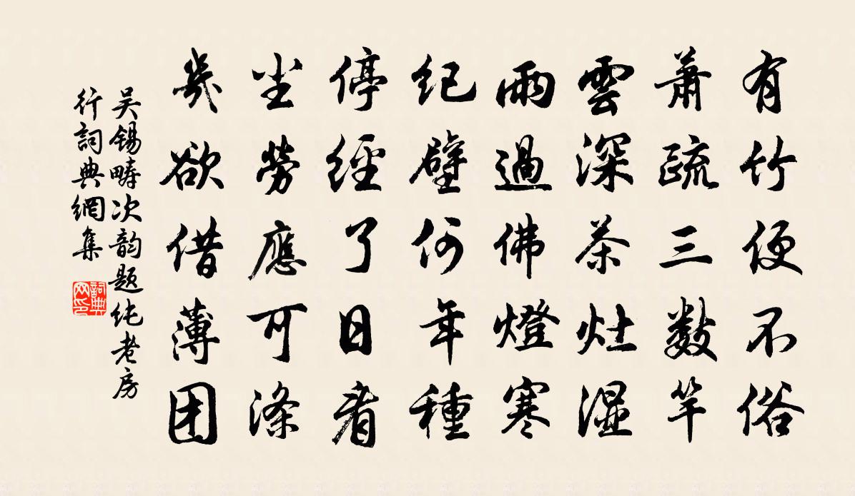 詩詞名句歷史字典書法欣賞書法字典國語詞典說文解字康熙字典古漢語字典標 題 作 者 詩 句 次韻題純老房行作者:吳錫疇 朝代:宋代次韻題純老房行原文有竹便不俗,蕭疏三數竿。雲深茶灶濕,雨過佛燈寒。紀壁何年種,停經了日看。塵勞應可滌,幾欲借薄團。詩詞問答問:次韻題純老房行的作者是誰?答:吳錫疇問:次韻題純老房行寫於哪個朝代?答:宋代吳錫疇次韻題純老房行書法欣賞次韻題純老房行書法作品詩詞推薦兵後登大內芙蓉閣宮人梳洗處汪元量〔宋代〕粲粲芙蓉閣,我登雙眼明。手拊沈香闌,美人已東征。美人未去時,朝理綠雲鬟,暮吹紫鸞笙。美人既去時,閣下送客往湘江李端〔唐代〕識君年已老,孤棹向瀟湘。素髮臨高鏡,清晨入遠鄉。三山分夏口,五兩映涔陽。更逐巴東客,南行淚幾行。題寧庵王柏〔宋代〕寂寂鍾魚冷,松楸蔽杳冥。雲侵晴路濕,衣染晚嵐青。天未生人物,山應銷地靈。何祠香一瓣,遺恨滿空庭。王成之給事輓歌辭陸游〔宋代〕詩騷湘水客,風度曲江公。一夕南樓去,千秋東省空。囊封震朝右,墨敕絕宮中。贈極文昌貴,君恩厚飾終。謹和老人初冬寓筆十絕洪咨夔〔宋代〕方窮蔡擇問唐舉,未遇鄴侯逢懶殘。觸石起雲能沛雨,不應長作旱雷看。百字令(壽虞守·正月十二)陳潛心〔宋代〕梅峰孕秀,太仙翁、咫尺元宵三夕。盛德溫溫如玉粹,多少殊勛嘉績。兩擁朱幡,獨清節,高誼真難屈。景疏堂下中宗祀昊天樂章。舒和佚名〔唐代〕已陳粢盛敷嚴祀,更奏笙鏞協雅聲。璇圖寶曆欣寧謐,晏俗淳風樂太平。默齋壁間竹鶴許月卿六〔宋代〕琅玕壁上林稍接,彷佛胎仙舞雪翎。欲識主人齋扁意,此君相對不容聲。哭故主人陳太師李中〔唐代〕十年孤跡寄侯門,入室升堂忝厚恩。游遍春郊隨茜旆,飲殘秋月待金尊。車魚鄭重知難報,吐握周旋不可論。長慟眾樂亭陳舜俞〔宋代〕湖光野色著人衣,眾樂開亭此處宜。擊櫂高歌山自響,踏青紅影岸相隨。消除矰繳容鷗鳥,改換風煙入柳絲。荇菜游虎丘鄭覺民〔宋代〕丘壑癖所耽,從游虎踞岩。山形藏古寺,泉脈涌幽潭。遠望悲陳跡,清禪任閉庵。繇來賢達士,捷徑鄙終南。和王安之六老詩呂公著〔宋代〕六老播然鬢似霜,縱心年至又非狂。園池共避何方勝,樽酒相歡未始忙。杖屨爛游千載運,衣巾濃惹萬花香。過從和天啟惠橘詩張耒〔宋代〕十年不摘洞庭霜,喜見新苞照眼黃。但對典刑休嗜味,虎賁猶得作中郎。齊天樂(同上)陳恕可〔宋代〕蛻仙飛佩流空遠,珊珊數聲林杪。薄暑眠輕,濃陰聽久,勾引淒涼多少。長吟未了。想猶怯高寒,又移深窈。與整第一百九十七文天祥〔宋代〕關河霜雪清,故人亦流落。夷歌奉玉盤,悲君隨燕雀。初葺遺老齋二首蘇轍〔宋代〕髭鬚渾白已經歲,腰痛春來日又多。一味安閒猶有礙,卻令朝謁擬如何。築居定作子孫計,好事久遭僧佛呵。尤愧桑中生李佚名〔〕南頓張助於田中植禾,見李核,欲持去,顧見空桑中有土,因植種,以余漿灌溉,後人見桑中復生李,轉相告語。送滕彥道除太府寺簿歸吳門需次李洪〔宋代〕論交先友接樞廷,末路為寮喜典刑。桃李春風同扈蹕,衡茅夜雪並寒廳。暫從簿領陪卿月,行握蘭荃應列星。臨別成父居於普寧寺鐘樓之下辟以為齋舊名坎止近趙蕃〔宋代〕我有嗜睡癖,衾枕長與偕。晨昏要無失,曷日住君齋丙午歲旦司空圖〔唐代〕雞報已判春,中年抱疾身。曉催庭火暗,風帶寺幡新。多慮無成事,空休是吉人。梅花浮壽酒,莫笑又移巡。名句推薦渡頭楊柳青青。枝枝葉葉離情。晏幾道《清平樂·留人不住》 不看僧面看佛面。吳承恩《西遊記·第三十一回》 晨興理荒穢,帶月荷鋤歸。陶淵明《歸園田居·其三》 倦遊京洛風塵,夜來病酒無人問。晁端禮《水龍吟·詠月》 湖上春來似畫圖,亂峰圍繞水平鋪。白居易《春題湖上》 晴日暖風生麥氣,綠陰幽草勝花時。王安石《初夏即事》 喧鳥覆春洲,雜英滿芳甸。謝朓《晚登三山還望京邑》 爐火照天地,紅星亂紫煙。李白《秋浦歌十七首》 心以啟智,智以啟財,財以啟眾,眾以啟賢,賢之有啟,以王天下。姜子牙《六韜·武韜·三疑》 勿貪意外之財,勿飲過量之酒。朱柏廬《朱子家訓·全文》