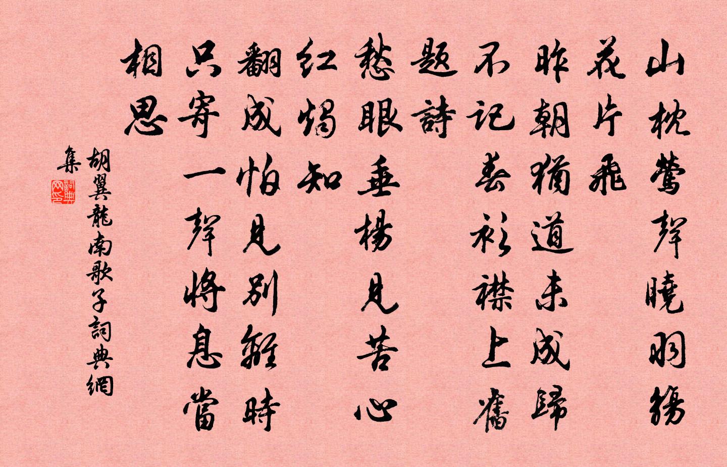 詩詞名句歷史字典書法欣賞書法字典國語詞典說文解字康熙字典古漢語字典標 題 作 者 詩 句 南歌子作者:胡翼龍 朝代:宋代南歌子原文山枕鶯聲曉,羽觴花片飛。昨朝猶道未成歸。不記春衫襟上、舊題詩。愁眼垂楊見,苦心紅燭知。翻成怕見別離時。只寄一聲將息、當相思。詩詞問答問:南歌子的作者是誰?答:胡翼龍問:南歌子寫於哪個朝代?答:宋代問:南歌子是什麼體裁?答:詞胡翼龍南歌子書法欣賞南歌子書法作品詩詞推薦冷泉亭記白居易〔唐代〕東南山水,餘杭郡為最。就郡言,靈隱寺為尤。由寺觀,冷泉亭為甲。亭在山下,水中央,寺西南隅。高不倍尋,登嵩山十首 醒心泉蘇轍〔宋代〕上山苦饑渴,中道得寒泉。舉瓢石竇響,入口煩痾痊。洑流去不見,落澗聲鏘然。莫歸復相值,相從下平川。青龍師安上人司空圖〔唐代〕災曜偏臨許國人,雨中衰菊病中身。清香一炷知師意,應為昭陵惜老臣。寒食上冢楊萬里〔宋代〕逕直夫何細!橋危可免扶?遠山楓外淡,破屋麥邊孤。宿草春風又,新阡去歲無。梨花自寒食,進節只愁余。寄題張道士招真閣李呂〔宋代〕君成道,去何許,寂寂空山號行府。自從漢末人相值,因循今莫睹。淒涼古廟落嵓隈,水繞閒庭縈嫩苔。敕令立觀榮家鶴林逋〔宋代〕種莎池館久淹留,品格堪憐絕比儔。春靜棋邊窺野客,雨寒廊底夢滄州。清形已入仙經說,冷格曾為古畫偷。數啄和汝霖三首胡寅〔宋代〕桃李無言春事深,便看園樹欲交陰。永懷北固吹長笛,一 * 典破衾。金羽喜從幽谷出,錦鱗貪引翠竿沉。好傳陳安行舍人閣學輓詞三首楊萬里〔宋代〕循吏今為冠,高文妙草麻。龔黃低一著,班左共三家。風度春無價,身名玉絕瑕。可憐人士淚,滴損紫薇花。送貴溪尉周懿文宋庠〔宋代〕津亭理櫂拂朝霞,試補東溪縣道賒。旅突倦供樵客桂,官符貪及戍時瓜。蟾生海岸空弦濕,天倚山城一蓋斜。歲晚逢春釋善珍〔宋代〕衰老逢春能幾回,自憐光景賦殘梅。齒牙落盡舌猶在,年歲閱多心尚孩。座上麈閒談客去,手中書墮睡魔來。生平送仲晦國錄赴康州二首劉克莊〔宋代〕別我暑竹三百里,使君此舉古今稀。班荊不以牙旗從,剪韭都忘草具微。浪汩鳶飛毋久住,潁川鳳下可遄歸。未妨讀杜詩文天祥〔宋代〕平生蹤跡只奔波,偏是文章被折磨。耳想杜鵑心事苦,眼看胡馬淚痕多。千年夔峽有詩在,一夜耒江如酒何,黃土圓圓曲吳偉業〔清代〕鼎湖當日棄人間,破敵收京下玉關,慟哭六軍俱縞素,衝冠—怒為紅顏。紅顏流落非吾戀,逆賊夭亡自荒宴。電掃送李元藻入浙三首趙蕃〔宋代〕我作長沙客,諸公多與游。聞風亦云舊,識面悵無由。忽辱高軒過,仍蒙古句投。偶從旁捨去,不辦小淹留。百丈山袁陟〔宋代〕復嶺逾崷崒,層崖遍屈盤。寺當幽谷面,路指白雲端。樹老蒼天骨,藍凝上帝冠。右屏秋已凍,板屋夜多寒。三宿穆王宴王母於九光流霞館曹唐〔唐代〕桑葉扶疏閉日華,穆王邀命宴流霞。霓旌著地雲初駐,金奏掀天月欲斜。歌咽細風吹粉蕊,飲余清露濕瑤砂。不知題吳氏四賢堂羅鑒〔宋代〕河汾續經罷,洙泗還清風。深衣在帶垂,身退道則豐。一編通言在,萬古無盲聾。遺像今偉然,吾敬環溪公。秋懷二首郭印〔宋代〕西風獵獵動天關,底事縈心撥棄難。夜枕蛩聲連曉急,暮樓鴻影落江寒。遣懷樽酒渾消得,遮眼文書亦倦看。物理南湖張鎡〔宋代〕胸中詩本慳,天教專一壑。萬景休坌來,老夫重然諾。次韻十詩樓鑰〔宋代〕自憐鶴髮奉慈親,家舅還欣托寶鄰。已向雲間收倦翼,甘從波底作潛鱗。幸然松菊連三徑,誰謂神仙隔一塵。野服名句推薦同聲則異而相應,意合則未見而相親戴聖《大戴禮記·保傅第四十八》 人迷洞庭水,雁度瀟湘煙。李白《郢門秋懷》 南浦淒淒別,西風裊裊秋。白居易《南浦別》 側見雙翠鳥,巢在三珠樹張九齡《感遇十二首·其四》 詩家清景在新春,綠柳才黃半未勻。楊巨源《城東早春》 望征路愁迷,離緒難整陸叡《瑞鶴仙梅》 見梨花初帶夜月,海棠半含朝雨。万俟詠《三台·清明應制》 隨意春芳歇,王孫自可留。王維《山居秋暝》 為問山翁何事,坐看流年輕度,拚卻鬢雙華。葉夢得《水調歌頭·秋色漸將晚》 鈍學累功,不妨精熟顏之推《顏氏家訓·文章篇》