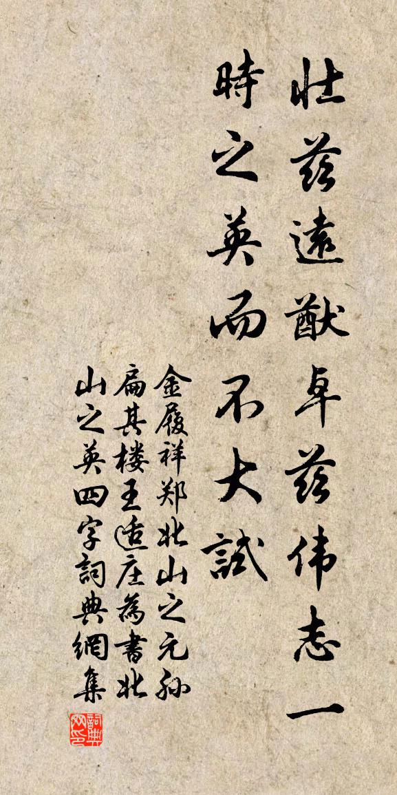 詩詞名句歷史字典書法欣賞書法字典國語詞典說文解字康熙字典古漢語字典標 題 作 者 詩 句 鄭北山之元孫扁其樓王適莊為書北山之英四字作者:金履祥 朝代:宋代原文壯茲遠猷,卓茲偉志。一時之英,而不大試。詩詞問答問:《鄭北山之元孫扁其樓王適莊為書北山之英四字》的作者是誰?答:金履祥問:該詩寫於哪個朝代?答:宋代書法欣賞鄭北山之元孫扁其樓王適莊為書北山之英四字書法作品詩文賞析【原題】:鄭北山之元孫扁其樓王適莊為書北山之英四字求跋為作詩詩詞推薦西距渭南二十里有佛祠曰梁田其主僧守遂者引強至〔宋代〕洋州太守駐雙輪,佳句曾留渭水春。一紀卻題關右節,二篇才出屋間塵。濡毫忽聽山僧語,題柱須防縣令嗔。只道早發奴寨陸游〔宋代〕暖徹衣篝蠟炬明,鄰雞喔喔促殘更。丈夫雖有四方誌,客子終悲千里行。月落龍蛇蟠木影,山空風雨起灘聲。上車慈聖光獻太皇后輓詞二首陳襄〔宋代〕慶壽蟠桃曉霧昏,忽聞笳鼓咽都門。宮闈有范遺文母,社稷無憂付聖孫。四海心喪同祖妣,一封手詔易陵園。君王大明佚名〔先秦〕明明在下,赫赫在上。天難忱斯,不易維王。天位殷適,使不挾四方。摯仲氏任,自彼殷商,來嫁於周,曰嬪於京余得英州石山副之五絕句送曾鼎臣曾豐〔宋代〕湖上飛來小祝融,群青在側一居中。何當容眾常相下,不必稱孤觸自雄。賦水仙花朱熹〔宋代〕隆冬凋百卉,江梅歷孤芳。如何蓬艾底,亦有春風香。紛敷翠羽帔,溫艷白玉相。黃冠表獨立,淡然水仙裝。弱植經故洛城羅鄴〔唐代〕一片危牆勢恐人,牆邊日日走蹄輪。築時驅盡千夫力,崩處空為數里塵。長恨往來經此地,每嗟興廢欲沾巾。那堪寄芳洲先生徐瑞〔宋代〕秋入郊原四望空,石樑老樹立西風。文章子不減班掾,丘壑吾能過庚公。池上紛紛成底事,尊前兀兀有奇功。山中賢者之孝二百四十首祖納林同〔宋代〕視膳子之職,何須自執炊。閒將心比並,合是手成持。初到延平會四邑宰陳宓〔宋代〕是邦凋瘵古來無,只為從前有羨餘。第一切須除此弊,庶幾民力少能舒。偈頌一百四十一首釋師範〔宋代〕大惠老漢無端,隨後說難說易。拈得口兮失卻鼻。燕司封同年以詩見迎蔡襄〔宋代〕寄問閩州明使君,十年蹉跌路岐分。帳前約束承嚴節,按下文書接署雲。北去最先趨畫戟,老來應免醉紅裙。新篇杏花司空圖〔唐代〕詩家偏為此傷情,品韻由來莫與爭。解笑亦應兼解語,只應慵語倩鶯聲。句黃景說〔宋代〕肯隨桃李鬭梳妝。禪人寫師真請贊釋慧遠〔宋代〕不參鼻祖禪,不使冬瓜印。倒拈定命索,單提不犯令。天堂地岳莫能收,佛界魔宮任意游。因尋清水閘,誤入赤城東坡先生真贊三首黃庭堅〔宋代〕眉目雲開月靜,文章豹蔚虎炳。逢世愛憎怡怡,五朝公忠炯炯。薌林五十詠菊坡楊萬里〔宋代〕西風破幽馥,東籬散清好。淵明不可作,解後薌林老。以近詩贄尚書晏相公忽有酬贈之什稱久甚過不梅堯臣〔宋代〕嘗記論詩語,辭卑名亦淪。寧從陶令野,不取孟郊新。琢礫難希寶,噓枯強費春。今將風什付,可與二南陳。千秋歲李之儀〔宋代〕萬紅暄晝,占盡人間秀。怎生圖畫如何繡。宜推蕭史伴,消得東陽瘦。垂窄袖,花前鎮憶相攜久。淚裛回紋皺,好覽古四十二首 其三十楊維楨〔元代〕郭歷精術數,知晉必亡秦。逃秦遠歸晉,追兵殺亡臣。洛陽牛背叟,讀書孝其親。涼州未經破,先歸忽如歸。術人名句推薦綠葉漸成陰,下有遊人歸路。王安石《傷春怨·雨打江南樹》 爭教清淚不成冰?好處便輕別。納蘭性德《好事近·簾外五更風》 午醉醒來愁未醒。送春春去幾時回。張先《天仙子·水調數聲持酒聽》 保民而王,莫之能御也。孟子《孟子·梁惠王章句上·第七節》 潯陽江頭夜送客,楓葉荻花秋瑟瑟。白居易《琵琶行 / 琵琶引》 若順吾皇意,即無臣子心。棲蟾《送遷客》 杪秋霜露重,晨起行幽谷。柳宗元《秋曉行南谷經荒村》 萋萋芳草小樓西,雲壓雁聲低。劉基《眼兒媚·秋思》 鬧里掙錢,靜處安身。佚名《增廣賢文·上集》 竹塢無塵水檻清,相思迢遞隔重城。李商隱《宿駱氏亭寄懷崔雍崔袞》