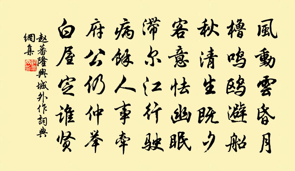 詩詞名句歷史字典書法欣賞書法字典國語詞典說文解字康熙字典古漢語字典標 題 作 者 詩 句 隆興城外作作者:趙蕃 朝代:宋代隆興城外作原文風動雲昏月,櫓鳴鷗避船。秋清生既夕,客意怯幽眠。滯爾江行駛,病餘人事牽。府公仍仲舉,白屋定誰賢。詩詞問答問:隆興城外作的作者是誰?答:趙蕃問:隆興城外作寫於哪個朝代?答:宋代趙蕃隆興城外作書法欣賞隆興城外作書法作品詩詞推薦清明黃彥平〔宋代〕去國扊扅非往事,還鄉笳鼓愧前修。十年過計千章木,一寸離心萬斛愁。次韻陳季陵主簿秋雨陳棣〔宋代〕一雨庭蕪便許涼,掃除旱魃化驕陽。微添遠水羅襟潤,已覺疏苗玉粒香。樂歲可期寬吏責,譾才無取為詩忙。蕭蕭高樓夜彈箏常建〔唐代〕高樓百餘尺,直上江水平。明月照人苦,開簾彈玉箏。山高猿狖急,天靜鴻雁鳴。曲度猶未終,東峰霞半生。繡線菊史鑄〔宋代〕天成素縷結秋深,巧刺由來不犯針。籬下工夫可絢爛,條條綰綴紫花心。小重山(柳色新)韓淲〔宋代〕點染煙濃柳色新。小桃紅映水,日初勻。露收芳徑草鋪茵。凝情久,風淡起輕塵。梁燕已爭春。折花閒伴酒,試濡送張頡仲舉知奉新王安石〔宋代〕故人為邑士多稱,繇賦寬賒獄訟平。老吏閉門無重糈,荒山開隴有新粳。方揮玉麈日邊坐,又結銅章天外行。此去遠意聯句皎然〔唐代〕家在炎州往朔方, ——疾(失姓)豈知于闐望瀟湘。 ——澄(失姓)曾經隴底復遼陽, ——巨川(失姓)更朱文靖報稱帖贊岳珂〔宋代〕勁而柔,端而遒。奔八驥,回九牛。功玉鉉,名金甌。藏此書,識前修。挽平昌戴丞二首王邁〔宋代〕倒蔗入佳境,寒花留晚香。福田三古剎,恩澤四輿梁。鶴化空華表,牛眠占吉藏。他年青與紫,恆塞桂枝堂。端午帖子皇后合五首歐陽修〔宋代〕繭館覆柔桑,新絲引更長。紉為五色縷,續壽獻君王。補樂歌十首。雲門元結〔唐代〕(《雲門》,軒轅氏之樂歌也,其義蓋言云之出,潤益萬物,如帝之德,無所不施。凡二章,章四句)玄雲溶溶兮送延陵韋少府李頻〔唐代〕延陵稱貴邑,季子有高蹤。古蹟傳多代,仙山管幾峰。微泉聲小雨,異木色深冬。去畢三年秩,新詩篋不容。鷓鴣天(壽外舅)廖行之〔宋代〕蘭谷清香入嶺梅。多根應爾暖先回。臘前似得真訊息,爭逐堯蓂十葉開。春滿室,酒盈杯。百花寧許到尊罍。仙姿排悶陸游〔宋代〕風霜九月冷颼飀,湖海飄然一布裘。親見宓羲初畫卦,轉頭三十萬春秋離天長寄周重實張耒〔宋代〕相逢握手便忘形,射策天門盡弟兄。浮世有誰尊道義,青衫自笑為功名。高談未盡胸中意,作別猶如夢後驚。半夜龍興題額宋庠〔宋代〕八法神毫煥寶題,至今鸞鵲欲驚飛。臨空莫遣流塵晦,幸有仙人拂石衣。送李璋王安石〔宋代〕湖海聲名二十年,尚隨鄉賦已華顛。卻歸甫里無三徑,擬傍胥山就一廛。朱轂風塵休悵望,青鞋雲水且留連。故人雜興十首劉克莊〔宋代〕淳熙以後紹熙前,曹馬灰寒不復燃。寧作歸來詞引避,可為勸進表求全。斜川妙語超言外,廣武狂談發酒邊。賴有寄崔之仁山人姚合〔唐代〕百門坡上住,石屋兩三間。日月難教老,妻兒乞與閒。仙經揀客問,藥債煮金還。何計能相訪,終身得在山。望江南韓琦〔宋代〕維揚好,靈宇有瓊花。千點真珠擎素蕊,一環明玉破香葩。芳艷信難加。如雪貌,綽約最堪夸。疑是八仙乘皓月,名句推薦漢水東流,都洗盡、髭鬍膏血。辛棄疾《滿江紅·漢水東流》 凡道字,重且舒。勿急疾,勿模糊。李毓秀《弟子規·信》 苔深不能掃,落葉秋風早。李白《長干行二首》 正江令恨別,庾信愁賦劉辰翁《蘭陵王·丙子送春》 詩言志,歌永言,聲依永,律和聲。佚名《尚書·虞書·舜典》 數畝荒園留我住,半瓶濁酒待君溫。蘇軾《正月二十日往岐亭郡人潘古郭三人送余於女王城東禪莊院》 時節是重陽,菊花牽恨長。徐燦《菩薩蠻·秋閨》 淥水明秋月,南湖采白蘋。李白《淥水曲》 風老鶯雛,雨肥梅子,午陰嘉樹清圓。周邦彥《滿庭芳·夏日溧水無想山作》 問相思、他日鏡中看,蕭蕭發。嚴羽《滿江紅·送廖叔仁赴闕》