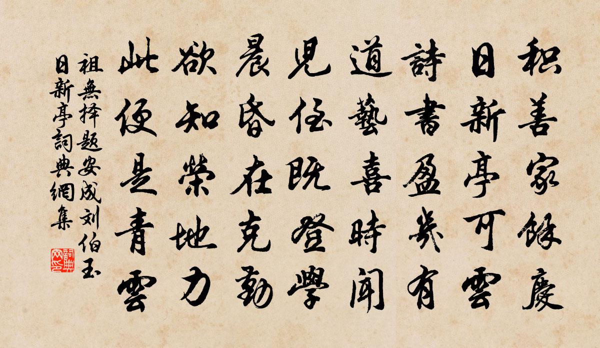 詩詞名句歷史字典書法欣賞書法字典國語詞典說文解字康熙字典古漢語字典標 題 作 者 詩 句 題安成劉伯玉日新亭作者:祖無擇 朝代:宋代題安成劉伯玉日新亭原文積善家餘慶,日新亭可雲。詩書盈幾有,道藝喜時聞。兒侄既登學,晨昏在克勤。欲知榮地力,此便是青雲。詩詞問答問:題安成劉伯玉日新亭的作者是誰?答:祖無擇問:題安成劉伯玉日新亭寫於哪個朝代?答:宋代祖無擇題安成劉伯玉日新亭書法欣賞題安成劉伯玉日新亭書法作品詩詞推薦七月七日於石〔宋代〕玉宇無塵淡月輝,誰傳織女夜停機。阮分南北任貧富,河度東西果是非。捫腹有書安用曬,揆心無巧不須祈。逢時寄題張道士招真閣李呂〔宋代〕君成道,去何許,寂寂空山號行府。自從漢末人相值,因循今莫睹。淒涼古廟落嵓隈,水繞閒庭縈嫩苔。敕令立觀水西釋文珦〔宋代〕水西多好山,山光史娛人。一重複一掩,比比如魚鱗。居來三十年,仙佛皆其鄰。魚鳥不忘情,朝暮長相親。撾世踏雲行 贈文登王志明王處一〔元代〕個個修真,人人辦道。玄機妙理須尋討。時時常*寶瓶香,朝朝每把心田掃。步步清涼,神光覆罩。十方賢聖加恩送孫太沖守懷安勾龍如淵〔宋代〕金沙春三月,桃李照城郭。石峽赬鯉魚,時時醉賓幕。贈陳隨隱杜汝能〔宋代〕父子名相繼,如君又出奇。乾坤鍾秀氣,湖海誦新詩。放鶴春風遠,橫琴夜月遲。未應隨大隱,閒過聖明時。憫農李流謙〔宋代〕秋苗掃地盡,春苗破土出。尚當積陳陳,那得有菜色。不知終年耕,未了一日食。守令民父母,賤士但挽嘿。中元徐集孫〔宋代〕今朝逢令節,依舊客殊鄉。禪衲同分席,清齋若過堂。江茶浮水色,野菜帶山香。忽憶三秋菊,誰鋤小逕荒。浣溪沙(崑山月華閣)蔡伸〔宋代〕沙上寒鷗接翼飛。潮生潮落水東西。征船鳴櫓趁潮歸。望斷碧雲無錦字,謾題紅葉有新詩。黃昏微雨倚闌時。題泐潭裴休〔唐代〕泐潭形勝地,祖塔在雲湄。浩劫有窮日,真風無墜時。歲華空自老,訊息竟誰知。到此輕塵慮,功名自可遺。寄郴守阮戶部閻孝忠〔宋代〕郴陽古名邦,四座拱山色。秀氣鍾異人,闤闠儼仙宅。端午日寄酒庶回都官余靖〔宋代〕龍舟爭快楚江濱,吊屈誰知特愴神。家釀寄君須酩酊,古今嫌見獨醒人。聞兒輩舉漁者言喜成古調錢時〔宋代〕魚固人所欲,痰飲常忌此。茲晨一杯羹,食之乃大美。漁者包裹來,樂與我為市。兒輩問何故,秤平不虧爾。吾家上元前一日陸游〔宋代〕異縣客游久,今年春事遲。峭寒增酒價,微雨惱燈欺。老態人未覺,孤愁心自知。停車呼病婦,強出伴諸兒。聞五月八日宸翰口號十首劉克莊〔宋代〕曾為元禮登龍客,亦上昭王市駿台。相與席間珠履說,此翁雖瞽有詩來。葉子山右史父宣義挽章二首呂祖謙〔宋代〕經笥深無底,高談一座傾。置身初濩落,有子晚光榮。命服鄉閭賀,安輿里巷迎。風枝何不定,忽忽到佳城。李參政生日二首魏了翁〔宋代〕湖淺霜雁寒,天高老龍蟄。悠悠瀛海間,時運遞訊息。黃鐘一龠回,槁瘁亦敷澤。茹茅趣連征,墐戶同一辟。向來壽運使芹庵〔宋代〕鵬程九萬翼方展,桃實三千花正開。再拜願伸難老頌,仙風定合繼蓬萊。感事十詩上李侍郎陳造〔宋代〕荊璞自楚寶,顧終雜土木。和氏浪三獻,一身已再辱。小儒褐衣底,磊落幾荊玉。把玩坐蓬屋,和應笑遺俗。善價華嚴塔楊蟠〔宋代〕石下有靈骨,千年生玉芝。山神每藏護,不使世人知。名句推薦萬事莫貴於義。墨子《墨子·47章 貴義》 今士之用身,不若商人之用一布之慎也。墨子《墨子·47章 貴義》 去年米貴闕軍食,今年米賤大傷農。杜甫《歲晏行》 聞道閶門萼綠華,昔年相望抵天涯李商隱《無題二首》 新年都未有芳華,二月初驚見草芽。韓愈《春雪》 步從容,立端正。揖深圓,拜恭敬。李毓秀《弟子規·謹》 遠水難救近火,遠親不如近鄰。佚名《增廣賢文·上集》 三百年間同曉夢,鐘山何處有龍盤。李商隱《詠史二首·其一》 夜來能有幾多寒,已瘦了、梨花一半。黃升《鵲橋仙·春情》 坐愁群芳歇,白露凋華滋。李白《秋思》
