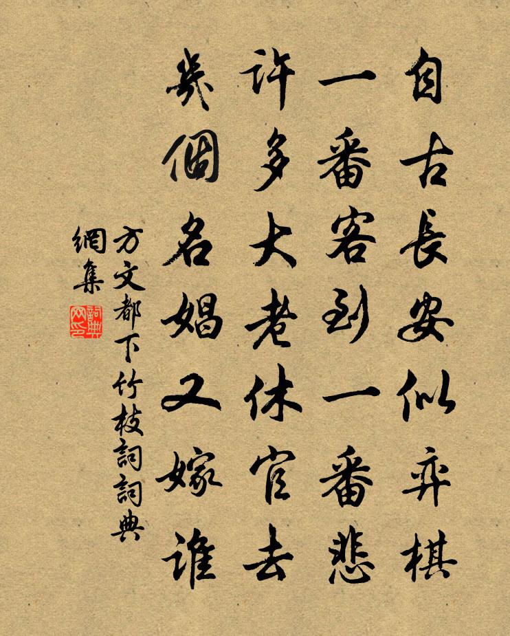 詩詞名句歷史字典書法欣賞書法字典國語詞典說文解字康熙字典古漢語字典標 題 作 者 詩 句 都下竹枝詞作者:方文 朝代:清代都下竹枝詞原文自古長安似弈棋,一番客到一番悲。許多大老休官去,幾個名娼又嫁誰?詩詞問答問:都下竹枝詞的作者是誰?答:方文問:都下竹枝詞寫於哪個朝代?答:清代方文都下竹枝詞書法欣賞都下竹枝詞書法作品詩詞推薦經秦皇墓鮑溶〔唐代〕左崗青虬盤,右坂 * 踞。誰識此中陵,祖龍藏身處。別為一天地,下入三泉路。珠華翔青鳥,玉影耀白兔。山河後園觀梅簡洪景伯曾惇〔宋代〕扶藜點檢後園梅,小雨沾滋第一回。賓客正愁花有語,拾遺只恐老相催。關心故國賞心處,愛酒暮年疏酒杯。待得老翁何應龍〔宋代〕八十昂藏一老翁,得錢長是 * 。杏花村酒家家好,莫向橋邊問牧童。清平樂 碧桃邵亨貞〔元代〕瑤笙吹罷。月滿仙台下。歌扇半欹羞淡冶。一點芳塵不惹。臨溪更洗殘妝。低回玉洞春光。換卻當時脂臉,從教惱偕陳調翁龍山買舟待夜潮發劉過〔宋代〕來逢春雨長魚苗,去見秋風擘角螯。久矣歸心到鄉國,依然水宿伴漁舠。一天如許皆明月,二客所須惟濁醪。今夜扇謝枋得〔宋代〕蒲葵也解歸掌握,紈素未應捐篋中。莫把暗塵涴明月,好驅大暑來清風。鄭元亞新居面梅開軒諸子讀書其間名曰擢英朱翌〔宋代〕紛紛百卉不須栽,一見論交正有梅。詩興已從東閣動,山寒並許北枝開。影橫窗紙月為友,香著硯屏春共來。庭下定風波元好問〔金代〕小□香來醉夢中。夢回幽賞惜匆匆。只道南枝開未半。誰喚。等閒都逐晚雲空。瀟灑小溪新雪後。唯有。蕭蕭霜葉挽許郎中陳宓〔宋代〕前輩凋零盡,如何到月湖。壯圖終未展,正論老尤孤。兩忝官聯舊,常蒙朋友呼。忽聞郎宿霣,衰淚倍沾鬢。同仲寶風雨中過德麟留宿以夜未央為韻分得未李廌〔宋代〕悲風送寒雨,遙夜俄總至。草木雖戰秋,渠能保柔脆。杯盤照青燈,喔詩久無寐。安能決雲開,坐見參橫未。秋徂碧蘆蓼花在天慶觀孔武仲〔宋代〕御水泱泱繞禁闈,碧蘆紅蓼轉相宜。玉堂金闕非人世,亦有繁華具盡時。已亥雜詩 176龔自珍〔清代〕俎膾飛沉竹肉喧,侍郎十日敞清尊。東南不可無斯樂,濡筆親題第四園。久雨無聊成雨詩呈秀叔並簡繼韓王炎〔宋代〕避濕屋多漏,怯寒窗不開。龍涎時吐霧,麈尾任生埃。獨與韋編對,誰能蠟屐來。天知蠶麥病,願喚雨師回。和邠老郎官湖懷古五首賀鑄〔宋代〕杜守王明府,吾知夫不凡。解持余酒胾,一飫逐臣饞。經過建業劉滄〔唐代〕六代興衰曾此地,西風露泣白蘋花。煙波浩渺空亡國,楊柳蕭條有幾家。楚塞秋光晴入樹,浙江殘雨晚生霞。淒涼田園樂七首·其六 / 閒居王維〔唐代〕桃紅復含宿雨,柳綠更帶朝煙。花落家童未掃,鶯啼山客猶眠。如夢令朱敦儒〔宋代〕莫恨中秋無月。多點金缸紅蠟。取酒擁絲簧,迎取輕盈桃葉。桃葉。桃葉。唱我新歌白雪。春燕朱淑真〔宋代〕檐前日暖翩翩過,簾外風輕對對斜。偏是社來還社去,年年不見臘梅花。偶成鄧肅〔宋代〕乘風花上天款天花語,天公花不怒雷公花怒。煙霄一斥下人間,豺狼旁午歸無路。欲度三吳血盈川,欲泛九江兵闇萬回寺皎然〔唐代〕萬里稱逆化,愚蠢性亦全。紫紱拖身上,妖姬安膝前。見他拘坐寂,故我是眠禪。吾知至人心,杳若青冥天。名句推薦花漸凋疏不耐風,畫簾垂地晚重工,墮階縈蘚舞愁紅孫光憲《浣溪沙·花漸凋疏不耐風》 良農不為水旱不耕,良賈不為折閱不市。荀子《荀子·修身》 笑別廬山遠,何煩過虎溪。李白《別東林寺僧》 髻子傷春慵更梳。晚風庭院落梅初。李清照《浣溪沙·髻子傷春慵更梳》 寂寂竟何待,朝朝空自歸。孟浩然《留別王侍御維 / 留別王維》 分明久旱逢甘雨,賽過他鄉遇故知。馮夢龍《醒世恆言·卷二十》 傍鄰聞者多嘆息,遠客思鄉皆淚垂。李頎《聽安萬善吹觱篥歌》 一夜嬌啼緣底事,為嫌衣少縷金華。韋莊《與小女》 樂民之樂者,民亦樂其樂;憂民之憂者,民亦憂其憂。孟子《孟子·梁惠王章句下·第四節》 夫萬事萬物之理,不外於吾心。王陽明《傳習錄·卷中·答顧東橋書》
