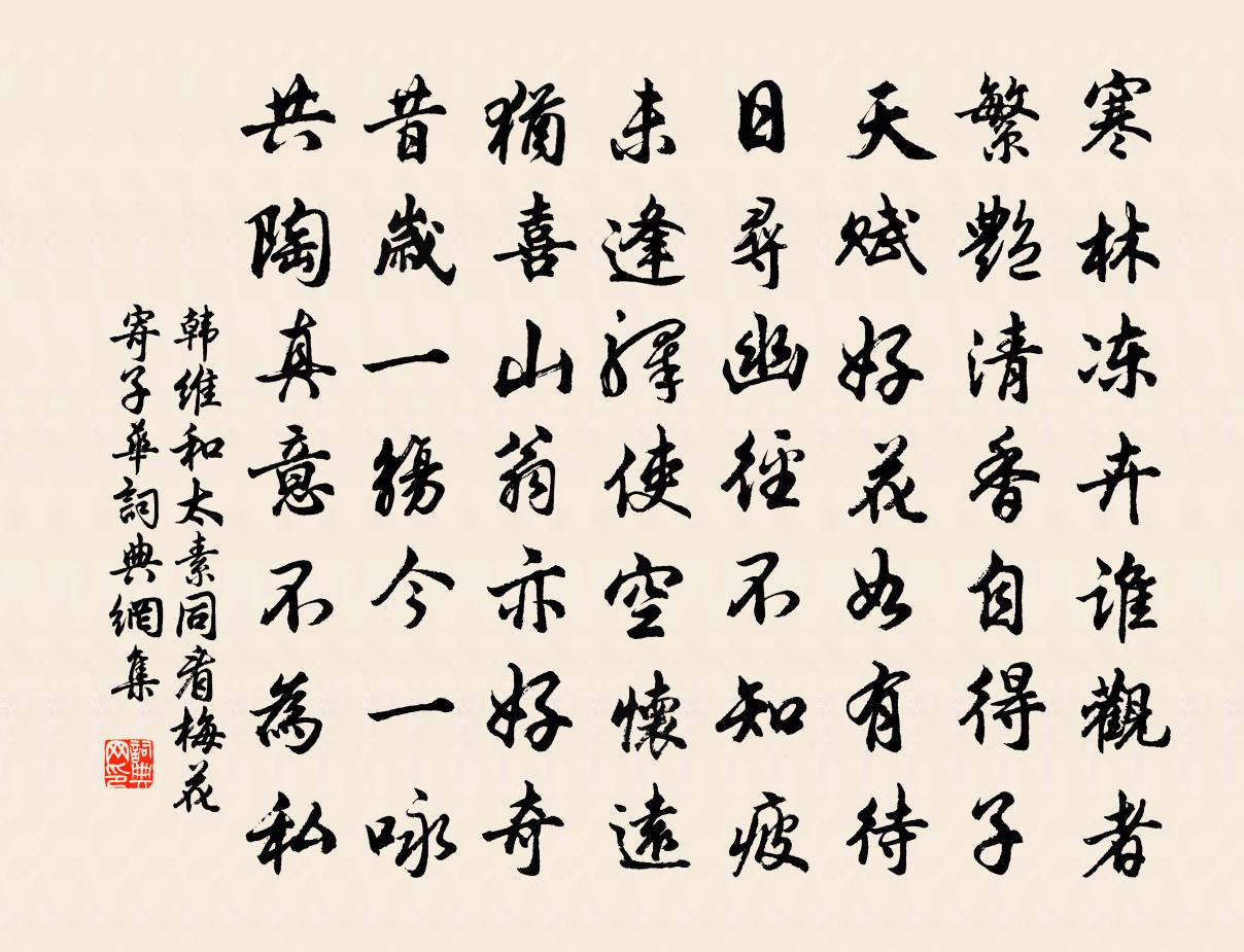 詩詞名句歷史字典書法欣賞書法字典國語詞典說文解字康熙字典古漢語字典標 題 作 者 詩 句 和太素同看梅花寄子華作者:韓維 朝代:宋代和太素同看梅花寄子華原文寒林凍卉誰觀者,繁艷清香自得子。天賦好花如有待,日尋幽徑不知疲。未逢驛使空懷遠,猶喜山翁亦好奇。昔歲一觴今一詠,共陶真意不為私。詩詞問答問:和太素同看梅花寄子華的作者是誰?答:韓維問:和太素同看梅花寄子華寫於哪個朝代?答:宋代韓維和太素同看梅花寄子華書法欣賞和太素同看梅花寄子華書法作品詩詞推薦詠梅五十首呈史尚書釋紹嵩〔宋代〕獨吟高閣對官梅,春色先從筆底回。詩到揚州定清絕,不才羞作等閒來。閒詠陸游〔宋代〕危途九折浩無津,晚幸收身作散人。俸祿既空憂患少,酒殽雖薄笑歌頻。多添布褐方知老,淨掃茆衡不覺貧。南陌送鄭尚書守建安十首彭龜年〔宋代〕春來苦雪夏來寒,南去愁霖北去乾。又報豐年無一事,乞身遠去可能安。題足軒詩朱翌〔宋代〕域中寧有一毫真,靜極方知眾妙存。疏受果能從父議,王章終不用妻言。脫身兵火蒙天幸,沃日風濤到海吞。兩頓多麗 清明上巳,同日會飲西湖壽樂園 案此首張翥〔元代〕鳳凰簫。新聲遠度蘭橈。漾東風、湖光十里,參差綠港紅橋。暖雲蘸、鬱金衫色,晴煙抹、翡翠裙腰。罨畫名園,和元汝功江皋感懷郭印〔宋代〕奸諛同一轍,舉世誰與歸。溪山有佳趣,此樂知者稀。悠然遠罾弋,魚潛鳥高飛。不作無根雲,蒼狗變白衣。使君西江月尹志平〔元代〕我愛西岩氣勢,連山帶土豐肥。青松綠柳嫩依依。更有名花異卉。春水涓涓聲細,秋陽燁燁光輝。此中不用上天梯寄吳晞遠祖秀實〔宋代〕官路聲名二十年,江鄉舊仰貳車賢。推將事業歸塵外,收得功夫到酒邊。解榻幾聞招隱士,炷香終日對韋編。公朝葉公好龍劉向〔兩漢〕葉公子高好龍,鉤以寫龍,鑿以寫龍,屋室雕文以寫龍。於是天龍聞而下之,窺頭於牖,施尾於堂。 葉公見之,禪人並化主寫真求贊釋正覺〔宋代〕身兮芭蕉,口兮葛藤。雪乞人天飯,光傳佛祖燈。機活作春像,念冷摩風棱。金針玉線兮,誰我繩繩。贈相者趙椿年曾豐〔宋代〕胸次無諸塵垢障,眼中有爾光明藏。云何不策反照動,小而用之風鑒上。伎倆君參不二門,形骸我入無色相。相逢吊盧玉堂趙汝回〔宋代〕金鑾坡上文星落,收拾遺文有幾函。草制空教生白髮,蓋棺只是著青衫。吟魂夜訪林墳木,破屋寒拋謝客岩。自有與沈十九拾遺同游棲霞寺上方於亮上人院會宿二首權德輿〔唐代〕攝山標勝絕,暇日諧想矚。縈紆松路深,繚繞雲岩曲。重樓回樹杪,古像鑿山腹。人遠水木清,地深蘭桂馥。層台十二時頌釋文準〔宋代〕日出卯,大道分明莫外討。日用縱橫在目前,逢原左右拈來草。頌古五十七首釋道昌〔宋代〕長沙似水先水,老僧自倒自起。三聖特地出頭,賣盡滿園桃李。鮮于東之晉伯之子贈詩次韻晁公溯〔宋代〕資州太守知衰懶,日日倒床惟睡濃。走送甘鮮三百顆,似君風味喜相逢。漁家傲(戊寅冬,以病告臥潛玉,時時策杖寒秀亭下,作漁家傲三首)毛滂〔宋代〕年少莫尋潛玉老。無才無藝煩君笑。暖過茅檐霜日曉。休起早。竹間盡日無人到。別徑小峰孤碧峭。曲溝淺浸寒清丹丘道中寄錢大資二首釋道舉〔宋代〕溪橋人度柳青蔥,困臥羈孤雪鬢翁。鷺宿煙沙晴復暖,雞鳴茅店雨連風。早年史冊書名節,晚歲燕然妙勒功。急詔酬和元九東川路詩十二首。江上笛白居易〔唐代〕江上何人夜吹笛,聲聲似憶故園春。此時聞者堪頭白,況是多愁少睡人。山夜聞鍾張說〔唐代〕夜臥聞夜鍾,夜靜山更響。霜風吹寒月,窈窕虛中上。前聲既舂容,後聲復晃蕩。聽之如可見,尋之定無像。信知名句推薦故人何在,煙水茫茫。柳永《玉蝴蝶·望處雨收雲斷》 霸業成空,遺恨無窮。查德卿《蟾宮曲·懷古》 動人以行不以言,應天以實不以文,故我清靜而人自正。房玄齡《晉書·帝紀·第六章》 智欲圓而行欲方,膽欲大而心欲小。程登吉《幼學瓊林·卷三·人事》 蕃漢斷訊息,死生長別離。張籍《沒蕃故人》 行違神祇,天則罰之;禮義有愆,夫則薄之。范曄《後漢書·列傳·列女傳》 憶君迢迢隔青天,昔日橫波目,今作流淚泉。李白《長相思·其二》 池花春映日,窗竹夜鳴秋。李白《謝公亭·蓋謝朓范雲之所游》 青楓江上秋帆遠,白帝城邊古木疏。高適《送李少府貶峽中王少府貶長沙》 九日黃花酒,登高會昔聞。岑參《奉陪封大夫九日登高》