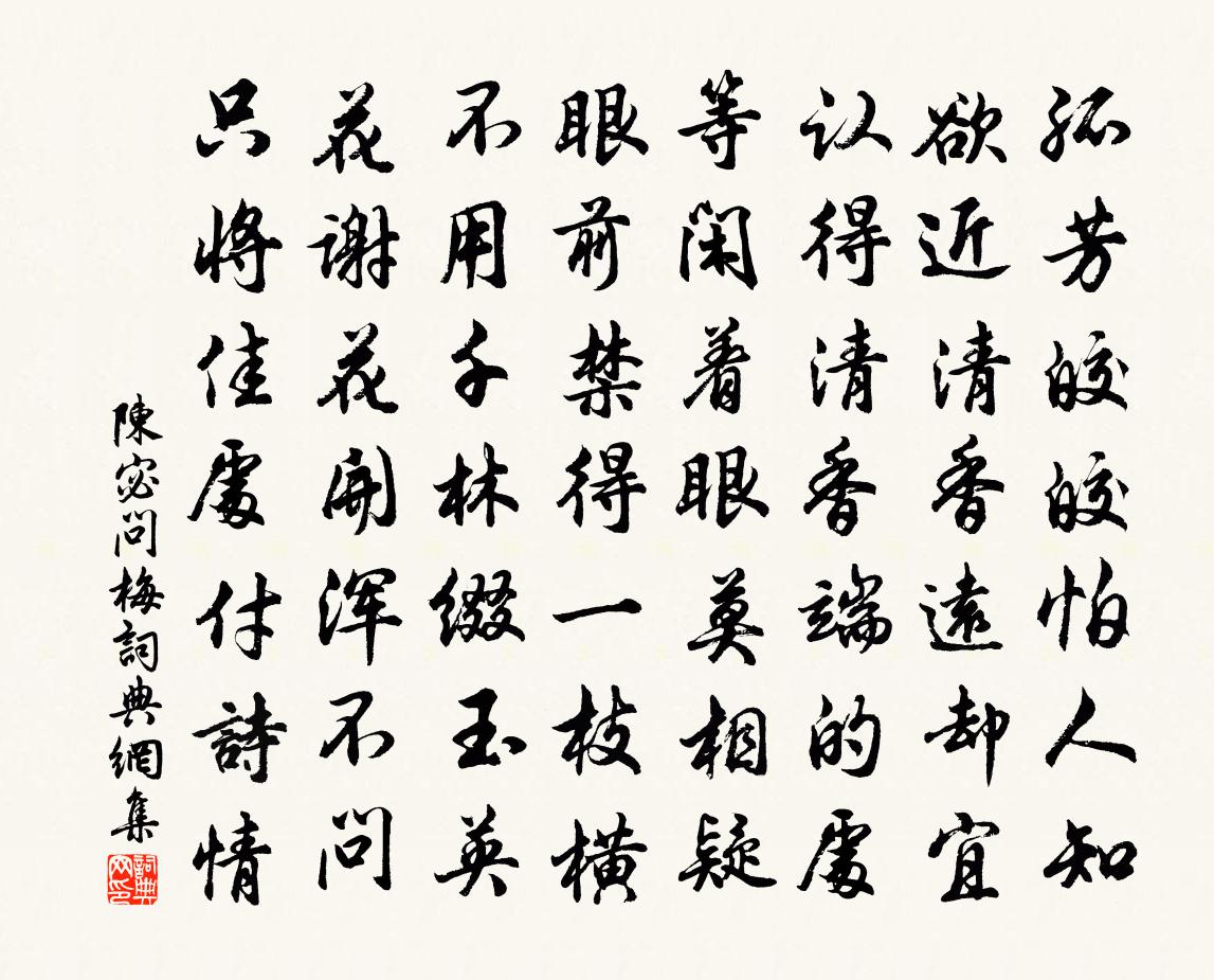 詩詞名句歷史字典書法欣賞書法字典國語詞典說文解字康熙字典古漢語字典標 題 作 者 詩 句 問梅作者:陳宓 朝代:宋代問梅原文孤芳皎皎怕人知,欲近清香遠卻宜。認得清香端的處,等閒著眼莫相疑。眼前禁得一枝橫,不用千林綴玉英。花謝花開渾不問,只將佳處付詩情。詩詞問答問:問梅的作者是誰?答:陳宓問:問梅寫於哪個朝代?答:宋代陳宓問梅書法欣賞問梅書法作品詩詞推薦孫發百篇將游天台請詩贈行,因以送之皮日休〔唐代〕孫子荊家思有餘,元戎曾薦入公車。百篇宮體喧金屋,一日官銜下玉除。紫府近通齋後夢,赤城新有寄來書。因逢前調(詠鴛鴦菊、雙心而白、秋晚始開)楊冠卿〔宋代〕金蕊飄殘。江城秋晚,月冷霜寒。一種幽芳,雕冰鏤玉,舞鳳翔鸞。悠然靜對南山。笑瓊沼、鴛飛翠瀾。小玉驚呼追思柳惲汀洲之詠尚有遺妍因書一絕寇準〔宋代〕杳杳煙波隔千里,白蘋香散東風起。日落汀洲一望時,愁情不斷如春水。再和鄭清之〔宋代〕雪意賈寒欺酒力,思婦懶學回文織。屏山未命篆痕銷,笑倩南枝陪燕息。冰紈絳蠟入縴手,素臉殷跗未真識。兒痴石上藤(得上字)岑參〔唐代〕石上生孤藤,弱蔓依石長。不逢高枝引,未得凌空上。何處堪託身,為君長萬丈。第一百九十九卷秋興陸游〔宋代〕節物毛喜更新,毛清秋最可毛人。徐行毛曳藤杖,小立岸紗巾。煙雨迷衰草,汀洲老百苹。鶴巢時托宿,猿果每分贈瑕丘王少府李白〔唐代〕皎皎鸞鳳姿,飄飄神仙氣。梅生亦何事,來作南昌尉。清風佐鳴琴,寂寞道為貴。一見過所聞,操持難與群。毫揮水調歌頭 憶法眷伯瑜老姬翼〔元代〕相遇會心友,目擊契金蘭。登天游霧莫逆,雞黍不相干。常記岩岩亭下,俯瞰茫茫滄海,揮塵笑談間。霞卷鎮陽北次雨中暖房韻洪皓〔宋代〕首夏霜淫似早秋,坐邀車馬愧無由。提壺見就傾三爵,具饌何嘗選百羞。剛道暖房排旅悶,實圖求友慰幽囚。言歸圓通師孫福長老請贊釋心月〔宋代〕虛空寥寥,吾之體也。萬象紜紜,吾之用也。青山白雲,吾之賓朋也。山色溪聲,吾之言論也。作是說者,畫師之和子華兄同永叔飲三班官舍兼約明日飲永叔家韓維〔宋代〕視草名臣潤色才,玉墀晨退共徘徊。朝廷無事文書省,台閣相歡笑語開。少厭賡酬停落筆,旋尋歌舞約銜杯。廣文所思馮去非〔宋代〕雁自飛飛水自流,西風不寄小銀鉤。斜陽何處橫孤簟,十二闌乾一樣愁。木犀方岳〔宋代〕葉葉寒清粟粟黃,何年月斧落吳剛。秋風誤到人間世,幽壑難藏天上香。渺立塵氛群玉府,獨餐沆瀣碧雲鄉。生來二疊劉克莊〔宋代〕漢魏諸賢韻已卑,六朝人物復何為。平生老子羞由徑,不識蟲兒與玉兒。謝康使君見訪示詩觀奕慶之方回〔宋代〕妙年曾到鳳凰池,五馬能臨六枳籬。量淺最難勝潢酒,著低何敢抗高棋。森嚴法度蠶頭字,瘦硬丰標鶴膝詩。自笑游長安諸寺聯句。長樂坊安國寺。紅樓聯句(隱侯體)段成式〔唐代〕重疊碎晴空,餘霞更照紅。蟬蹤近鳷鵲,鳥道接相風。 ——張希復苔靜金輪路,雲輕白日宮。壁杖錫山別前人陳著〔宋代〕結約登臨百里深,流連風雨一窗陰。新寒鐙火照清夢,絕靜山林生古音。此日與君相別處,有天知我不言心。歸途句諶祜〔宋代〕術豈有靈能起死,夢從何處忍忘歸。春晚緩步臥龍始盡見此山全體錢時〔宋代〕老眼山林自是宜,臥龍春晚夕陽遲。芒鞋竹杖經行遍,絕勝籃輿喝道時。胡笳十八拍第十四拍劉商〔唐代〕莫以胡兒可羞恥,恩情亦各言其子。手中十指有長短,截之痛惜皆相似。還鄉豈不見親族,念此飄零隔生死。南風名句推薦朝雲亂人目,帝女湘川宿。吳均《登二妃廟》 辭之待骨,如體之樹骸;情之含風,猶形之包氣。劉勰《文心雕龍·風骨》 君子泰而不驕,小人驕而不泰。孔子弟子《論語·子路篇》 喪不過三年,示民有終也。孔子及其弟子《孝經·喪親》 春風不解禁楊花,蒙蒙亂撲行人面。晏殊《踏莎行·小徑紅稀》 舟非水不行,水入舟則沒佚名《孔子家語·六本》 紅樹青山日欲斜,長郊草色綠無涯。歐陽修《豐樂亭遊春·其三》 無人調護,自去經心。沈復《浮生六記·閨房記樂》 同心而離居,憂傷以終老。佚名《涉江采芙蓉》 是非成敗轉頭空。楊慎《臨江仙·滾滾長江東逝水》