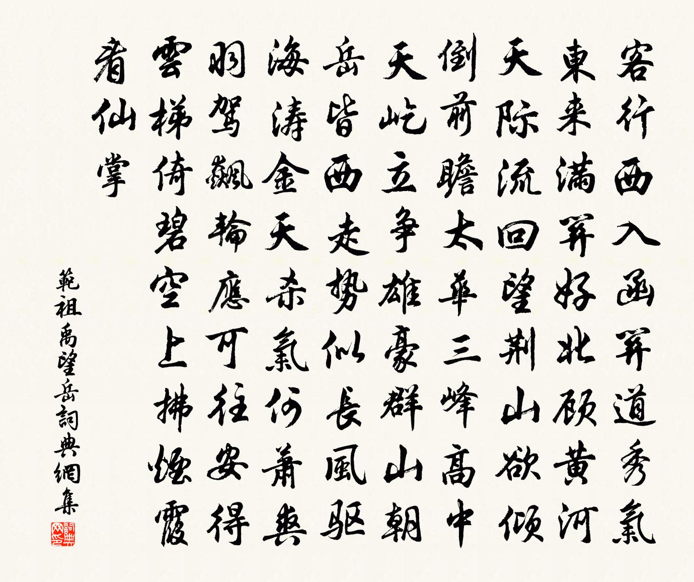 詩詞名句歷史字典書法欣賞書法字典國語詞典說文解字康熙字典古漢語字典標 題 作 者 詩 句 望岳作者:范祖禹 朝代:宋代望岳原文客行西入函關道,秀氣東來滿關好。北顧黃河天際流,回望荊山欲傾倒。前瞻太華三峰高,中天屹立爭雄豪。群山朝岳皆西走,勢似長風驅海濤。金天殺氣何蕭爽,羽駕飆輪應可往。安得雲梯倚碧空,上拂煙霞看仙掌。詩詞問答問:望岳的作者是誰?答:范祖禹問:望岳寫於哪個朝代?答:宋代范祖禹望岳書法欣賞望岳書法作品詩詞推薦春情四首高翥〔宋代〕深院沈沈照落暉,寶香熏徹舊時衣。一春行樂誰為伴,羞見花前蛺蝶飛。十二時頌釋文準〔宋代〕日入酉,淨室夢香孤坐久。忽然月上滿東窗,照我床頭瑞香斗。賦得送賈島謫長江李洞〔唐代〕敲驢吟雪月,謫出國西門。行傍長江影,愁深汨水魂。筇攜過竹寺,琴典在花村。飢拾山松子,誰知賈傅孫。相和歌辭長門怨沈佺期〔唐代〕月皎風冷冷,長門次掖庭。玉階聞墜葉,羅幌見飛螢。清露凝珠綴,流塵下翠屏。妾心君未察,愁嘆劇繁星。紫霄觀陳宗禮〔宋代〕平陂復峻坂,曲折勞攀躋。中道忽孤絕,恍然遇安期。授以度世術,呼吸隨風飛。長跪受隱文,三復嘆且疑。變化商人吳融〔唐代〕百尺竿頭五兩斜,此生何處不為家?北拋衡岳南過雁,朝發襄陽暮看花。蹭蹬也應無陸地,團圓應覺有天涯。隨風滿庭芳 和芝陽靈元子衛信道韻馬鈺〔元代〕放懶生涯,欣慵活計,起心念念慈悲。而今不肯,摘葉更尋枝。撇下之乎者也,的端認、蓮出青泥。閒閒里,捫心舜祠送桂林友人樂雷發〔宋代〕堯山分手舜山逢,呼酒旗亭兩鬢蓬。客思且須論契闊,詩交應不計窮能。兒曹富貴秋煙外,前輩風流落葉中。明日六嘆(集已載三首)李涉〔唐代〕蓬萊島邊採珠客,西望人寰星漢隔。千重疊浪聳雲高,萬里平沙連月白。海中洞穴尋難極,水底鮫人半相識。玄蚌遐水謠溫庭筠〔唐代〕天兵九月渡遐水,馬踏沙鳴驚雁起。殺氣空高萬里情,塞寒如箭傷眸子。狼煙堡上霜漫漫,枯葉號風天地乾。犀帶春雪陳著〔宋代〕夜來風雪借冬威,不是東君喜弄奇。也怕春濃花易過,故將寒力頓花期。賀李昉范質〔宋代〕翰苑重求李謫仙,詞鋒穎利勝龍泉。朝趨建禮霞烘日,夜直承明月印天。聖主重知緣國士,相公多喜為同年。青春三月一日入襄州界先寄吳待制二首項安世〔宋代〕明德宮中大練衣,風流小阮世人知。斷無流水游龍夢,只有珊瑚碧樹詞。天上仙人持紫橐,邊頭武吏簸紅旗。男兒外兄施伯侃下第赴並門叔父招梅堯臣〔宋代〕共是乾時者,同為失意人。言趨太原召,如忍宛陵親。笳鼓聽臨塞,琴書未離身。別君無斗酒,當識士安貧。正月二十四日雨霰交作趙蕃〔宋代〕杏花燒空紅欲然,柳色亦復青可憐。胡為雨霰忽交作,已洗破衾還被綿。去冬梅時雪復雪,未省好看冰玉潔。只今代白髮答王安石〔宋代〕從衰得白自天機,未怪長青與願違。看取春條隨日長,會須秋葉向人稀。春中司空圖〔唐代〕伏溜侵階潤,繁花隔竹香。嬌鶯方曉聽,無事過南塘。送三八弟歸九江王遂〔宋代〕堂堂襄敏公,揚旌上熙河。竹帛有時盡,勳業誰能磨。珍重紫陽翁,一言定群訛。世德遠如此,吾曹當若何。十二月二十四日西樓觀雪范成大〔宋代〕一夜珠簾不下鉤,徹明隨雪上西樓。瑤池萬頃崑崙近,玉壘千峰滴博收。已報春回南畝潤,從教寒勒北枝愁。四筵茅屋舒岳祥〔宋代〕茅屋不稱意,清冷照此心。白鷗波萬頃,黃鳥樹千岑。檐蔔炎天雪,蒲萄千日陰。舊來須此物,隘巷若為尋。名句推薦芳樹籠秦棧,春流繞蜀城。李白《送友人入蜀》 雨恨雲愁,江南依舊稱佳麗。王禹偁《點絳唇·感興》 知章騎馬似乘船,眼花落井水底眠杜甫《飲中八仙歌》 少年射虎名豪,等閒赤羽千夫膳元好問《水龍吟·從商帥國器獵於南陽同仲澤鼎玉賦此》 桑野就耕父,荷鋤隨牧童。孟浩然《田家元日》 枕上十年事,江南二老憂,都到心頭。徐再思《水仙子·夜雨》 夸而有節,飾而不誣劉勰《文心雕龍·誇飾》 空獨倚東風,芳思誰寄。周密《繡鸞鳳花犯·賦水仙》 馬者,所以命形也;白者,所以命色也。公孫龍《公孫龍子·白馬論》 火形嚴,故人獻灼;水形懦,人多溺。韓非及後人《韓非子·內儲說上七術》