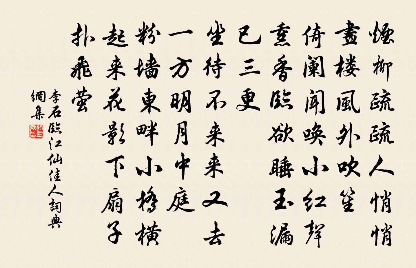 這首《臨江仙·佳人》是描寫了月夜下少婦的情態的。詞一開頭就寫出特定環境中的特定的人 :“煙柳疏疏人悄悄,畫樓風外吹笙 。”疏疏落落的柳樹掩映下,有一座畫樓 ,樓上住著佳人,周圍靜悄悄地,只聞有人在吹笙,——當然是這位佳人。按距離觀察的,所以笙聲似由“ 風外”傳來。“笙”是一種簧管樂器,可奏出哀怨的音調 。南唐中主李璟的《 山花子》詞,寫婦女思念遠出的丈夫,午夜夢回,獨自吹笙,倍感淒涼,中有句雲 :“細雨夢回雞塞遠,小樓吹徹玉笙寒;多少淚珠何限恨,倚闌乾 。”這首詞中的“ 佳人”,身份與李璟筆下的這位婦女並不相同,但因思念所愛而“ 小樓吹徹玉笙寒”、來抒發心中哀怨的做法 ,是相似的。“倚欄聞喚小紅聲”句的“倚欄”,與李璟詞中的“ 倚闌乾”心境相似。雖然不一定流著簌簌的淚珠 。她吹罷了笙 ,倦倚欄桿;一會兒 ,她低聲呼喚侍兒小紅。“薰香臨江睡,玉漏已三更。”是讓侍從小紅去為她薰香整被,因為夜已深了,她想去睡覺了 。古代富貴人家婦女多用香料熏被子,猶如今日的灑上一點香水,感到舒爽而易入睡 。《西廂記》寫鶯鶯由於對張生思念,而難以入睡,對紅娘唱道:“翠被生寒壓繡裀,休將蘭麝熏。將蘭麝熏盡,則索自溫存”,由反面可見此點。這上片以時間為順序,寫了畫樓上佳人的吹笙、倚欄、喚侍兒熏被,純粹是外部動作,沒有絲毫的心理描寫;但主人公的情懷是那么淒涼哀怨,依然透紙而出。