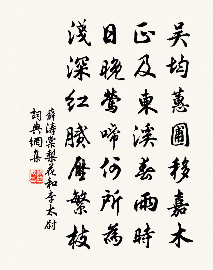 詩詞名句歷史字典書法欣賞書法字典國語詞典說文解字康熙字典古漢語字典標 題 作 者 詩 句 棠梨花和李太尉作者:薛濤 朝代:唐代棠梨花和李太尉原文吳均蕙圃移嘉木,正及東溪春雨時。日晚鶯啼何所為,淺深紅膩壓繁枝。詩詞問答問:棠梨花和李太尉的作者是誰?答:薛濤問:棠梨花和李太尉寫於哪個朝代?答:唐代薛濤棠梨花和李太尉書法欣賞棠梨花和李太尉書法作品注釋全唐詩:卷803-29詩詞推薦次王照鄰韻二首趙蕃〔宋代〕長年未省厭長病,一暑方憎又一春。把卷頗思親玉雪,出門無好壞苦埃塵。喜山鵲初歸三首司空圖〔唐代〕翠衿紅觜便知機,久避重羅穩處飛。只為從來偏護惜,窗前今賀主人歸。山中只是惜珍禽,語不分明識爾心。若使蝶戀花(春風一夕浩蕩,曉來柳色一新)程垓〔宋代〕寒意勒花春未足。只有東風,不管春拘束。楊柳滿城吹又綠。可人青眼還相屬。小葉星星眠未熟。看盡行人,唱徹成都運司西園亭詩海棠軒許將〔宋代〕海棠冠蜀花,此軒花尤冠。紅雲簇蕊細,淥水照葉嫩。倚妝宮粉聚,疊綺霞光散。雨淚點春風,應懷上林怨。彩雲歸·蘅皋向晚艤輕航柳永〔宋代〕蘅皋向晚艤輕航。卸雲帆、水驛魚鄉。當暮天、霽色如晴晝,江練靜、皎月飛光。那堪聽、遠村羌管,引離人斷腸沿檄舟行出五雲關喻良能〔宋代〕畫舫朱簾出曉關,便風飛過幾重灣。路經僧舍漁村畔,身在煙霏霧靄間。驚浪沸晴輸遠浦,亂雲拖粉露崇山。偶因寄趙賓暘二首方回〔宋代〕秀亭山下舊吾廬,十二年鄰長者居。近別復經三換歷,相疏不寄一行書。諸郎已了婚姻未,所至堪憐盜賊余。老我【中呂】紅繡鞋馮子振〔元代〕題小山蘇堤漁唱東里先生酒興,南州高士文聲,玉龍嘶斷彩鸞鳴。水空秋月冷,山小暮天青,蘇公堤上景。以詩句詠梅疎影橫斜水清淺方蒙仲〔宋代〕甚處足橫斜,孤山水一涯。從來箇中水,只許照梅花。冬日齋中即事陸游〔宋代〕夙興人尚默,眾鳥相與言。小語豈不可,何至爾啾喧。吾獨擁燎爐,宿火有餘溫。澹然以自適,喧寂何足論!次韻招飯不赴陳造〔宋代〕吏能儒業實慚名,晚喜論交蓋代英。千里久勞魂夢往,一歡猶阻咄嗟成。粲花論勝違頻聽,擊缽詩工況莫京。別後鷓鴣天(續採蓮曲)葉夢得〔宋代〕曉日初開露未晞。夕煙輕散雨還微。暗搖綠霧游鯈戲,斜映紅雲屬玉飛。情脈脈,恨依依。沙邊空見棹船歸。何人和史司直韻五首吳潛〔宋代〕世閒傳假不傳真,丞相可曾城換銀。巷掃他家難敵富,氅披之子未為貧。也知東郡行春守,便作南溪釣雪人。指碔秋日寄華陽山人高蟾〔唐代〕雲木送秋何草草,風波凝冷太星星。銀鞍公子魂俱斷,玉弩將軍涕自零。茅洞白龍和雨看,荊溪黃鵠帶霜聽。人間關山月儲光羲〔唐代〕一雁過連營,繁霜覆古城。胡笳在何處,半夜起邊聲。歲暮感懷以餘年諒無幾休日愴已迫為韻陸游〔宋代〕家世本無年,甲子近一周;小子獨何幸,七十今平頭。往者收朝跡,亟欲求歸休,厚恩許奉祠,得祿歲愈優。三釜聞高舍人錫下世潘閬〔宋代〕早掌綸言世盡知,豈期謫宦至於斯。生前是客能投卷,死後何人為撰碑。才佞萬端應已矣,文章千古恐無之。野夫題花光梅十首淡中有味王柏〔宋代〕一丘一壑似夷齊,勁雪繁霜特立時。瘦影橫斜清峭峭,世間幾個赴心期。醉和范景仁賦子華東軒樹次其韻梅堯臣〔宋代〕樹影落東牆,影微人已醉。休看枝上綠,但對眉間翠。又登碧雲亭感懷三十首吳芾〔宋代〕晚上危亭憶隱居,高情逸氣古人無。橫山只有精廬在,無復書堂舊藥爐。名句推薦守身不敢妄為,恐貽羞於父母王永彬《圍爐夜話·第三四則》 舉頭紅日近,回首白雲低。寇準《詠華山》 塵中見月心亦閒,況是清秋仙府間。劉禹錫《八月十五夜桃源玩月》 筆落驚風雨,詩成泣鬼神杜甫《寄李十二白二十韻》 憶君遙在瀟湘月,愁聽清猿夢裡長。王昌齡《送魏二》 天道之數,至則反,盛則衰。管仲《管子·重令》 夢裡不知身是客,一晌貪歡。李煜《浪淘沙令·簾外雨潺潺》 笙歌散後酒初醒,深院月斜人靜。司馬光《西江月·寶髻松松挽就》 捲地風來忽吹散,望湖樓下水如天。蘇軾《六月二十七日望湖樓醉書》 精於物者以物物,精於道者兼物物。荀子《荀子·解蔽》