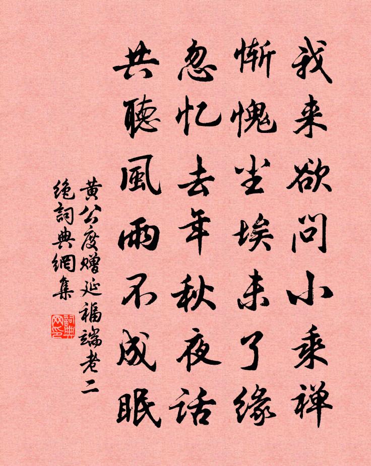 詩詞名句歷史字典書法欣賞書法字典國語詞典說文解字康熙字典古漢語字典標 題 作 者 詩 句 贈延福端老二絕作者:黃公度 朝代:宋代贈延福端老二絕原文我來欲問小乘禪,慚愧塵埃未了緣。忽憶去年秋夜話,共聽風雨不成眠。詩詞問答問:贈延福端老二絕的作者是誰?答:黃公度問:贈延福端老二絕寫於哪個朝代?答:宋代黃公度贈延福端老二絕書法欣賞贈延福端老二絕書法作品詩詞推薦寄同年宗兄桐江府判去言五首方回〔宋代〕好山多處說嚴陵,官事閒時定一登。野寺豈無僧十百,愛僧須是愛詩僧。奉酬魯望見答魚箋之什皮日休〔唐代〕輕如隱起膩如飴,除卻鮫工解制稀。欲寫恐成河伯詔,試裁疑是水仙衣。毫端白獺脂猶濕,指下冰蠶子欲飛。若用憶秦娥万俟詠〔宋代〕天如洗。金波冷浸冰壺裡。冰壺裡。一年得似,此宵能幾。等閒莫把欄乾倚。馬蹄去便三千里。三千里。幾重雲岫次韻清虛喜子瞻得常州黃庭堅〔宋代〕喜色侵淫動搢紳,俞音下報謫仙人。驚回汝水間關夢,乞與江天自在春。罨畫初游冰欲泮,浣花何處月還新。涼州梅花喜神譜欲謝一十六枝宋伯仁〔宋代〕春透水波明,江湖從落魄。三十六鱗成,禹門看一躍。木蘭花(月下)莫將〔宋代〕暗香浮動黃昏後。更是月明如白晝。看來都坐玉壺冰,折贈徐妃丹桂手。賞酬風景無過酒。對影成三誰左右。勸君為農陳杰〔宋代〕去國已為農,憂時但願豐。目光牛背上,世呈草廬中。絕異炰羔惲,聊如藝黍通。新來詩亦變,稍稍近豳風。即事五首王安石〔宋代〕遮莫鄰雞下五更,願為閒客此閒行。欲知前面花多少,顛倒青苔落絳英。初二日復雨偶成趙蕃〔宋代〕秋旱連冬勢未平,何斯小雨趁元正。休論忽忽生為樂,且對欣欣木向榮。已分終身樂貧賤,自無岐路覓功名。獨於五鼓乘風過洞庭湖日高已至廟下作詩三篇孔武仲〔宋代〕北風投曉漸雄豪,椎鼓車帆十丈高。枕底洞庭三百里,臥聽天樂音業嘈。次韻羅端規二首張鎡〔宋代〕世態從渠變,前山只麽新。關門便懶退,遇事少躬親。和我詩何益,知公道不貧。兩旬才識面,枉是自由身。減字木蘭花沈瀛〔宋代〕且安汝止。快活心中惟法喜。一處通風。萬別千差處處通。腐腸是酒。伐性蛾眉徒損壽。詩到陰何。剗地亂絲頭緒覽鏡書懷李白〔唐代〕得道無古今,失道還衰老。自笑鏡中人,白髮如霜草。捫心空嘆息,問影何枯槁。桃李竟何言,終成南山皓。拈古十四首釋法薰〔宋代〕這老漢,手頭短。靈隱即不然,見成公案,與汝三十棒。知樞密院孫溫靖公輓辭二首蘇頌〔宋代〕疇昔逍遙曳杖時,鑾輿臨哭從官悲。三朝弼亮推公望,一品哀榮厚葬儀。陪幄謀猷存故事,出藩慈惠有餘思。伯喈句田農夫〔宋代〕桃李場中已免參,只將農輔繁頭術。贈隱僧釋文珦〔宋代〕高僧成獨往,古路少人過。切柏貞心在,看山靜意多。清鍾生響答,空翠與雲和。不解相隨住,其如白髮何。李中令輓詞二首宋祁〔宋代〕家賜齊侯履,人推卻縠文。結婚榮外館,謀帥得中軍。盛集追園蓋,遒章托隴雲。不圖新渚畔,更作死生分。頌古一○一首釋子淳〔宋代〕故國清平久有年,白頭猶自戀生緣。牧童卻解忘功業,懶放牛兒不把鞭。祖逖徐鈞〔宋代〕慷慨才能立志堅,計謀端可定中原。晉元倘使圖經略,事業韓彭可比肩。名句推薦忽憶故人今總老。貪夢好。茫然忘了邯鄲道。王安石《漁家傲·平岸小橋千嶂抱》 相逢不用忙歸去,明日黃花蝶也愁。蘇軾《九日次韻王鞏》 今日漢宮人,明朝胡地妾。李白《王昭君二首》 山荒聊可田,錢鎛還易辦。王守仁《謫居糧絕請學於農將田南山詠言寄懷》 清明又近也,卻天涯為客。曹組《憶少年·年時酒伴》 人生自古誰無死?留取丹心照汗青。文天祥《過零丁洋》 深居俯夾城,春去夏猶清。李商隱《晚晴》 樓上幾日春寒,簾垂四面,玉闌乾慵倚。李清照《念奴嬌·春情》 空將漢月出宮門,憶君清淚如鉛水。李賀《金銅仙人辭漢歌》 世有伯樂,然後有千里馬。千里馬常有,而伯樂不常有。韓愈《雜說四·馬說》