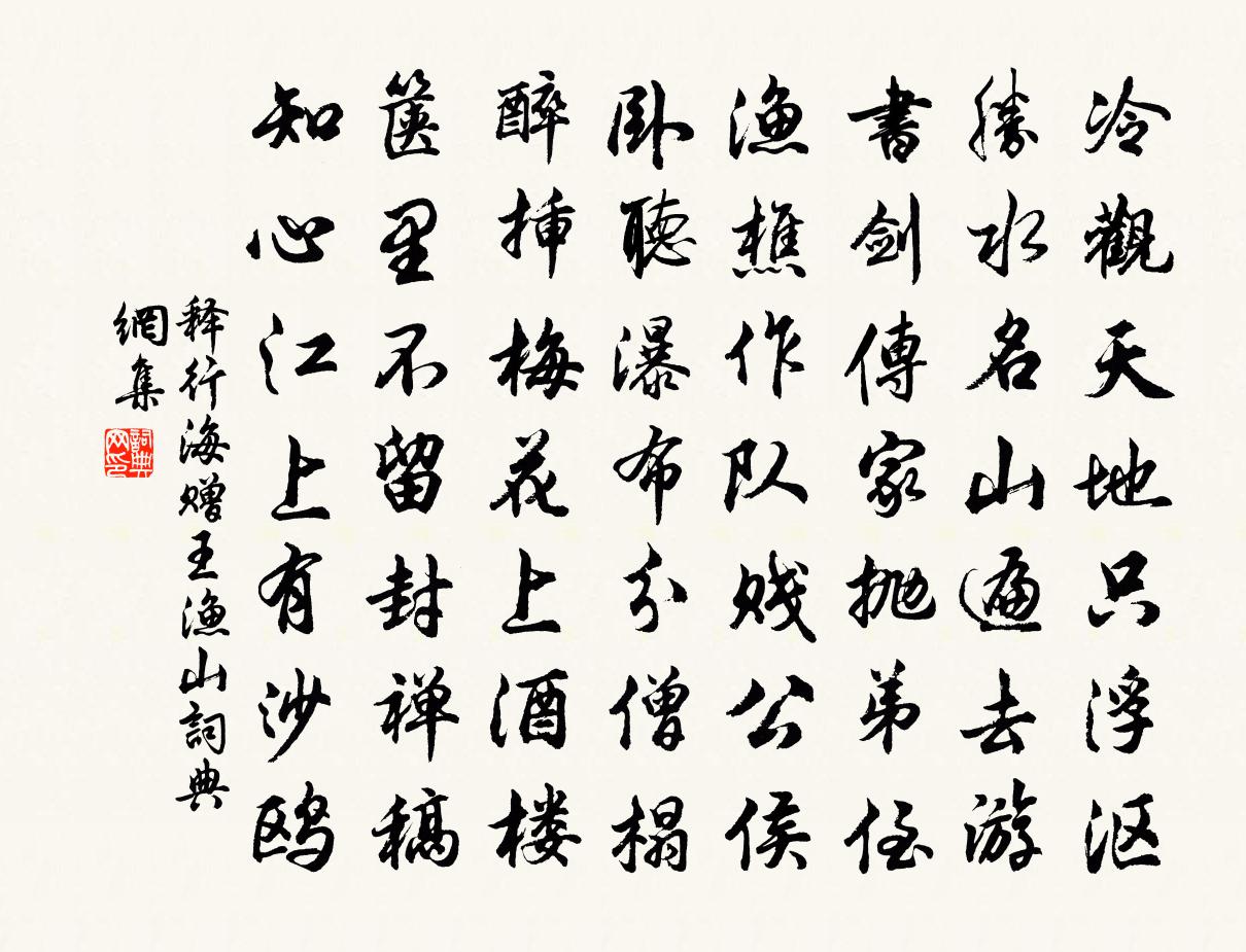 詩詞名句歷史字典書法欣賞書法字典國語詞典說文解字康熙字典古漢語字典標 題 作 者 詩 句 贈王漁山作者:釋行海 朝代:宋代贈王漁山原文冷觀天地只浮漚,勝水名山遍去游。書劍傳家拋弟侄,漁樵作隊賤公侯。臥聽瀑布分僧榻,醉插梅花上酒樓。篋里不留封禪稿,知心江上有沙鷗。詩詞問答問:贈王漁山的作者是誰?答:釋行海問:贈王漁山寫於哪個朝代?答:宋代釋行海贈王漁山書法欣賞贈王漁山書法作品詩詞推薦題釣台對嚴氏樓三首滕岑〔宋代〕秋江不許一塵染,只有青山倒影寒。我欲移家來住此,煩君先為斬魚竿。思山居一十首初夏有懷山居李德裕〔唐代〕山中有所憶,夏景始清幽。野竹陰無日,岩泉冷似秋。翠岑當累榭,皓月入輕舟。只有思歸夕,空簾且夢遊。擬水西寺東峰亭九詠陰崖竹梅堯臣〔宋代〕背嶺斷崖下,老竹生扶疏。孤根石上引,勁節松不如。莫言霜雪多,終見綠有餘。龍華山寺寓居十首王之望〔宋代〕杜宇來何處,天涯又復鳴。空山聽更激,寒夜窈難明。故國三千里,春風第一聲。年年羇旅地,愁絕不勝情。七絕句羅公升〔宋代〕賈生空痛哭,漢吏孰分憂。謾倚天為命,天命不自由。過水西渡洪亮吉〔清代〕已作如塵似夢看,殘春曾此一停鞍。能迎三十年前客,只有參天竹萬竿。題永寧小軒釋曇華〔宋代〕我行重到清涼地,小室軒窗分外明。不是山家占春色,大都物理自舒情。題謝氏一勺軒楊維楨〔元代〕一勺水,不滿斗。我吸之,勺在手。上連天津尾,下泄海焦口。主人飲,小池鑿;吾蔀青,天納牖。吾鐵崖道人韙曉晴發黃杜驛二首楊萬里〔宋代〕巷竹欹將倒,林花濕不飛。總將枝上雨,灑入轎間衣。晴色猶全嫩,春寒肯便歸。秪能欺客子,戶戶閉荊扉。阮客武衍〔宋代〕粉靨嬌春掌上輕,玉琴聲里見深情。花邊臨別重回首,猶恐絲弦說未明。偈頌一百零二首釋慧遠〔宋代〕黃面瞿曇,雖則分疏應口。車不橫推,文殊仗劍逼佛。愁蕊香(木樨)趙以夫〔宋代〕一夜金風,吹成萬粟,枝頭點點明黃。扶疏月殿影,雅澹道家裝。阿誰倩、天女散濃香。十分熏透霓裳。徘徊處,禪人並化主寫真求贊釋正覺〔宋代〕默默靈光,堆堆坐忘。衲僧事業,宗印文章。應物空三世,隨緣遍十方。分身不用相回互,到處誰能作覆藏。巍巍鬥雞石陳岩〔宋代〕未悟雄冠死結纓,昂然對峙只徒爭。山頭化作千年石,盛氣飛憍不再萌。游善權洞二首陳襄〔宋代〕陰陽融結此山川,便有鹽堆與石田。風俗每來占水旱,即疑乾洞有神仙。句裴次元〔唐代〕積高依郡城,迥拔凌霄漢。登壇作趙善括〔宋代〕一壇橫壓紺天低,好向雲端覲紫微。林鶴慣聞鑫磬舞,煙鸞疑認玉台飛。步虛聲徹空猶響,寶篆香銷露未晞。星斗雜詩六首李若水〔宋代〕一飽百念休,挈席坐朝陽。陶然四肢春,興與飲酒長。夢蝶鼻聲小,捫虱衣縫光。雖非北窗下,亦足傲羲皇。李丞相綱生朝三首張元乾〔宋代〕梁溪萬折必流東,間氣英姿葉夢熊。出入三朝推大老,險夷一節合蒼穹。守關虎豹徒窺闖,得雨蛟龍定長雄。袞繡書竄梅堯臣〔宋代〕皇佑辛卯冬,十月十九日。御史 * 方,危言初造膝。曰朝有巨奸,臣介所憤嫉。願條一二事,臣職非妄率。巨奸名句推薦上不臣天子,下不事諸侯;慎靜而尚寬,強毅以與人,博學以知服;近文章砥厲廉隅;雖分國如錙銖,不臣不仕。戴聖《禮記·儒行》 奈何今之人,雙目送飛鴻。李白《鞠歌行》 白日放歌須縱酒,青春作伴好還鄉。杜甫《聞官軍收河南河北》 搖落深知宋玉悲,風流儒雅亦吾師。杜甫《詠懷古蹟五首·其二》 盤饈蒟醬實,歌雜竹枝辭司馬光《送張寺丞覲知富順監》 主人有酒歡今夕,請奏鳴琴廣陵客。李頎《琴歌》 當時明月在,曾照彩雲歸。晏幾道《臨江仙·夢後樓台高鎖》 用仁義以治天下,行禮樂以變海內,公賞罰以定干戈。施耐庵《水滸傳·第八十二回》 墉集欺貓鼠,林藏逐雀鸇。徐威《中秋詠懷借杜子美秋日述懷一百韻和寄柳州假鳴桑先生》 萬里橋西一草堂,百花潭水即滄浪。杜甫《狂夫》