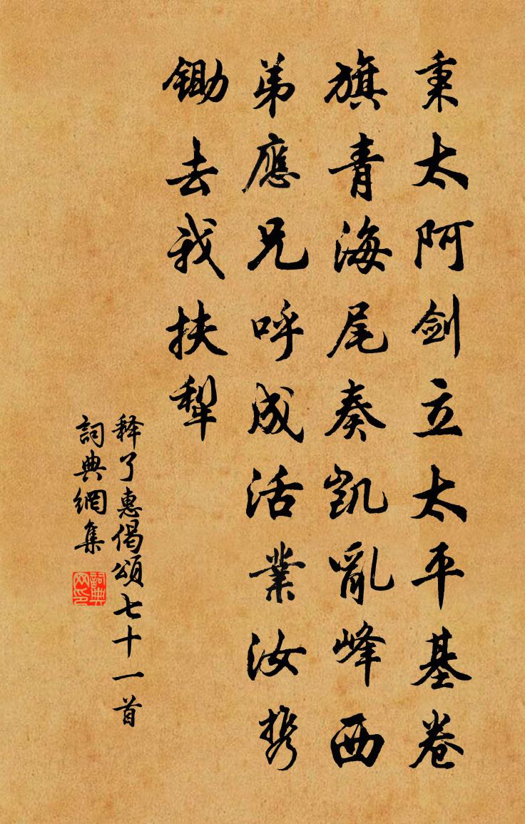 詩詞名句歷史字典書法欣賞書法字典國語詞典說文解字康熙字典古漢語字典標 題 作 者 詩 句 偈頌七十一首作者:釋了惠 朝代:宋代偈頌七十一首原文秉太阿劍,立太平基。卷旗青海尾,奏凱亂峰西。弟應兄呼成活業,汝攜鋤去我扶犁。詩詞問答問:偈頌七十一首的作者是誰?答:釋了惠問:偈頌七十一首寫於哪個朝代?答:宋代釋了惠偈頌七十一首書法欣賞偈頌七十一首書法作品詩詞推薦偈三首釋祖元〔宋代〕有佛花處不得住花,踏著秤鎚硬似花。無佛處急走過,腳下草深三尺。三千里外,逢人不得錯舉。北斗掛須彌,棒客行羅與之〔宋代〕客行困泥潦,山堠不勝長。孰使雨點暴,更令風力狂。時危嫌店遠,日暮覺程忙。身世摧頹甚,艱難已備嘗。送元晟歸潛山所居(一作送王山人歸別業)皇甫冉〔唐代〕深山秋事早,君去復何如。裛露收新稼,迎寒葺舊廬。題詩即招隱,作賦是閒居。別後空相憶,嵇康懶寄書。送汪用衡北上王冕〔元代〕去年送客西湖路,芳草落花春已暮。今年送客浦陽江,六月秋風吹柳樹。年年送客為賦詩,賦詩每以功名期。玉堂次朋山鄭管轄韻楊公遠〔宋代〕朋山心與白雲閒,一點塵囂不可乾。披褐朝真香篆裊,登壇召將劍芒寒。棋枰子落鳴飛雹,石鼎茶煎吼怒湍。待得惜黃花劉處玄〔元代〕大翁出去。隨家店住。且只似昔年,混俗龐許。食肉愛生靈,飲酒休亂做。肯忘貪,閒論今古。仙家樂處。逍遙雲紫牡丹二首楊萬里〔宋代〕萬花不分不春妍,至竟專春是牡丹。紫錦香囊金屑暖,翠羅舞袖掌文寒。恨無國色天香句,借與風絛日萼看。家有贊國清靈叟和尚真入北□祖師會釋紹曇〔宋代〕貌古神清,氣融性漫。用無準麻皮頭,瞎臨濟 * 眼。瘞焦山鶴,不假蓬塵。縛豐乾虎,只消錢貫。八怪七喬,十風中琴盧仝〔唐代〕五音六律十三徽,龍吟鶴響思庖羲。一彈流水一彈月,水月風生松樹枝。少年游(井桃·林鐘商)張先〔宋代〕碎霞浮動曉朦朧。春意與花濃。銀瓶素綆,玉泉金甃,真色浸朝紅。花枝人面難常見,青子小叢叢。韶華長在,明踏莎行(郊行,值游女以花擲水,余得之,戲作此解)張炎〔宋代〕花引春來,手擎春住。芳心一點誰分付。微歌微笑驀思量,瞥然拋與東流去。帶潤偷拈,和香密護。歸時自有留連醉落魄/一斛珠高觀國〔宋代〕鉤簾翠濕。寒江上、雨晴風急。亂峰低處明殘日。雁字成行,寫破暮天碧。故人天外長為客。倚闌一望情何極。新試黜題盧子俞所居陳藻〔宋代〕門外冬青 * 株,去去株間各丈余。晚禾翦穗上囷儲,黃藁堆妝綠葉居。老夫晨出觀道腴,摧筇邐迤來東廬。世界闕下春日鄭谷〔唐代〕建章宮殿紫雲飄,春漏遲遲下絳霄。綺陌暖風嘶去馬,粉廊初日照趨朝。花經宿雨香難拾,鶯在豪家語更嬌。秦楚登鸛雀樓王之渙〔唐代〕白日依山盡,黃河入海流。欲窮千里目,更上一層樓。廳前柳(丹桂)趙師俠〔宋代〕景清佳。正倦客,凝秋思。浩無涯。遞十里香芬馥,桂初華。向碧葉。露芳葩。為粟粒、鵝兒情淡薄,倩西風染就詠桃詩沈約〔南北朝〕風來吹葉動。風動畏花傷。紅英已照灼。況復含日光。歌童暗理曲。游女夜縫裳。詎誠當春淚。能斷思人腸。富沙城外李花盛開李洪〔宋代〕萬石灘頭數十家,溪流袞袞麥畦斜。三分春色今餘幾,開盡桃花見李花。雜興俞桂〔宋代〕漫山花發草萋萋,楊柳飛綿水拍堤。況是客懷禁不得,那堪杜宇耳邊啼。偈頌八首釋宗印〔宋代〕春山青,春水綠,春風包裹無纖粟。目前事,量外機,東村王老暗攢眉。暗攢眉,獨腳山魈舞柘杜枝。名句推薦蘭陵美酒鬱金香,玉碗盛來琥珀光。李白《客中行 / 客中作》 奔車之上無仲尼,覆舟之下無伯夷。韓非及後人《韓非子·安危》 君似孤云何處歸,我似離群雁。周紫芝《卜運算元·席上送王彥猷》 辭君向天姥,拂石臥秋霜。李白《別儲邕之剡中》 寧為太平犬,莫作亂離人!馮夢龍《醒世恆言·卷三》 海上生明月,天涯共此時。張九齡《望月懷遠》 斜陽外,寒鴉萬點,流水繞孤村。秦觀《滿庭芳·山抹微雲》 大凡物不得其平則鳴韓愈《送孟東野序》 念蘭堂紅燭,心長焰短,向人垂淚。晏殊《撼庭秋·別來音信千里》 見楊柳飛綿滾滾,對桃花醉臉醺醺。王實甫《十二月過堯民歌·別情》