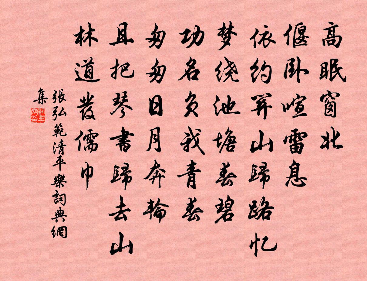 詩詞名句歷史字典書法欣賞書法字典國語詞典說文解字康熙字典古漢語字典標 題 作 者 詩 句 清平樂作者:張弘范 朝代:元代清平樂原文高眠窗北。偃臥喧雷息。依約關山歸路憶。夢繞池塘春碧。功名負我青春。匆匆日月奔輪。且把琴書歸去,山林道發儒巾。詩詞問答問:清平樂的作者是誰?答:張弘范問:清平樂寫於哪個朝代?答:元代問:清平樂是什麼體裁?答:詞張弘范清平樂書法欣賞清平樂書法作品詩詞推薦過東山吝曰盧照鄰〔唐代〕不知名利儉,辛苦滯皇州。始覺飛塵倦,歸來事綠疇。桃源迷處肝,桂樹可淹溜。跡異人間俗,禽同海上召。古苔訴衷情晏殊〔宋代〕露蓮雙臉遠山眉。偏與淡妝宜。小庭簾幕春晚,閒共柳絲垂。人別後,月圓時。信遲遲。心心念念,說盡無憑,只少年行三首·其三李白〔唐代〕君不見淮南少年遊俠客,白日球獵夜擁擲。呼盧百萬終不惜,報仇千里如咫尺。少年遊俠好經過,渾身裝束皆綺羅和文潛舟中所題黃庭堅〔宋代〕雲橫疑有路,天遠欲無門。信矣江山美,懷哉譴逐魂。長波空{左氵右往}記,佳句洗眵昏。誰奈離愁得,村醪或與政仲山行見梅偶成並和其詩二首劉學箕〔宋代〕巉岩石壁{左扌右處}崖嵬,煙檻風篁十數栽。約客偶成花外逕,舉頭俄見竹邊梅。背陰寒谷無人問,著句陽春有三月吟邵雍〔宋代〕滿城盡日行春去,言會行春還有數。真宰何嘗不發生,遊人其那無憑據。梨花著雨漫成啼,柳絮因風爭肯住。一片宿李主簿(一作劉員外)周賀〔唐代〕獨樹倚亭新月入,城牆四面鎖山多。去年今夜還來此,坐見西風裊鵲窠。薛九公期請賦山水字詩梅堯臣〔宋代〕薛君堂懸山水字,請我試作山水詩。呼童磨墨慰君意,強作安得有好辭。昔年曾是杜陵客,東城水上橫此碑。字方東柯院妖謔杜令佚名〔唐代〕雖共蒿蘭伍,南朝有宗祖。莫打綠袍人,空中且歌舞。堪憐木邊土,非兒不似女。瘦馬上高山,登臨何自苦。題雁盪山范宗尹〔宋代〕一逕入幽,隨山幾縈盤。雲樹深蓊蔚,石溪響潺湲。我來春色晚,山花亦何繁。好鳥不知名,向人自關關。遺我發縹緲峰范成大〔宋代〕滿載清閒一棹孤,長風相送入仙都。莫愁懷抱無消豁,縹緲峰頭望太湖。延之寄詩覓道院集,遣騎送呈,和韻謝之楊萬里〔宋代〕與君鬢髮摠星星,詩句輸君老更成。別去多時頻夢見,夜來一雨又秋生。故人金石情猶在,贈我瓊琚雪似清。誰把憶春日曲江宴後許至芙蓉園李紳〔唐代〕春風上苑開桃李,詔許看花入御園。香徑草中回玉勒,鳳凰池畔泛金樽。綠絲垂柳遮風暗,紅藥低叢拂砌繁。歸繞岳州作張說〔唐代〕水國生秋草,離居再及瓜。山川臨洞穴,風日望長沙。物土南州異,關河北信賒。日昏聞怪鳥,地熱見修蛇。遠人送僧文光范仲淹〔宋代〕一品山前識,迢迢三十春。多慚畫戟里,重見白雲人。朔旦冬至攝職南郊,因書即事權德輿〔唐代〕大明南至慶天正,朔旦圓丘樂七成。文軌盡同堯曆象,齋祠忝備漢公卿。星辰列位祥光滿,金石交音曉奏清。更有次胡伯仁韻裘萬頃〔宋代〕山長飛鳥急,江闊去帆微。唱晚幾漁笛,憑高一釣磯。從君濯冰雪,滿袖得珠璣。三嘆不能已,歸來吟夕暉。喜遷鶯彭耜〔宋代〕吾家何處。對落日殘鴉,亂花飛絮。五湖四海,千岩萬壑,已把此生分付。怎得海棠心緒,更沒鴛鴦債負。春正好百字令 次韻答毗陵蔣公冕見寄韓奕〔元代〕問余何事,未中年、已覺心情歡少。對青鏡、頻傷往事,白髮鬢邊生早。水上題紅,花間拾翠,到如今休了。年年汝平諸公見和復用韻二首陳棣〔宋代〕新詩敏捷雨翻盆,樽酒何時與細論。擬把鉛刀侔巨闕,卻慚布鼓過雷門。天心月脅形容遍,春蚓秋蛇體勢存。但得名句推薦明月出天山,蒼茫雲海間。李白《關山月》 竹葉於人既無分,菊花從此不須開。杜甫《九日五首·其一》 幽蘭旋老,杜若還生,水鄉尚寄旅。吳文英《鶯啼序·春晚感懷》 正其末者端其本,善其後者慎其先。房玄齡《晉書·列傳·第二十五章》 欲渡黃河冰塞川,將登太行雪滿山。李白《行路難·其一》 同聲則異而相應,意合則未見而相親戴聖《大戴禮記·保傅第四十八》 薄霧濃雲愁永晝,瑞腦銷金獸。李清照《醉花陰·薄霧濃雲愁永晝》 江流石不轉,遺恨失吞吳。杜甫《八陣圖》 向來吟秀句,不覺已鳴鴉。韓翃《酬程延秋夜即事見贈》 旌蔽日兮敵若雲,矢交墜兮士爭先。屈原《國殤》