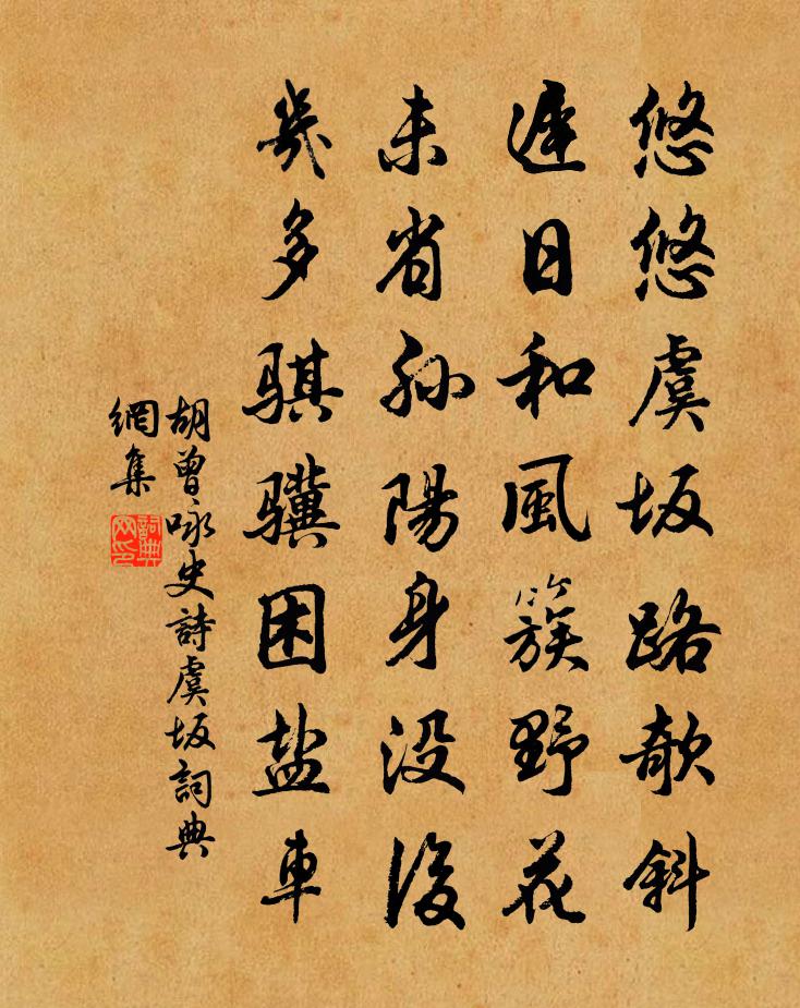 詩詞名句歷史字典書法欣賞書法字典國語詞典說文解字康熙字典古漢語字典標 題 作 者 詩 句 詠史詩虞坂作者:胡曾 朝代:唐代詠史詩虞坂原文悠悠虞坂路欹斜,遲日和風簇野花。未省孫陽身沒後,幾多騏驥困鹽車。詩詞問答問:詠史詩虞坂的作者是誰?答:胡曾問:詠史詩虞坂寫於哪個朝代?答:唐代問:詠史詩虞坂是什麼體裁?答:七絕胡曾詠史詩虞坂書法欣賞詠史詩虞坂書法作品注釋全唐詩:卷647-72詩詞推薦念奴嬌(壽朋友)吳季子〔宋代〕雪羅初試,過賜衣時節,才三四日。記得延陵公子宅,麟角當年新紱。半刺名家,一經奧學,是青雲人物。如何華華山寺范成大〔宋代〕五湖西岸孤絕處,旃檀大士來同住。性空真水遍清涼,隨綠出現無方所。蒙泉新潔監泉明,瀹茗羹藜甘似乳。何須題畫廿四首唐寅〔明代〕磬口山茶綠萼梅,深紅淺白一時開。分明蠻錦圍屏里,露出佳人粉面來。燈下讀山谷詩楊萬里〔宋代〕天下無雙雙井黃,遣編猶作舊時香。百年人物今安在?千載功名紙半張。使我詩編如許好,關人身事亦何當。地爐偈頌二十一首釋智愚〔宋代〕平生好攻禪病,不知病是道源。要知道源端的,直須陸地行船。因思大唐裴相國作圓覺經一序,一字一義,聳動人和僕射牛相公追感韋裴六相登庸皆四十餘…並見寄之作劉禹錫〔唐代〕坐鎮清朝獨殷然,閒征故事數前賢。用才同踐鈞衡地,稟氣終分大小年。威鳳本池思泛泳,仙查舊路望迴旋。猶憐朱柏岩約南歸張至龍〔宋代〕忍聞秋管悲,猶未定歸期。吟詠窮邊長,艱難老後知。水寒魚上少,月閏雁來遲。不作膏粱夢,長令一劍隨。留別西河劉少府李白〔唐代〕秋發已種種,所為竟無成。閒傾魯壺酒,笑對劉公榮。謂我是方朔,人間落歲星。白衣千萬乘,何事去天庭。君亦戴嵩牛趙文〔宋代〕荒草茫茫一笛風,{磨石換牛}鳴未必牧人通。歸鴉落日江南野,何限人間真戴嵩。殘鶯百囀歌同王員外耿拾遺吉中孚李端游慈恩各賦一物司空曙〔唐代〕殘鶯一何怨,百囀相尋續。始辨下將高,稍分長復促。綿蠻巧狀語,機節終如曲。野客賞應遲,幽僧聞詎足。禪齋和周楚望張耒〔宋代〕宿雨琴生曉潤,琴繁雲滋暑琴陰。我居琴不葺,常苦積雨侵。果墜厭風惡,草沉知潦深。拳拳抱幽嘆,耿耿嬰煩襟好事近朱敦儒〔宋代〕短棹釣船輕,江上晚煙籠碧。塞雁海鷗分路,占江天秋色。錦鱗撥刺滿藍魚,取酒價相敵。風順片帆歸去,有何人燕劉克莊〔宋代〕昔人懷故主,季世絕貧交。汝勝炎涼者,年年歸舊巢。竹所溫府教釋雲岫〔宋代〕君子居之何陋有,清虛冷澹最深幽。春風歸在鞭頭了,早晚龍孫又出頭。代秦幹上刑部張尚書楊冠卿〔宋代〕平生報國劍鋩寒,萬里漂流困一簞。貧劇方思毛義檄,歸來卻戴楚囚冠。解驂舊事無人繼,慟哭窮塗祗自嘆。倚伏寄台教王吉甫陳著〔宋代〕直溪之水清且洌,可以沃我老枯渴。直溪之風空且闊,可以舒我窮鬱結。自聞西來飛霞佩,使我南望片雲隔。苦無劉表廟李廌〔宋代〕入自東郭門,言拜景升墓。墓樹半枯槎,冥冥立晨霧。鼎國昔未分,蕭牆梗天步。呼蒼復何用,龍臥獨不顧。紆餘隔牆花李中〔唐代〕顏色尤難近,馨香不易通。朱門金鎖隔,空使怨春風。江南五首劉克莊〔宋代〕具艦逃安往,焚巢潰不支。區區一州力,不足辱王師。金蓮出玉花 繼張修祖殿試韻 拆口字起馬鈺〔元代〕傳天際。小金嬰能補綴。白絨清。物隨針繡我心。靈無影。八刀圭誰可飲。友張翁。客邀觀七寶宮。名句推薦跨馬出郊時極目,不堪人事日蕭條杜甫《野望》 北方有佳人,絕世而獨立。李延年《李延年歌》 災人者,人必反 災之。莊子《莊子·內篇·人間世》 認得醉翁語,山色有無中蘇軾《水調歌頭·黃州快哉亭贈張偓佺》 回首天涯歸夢,幾魂飛西浦,淚灑東州。周密《一萼紅·登蓬萊閣有感》 深林人不知,明月來相照。王維《竹里館》 白日何短短,百年苦易滿。李白《短歌行》 不茶不飯,不言不語,一味供他憔悴。蜀妓《鵲橋仙·說盟說誓》 馬影雞聲,諳盡倦郵荒館。張翥《陌上花·有懷》 假作真時真亦假,無為有處有還無。曹雪芹《紅樓夢·第一回》