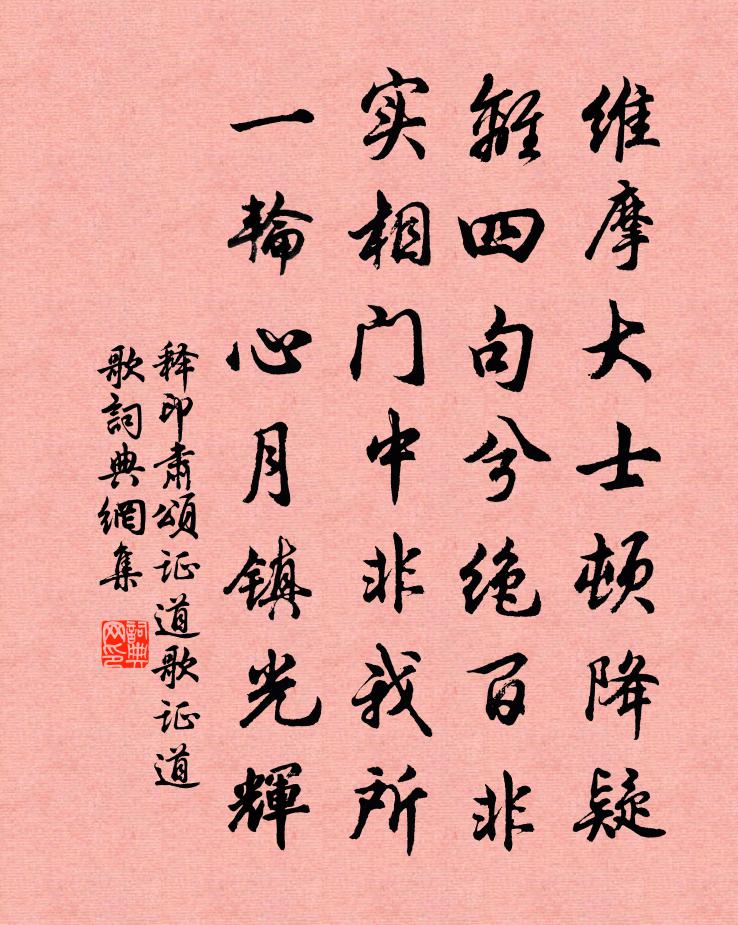 詩詞名句歷史字典書法欣賞書法字典國語詞典說文解字康熙字典古漢語字典標 題 作 者 詩 句 頌證道歌證道歌作者:釋印肅 朝代:宋代頌證道歌證道歌原文維摩大士頓降疑,離四句兮絕百非。實相門中非我所,一輪心月鎮光輝。詩詞問答問:頌證道歌證道歌的作者是誰?答:釋印肅問:頌證道歌證道歌寫於哪個朝代?答:宋代釋印肅頌證道歌證道歌書法欣賞頌證道歌證道歌書法作品詩詞推薦丙辰季夏避暑山中長松修竹恍若蓬萊異人之居釋斯植〔宋代〕六月厭煩襟,縱步情未足。愛此石徑長,緲緲清溪曲。古道何人居,門頭對修竹。好鳥發新聲,靜極成幽獨。山風醉題陸游〔宋代〕勿笑山翁病滿軀,胸中俠氣未全無。雙瞳遇醉猶如電,五木隨呼盡作盧。代北胡兒富羊馬,江南奇士出菰蘆。何由楞嚴經偈蔡卞〔宋代〕覺海性澄圖,圖澄覺元妙。元明照生所,所立照性亡。迷妄有虛空,依空立世界。相想澄國土,知覺乃眾生。空生八月七日被命上會稽沿途所歷拙於省記為韻語魏了翁〔宋代〕篾帆松艇趁潮生,隔岸平疇喚得譍。上到渡頭失歡喜,泥行十里是西興。叢桂軒四首口黃趙崇璡〔宋代〕半軒秋雨染鵝黃,望里還疑分外香。月到樹傍生淨想,雲開花底擁仙裝。披襟笑賞和衣馥,攜手高攀滿袖芳。信道鳳棲梧尹志平〔元代〕世事無涯何日了。爭似忘機,學我歸山早。山下林間常獨笑。人心未悟誰能到。終日忘言人悄悄。暮去朝來,更沒別鄒秀才釋正覺〔宋代〕聲利明來若夢遊,肯迂征家宿雲棲。情高素抱山樊志,性淡幽尋松石儔。愛我家風清入眼,問伊時事默搖頭。今朝吊秦叟褚載〔唐代〕市西樓店金千秤,渭北田園粟萬鍾。兒被殺傷妻被虜,一身隨駕到三峰。喜晴陸游〔宋代〕江湖春暮多風雨,點滴空階實厭聽。剩喜今朝有奇事,一窗晴日寫黃庭。游金庭觀李太澄〔宋代〕步步溪山轉幾重,五雲深處敞琳宮。峰慈秀擁神仙門,門徑清無世俗風。盡靜棋聲深院裹,月明琴弄夜堂中。丹成頌證道歌證道歌釋印肅〔宋代〕實是身貧道不貧,七斤衫裹不容針。搖頭只許無心得,入水元來不動冰。頌古九首釋普信〔宋代〕收來輥去事方圓,獨許漁郎上鉤船。明月蘆花同一色,落霞孤鶩共遙天。田四秘丞通判鎮戎軍祖無擇〔宋代〕身紆茜緩朝章貴,手把芝函帝命新。方朔上書曾自薦,祁奚外舉果知人。運籌暫逐征西將,持橐看歸拱北辰。我亦句宋白〔宋代〕峨眉多雨雅江秋,溢岸清波入郡流。乙丑中秋與山僧數輩自虎邱靈岩泛太湖登洞庭史堯弼〔宋代〕孤峰直上散青眸,山峙西東浸碧流。弱水人言三萬里,是間我已到瀛洲。定遠樓羅隱〔唐代〕前年上將定妖氛,曾築岩城駐大軍。近日關防雖弛柝,舊時欄檻尚侵雲。蠻兵績盛人皆伏,坐石名高世共聞。唯恐送林與桂劉克莊〔宋代〕曾與元方友,因知季子賢。烏衣況推笏,黃髮詢安問,重瞳覽奏篇。此行宜努力,忠孝幾人全。謁金門(丁酉冬昌山渡)趙師俠〔宋代〕江水綠。江山數峰如簇。喚渡小舟來岸北。筍輿行太速。素艷窗紗籠玉。埠負看花心目。今夜知他何處宿。斷魂沙天寧節後二日集英賜燕輒成長句晁說之〔宋代〕誕彌陽月播陽春,萬壽杯余燕豆申。殿角垂虹天意喜,壁緹交鳳日華新。星回畢雨金沙淨,書發狄封玉甑陳。何事和葉樞密同游南明姜特立〔宋代〕出郭眼增明,遐觀酒共傾。好風吹暑氣,快雨送雷聲。僧磬清敲寂,鶯簧巧弄晴。論交方繾綣,宗此別時情。名句推薦雲中君不見,竟夕自悲秋。馬戴《楚江懷古三首·其一》 勞苦之事則爭先,饒樂之事則能讓。荀子《荀子·修身》 出政施教,賞善罰暴。墨子《墨子·37章 非命(下)》 豈曰無衣?與子同袍。佚名《秦風·無衣》 斟酌乎質文之間,而隱括乎雅俗之際,可與言通變矣。劉勰《文心雕龍·通變》 不戚戚於貧賤,不汲汲於富貴。陶淵明《五柳先生傳》 醉別江樓橘柚香,江風引雨入舟涼。王昌齡《送魏二》 人生自是有情痴,此恨不關風與月。歐陽修《玉樓春·尊前擬把歸期說》 徙倚霜風裡,落日伴人愁。袁去華《水調歌頭·定王台》 曾把梨花,寂寞淚闌乾朱淑真《江城子·賞春》