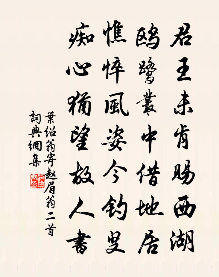 詩詞名句歷史字典書法欣賞書法字典國語詞典說文解字康熙字典古漢語字典標 題 作 者 詩 句 寄趙眉翁二首作者:葉紹翁 朝代:宋代寄趙眉翁二首原文君王未肯賜西湖,鷗鷺叢中借地居。憔悴風姿今釣叟,痴心猶望故人書。詩詞問答問:寄趙眉翁二首的作者是誰?答:葉紹翁問:寄趙眉翁二首寫於哪個朝代?答:宋代葉紹翁寄趙眉翁二首書法欣賞寄趙眉翁二首書法作品詩詞推薦金陵雜興二百首蘇泂〔宋代〕前日葵苗匝地青,幾何時節與人平。旁觀指點荼醾架,折蕊攀條似隔生。遣興陸游〔宋代〕綠髮凋零白髮多,山林未死且婆娑。無端忤俗坐狂耳,甚欲讀書如嬾何!雨過亂蓑堆野艇,月明長笛和菱歌。此中紹興以後時享二十五首真宗〔宋代〕恪恭祀典,涓選休成。設洗致潔,直於東榮。嘉觴祗牙,明德惟聲。祖考來格,享茲孝誠。近故魏國夫人盧氏輓歌辭三首楊萬里〔宋代〕唐代崔家母,升堂乳阿姑。姑言吾報婦,孫孝婦如吾。此假前無古,夫人獨與俱。秪看秦國語,更恐李唐無。次趙守鹿鳴宴韻徐元傑〔宋代〕邦侯光價擅文場,密印心胸書傳香。鳴鹿載歌苹野什,驕驊群跨杏園芳。陽春有腳葭吹管,生意無邊柳著行。已報擬古吳思齊〔宋代〕平原布一遺老,布九重未知布名。臨危觀勁節,相視膽為驚。折陊猶舉手,籲天閩無成。九隕期報國,萬古猶光晶荊南簽判向和卿用予六言見惠次韻奉酬四首黃庭堅〔宋代〕向侯賦我菁莪,何敢當不類歌。顧我乃山林士,看君取將相科。西江月(十之七)夏元鼎〔宋代〕萬里擔簦訪道,要知一點靈丹。日烏月兔在朝元。豈在迢迢雲漢。罔象求珠易得,離明契後難言。五金八石是虛傳次韻邢子友陳與義〔宋代〕壯士如今爛莫收,尚思抽矢射旄頭。不堪苦霧侵衰鬢,稍喜和煙入戍樓。萬里中原空費夢,三春勝日偶成游。青松和遠老韻二首吳芾〔宋代〕平生痼疾在煙霞,到處林泉是我家。若也遠公容入社,直須酤酒不須茶。謝翁子亨惠詩曾協〔宋代〕為愛高門足鳳麟,恂恂濟濟燕雙親。和聲自得壎箎樂,巧思爭裁錦繡新。句裹直須希鮑謝,客來今復見荀陳。要知卜運算元蔡伸〔宋代〕重重雪外山,渺渺煙中路。路轉山橫無盡愁,正是分攜處。望極錦中書,腸斷魚中素。錦素沈沈兩未期,魚雁空相青玉案元好問〔金代〕落紅吹滿沙頭路。似總為、春將去。花落花開春幾度。多情惟有,畫梁雙燕,知道春歸處。鏡中冉冉韶華暮。欲寫琴調相思引盧祖皋〔宋代〕陸續鳴鳩呼曉晴。霏微殘霧濕春城。未成梅雨,先做麥寒輕。長日愔愔花又落,短屏曲麯酒初醒。小舟無緒,閒帶己未冬至陸游〔宋代〕老人畏添歲,每嘆時序速。今朝陽始生,在易得來復。扶衰奉先祭,拜起賴童僕。兒曹亦壽我,魚兔隨事足。歡言蝶戀花 密州上元蘇軾〔宋代〕燈火錢塘三五夜。明月如霜,照見人如畫。帳底吹笙香吐麝。此般風味應無價。寂寞山城人老也。擊鼓 * ,乍入奉酬楊樂道王安石〔宋代〕邂逅聯裾殿閣春,卻愁容易即離群。相知不必因相識,所得如今過所聞。近代聲名出廬駱,前朝筆墨數淵雲。與公人日重宴大明宮恩賜彩縷人勝應制蘇頲〔唐代〕疏龍磴道切昭回,建鳳旗門繞帝台。七葉仙蓂依月吐,千株御柳拂煙開。初年競貼宜春勝,長命先浮獻壽杯。是日擬古蘇籀〔宋代〕六州齋榻釂分鵝,誰料延平最解歌。蒲孤崔姝白樓少,闔閭吳館治容多。頻煩畫戟凝薌寢,輟選鸞篦插皂羅。勿俾春深過黃亭李新〔宋代〕碧流未到小也五,半畝篔簹蔭紫苔。遲日暖風留不得,亂紅飛去燕銜來。名句推薦無人信高潔,誰為表予心?駱賓王《詠蟬 / 在獄詠蟬》 欲覺聞晨鐘,令人發深省杜甫《游龍門奉先寺》 話須通俗方傳遠,語必關風始動人。馮夢龍《警世通言·卷十二》 馬蹄濃露,雞聲淡月,寂歷荒村路。張榘《青玉案·被檄出郊題陳氏山居》 青,取之於藍而青於藍;冰,水為之而寒於水。荀子《荀子·勸學》 女蘿發馨香,菟絲斷人腸。李白《古意》 秋鬢含霜白,衰顏倚酒紅。尹式《別宋常侍》 落花有淚因風雨,啼鳥無情自古今。屈大均《壬戌清明作》 易求無價寶,難得有心郎。魚玄機《贈鄰女 / 寄李億員外》 閒雲潭影日悠悠,物換星移幾度秋。王勃《滕王閣序》
