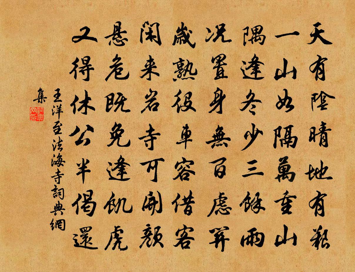 詩詞名句歷史字典書法欣賞書法字典國語詞典說文解字康熙字典古漢語字典標 題 作 者 詩 句 至法海寺作者:王洋 朝代:宋代至法海寺原文天有陰晴地有艱,一山如隔萬重山。隅逢冬少三餘雨,況置身無百慮關。歲熟役車容借客。閒來岩寺可開顏。懸危既免逢飢虎,又得休公半偈還。詩詞問答問:至法海寺的作者是誰?答:王洋問:至法海寺寫於哪個朝代?答:宋代王洋至法海寺書法欣賞至法海寺書法作品詩詞推薦愛詠詩白居易〔唐代〕辭章諷詠成千首,心行歸依向一乘。坐倚繩床閒自念,前生應是一詩僧。真藥物頌周無所住〔宋代〕天地之先,無根靈草。一意制度,產成至寶。又作此奉衛王杜甫〔唐代〕西北樓成雄楚都,遠開山嶽散江湖。二儀清濁還高下,三伏炎蒸定有無。推轂幾年唯鎮靜,曳裾終日盛文儒。白頭再次交代韻四首袁說友〔宋代〕筆力潛窺大小蘇,詩傳諸老定{巇山換口}吁。從今訂價連城重,政使群兒有善誣。齊雩祭歌 世祖武皇帝謝朓〔南北朝〕浚哲維祖。長發其武。帝出自震。重光御宇。七德攸宣。九疇鹹敘。靜難荊衡。凝威蠡浦。昧旦丕承。夕惕刑政。木蘭花慢 題倪都運南塘蓮社廬山社蘭亭會後胡祗遹〔元代〕知前代尊俎風流,猶為人永永景慕。其於善行名言,豐功懋烈,誰得而廢之。去歲夏,仆忝與賓末,僅贅一闋,庶閒坐憶樂天以詩問酒熟未劉禹錫〔唐代〕案頭開縹帙,肘後檢青囊。唯有達生理,應無治老方。減書存眼力,省事養心王。君酒何時熟,相攜入醉鄉。姑熟官舍寄汝洛友人許渾〔唐代〕官靜亦無能,平生少面朋。務開唯印吏,公退只棋僧。藥鼎初寒火,書龕欲夜燈。安知北溟水,終日送摶鵬。緣識宋太宗〔宋代〕至道非凡要審知,當仁不必用遲疑。修行忽若無靈應,還信神仙白晝飛。別張袁州五首彭龜年〔宋代〕弦急無和聲,行疾多窘步。從容應萬變,乃有天下度。先生經綸才,所至祛百蠹。一州直易耳,治者弗敢措。弱翁河傳·春淺納蘭性德〔清代〕春淺,紅怨。掩雙環,微雨花間。畫閒,無言暗將紅淚彈。闌珊,香銷輕夢還。斜倚畫屏思往事。皆不是,空作相失題羅仲舒〔宋代〕世情落落疏,林樹森森密。乘興一登臨,峭然風景別。飛雲去不停,狂澗流無歇。巢許是何人,萬古豪稱傑。贈李企許月卿〔宋代〕雁湖曾是謫臨川,誰道風流愧昔賢。共覺共兜亂堯世,何須虞黃質周田。三年遷客僅數舍,一日恩書落九天。歸去詠史詩沙丘胡曾〔唐代〕年年遊覽不曾停,天下山川欲遍經。堪笑沙丘才過處,鑾輿風過鮑魚腥。舟行戲書陸游〔宋代〕世事無窮膏火煎,羈魂病骨久羸然。覺時不及夢差樂,死去始嗟生可憐。慷慨知非請纓日,推移忽及掛冠年。揚帆重別薛華王勃〔唐代〕明月沉珠浦,風飄濯錦川。樓台臨絕岸,洲渚亘長天。旅泊成千里,柏遑共百年。窮途唯有淚,還望獨潸然。無愁果有愁曲北齊歌李商隱〔唐代〕東有青龍西 * ,中含福星包世度。玉壺渭水笑清潭,鑿天不到牽牛處。騏驎踏雲天馬獰,牛山撼碎珊瑚聲。秋娥採桑子·平生為愛西湖好歐陽修〔宋代〕平生為愛西湖好,來擁朱輪。富貴浮雲,俯仰流年二十春。歸來恰似遼東鶴,城郭人民,觸目皆新,誰識當年舊主題黃鶴樓江萬里〔宋代〕黃鶴樓高倚半天,樓中黃鶴去千年。檐楹自是留真境,幾席何妨得老仙。雲護山光秋駐馬,日籠江影書停船。良工至後入城道中雜興十首楊萬里〔宋代〕山路肩輿倦僕夫,家兄為我酒頻沽。賣薪人散知城近,啼柳烏忙覺日脯。名句推薦智足以拒諫,言足以飾非司馬遷《史記·汲鄭列傳》 桃花落,閒池閣。山盟雖在,錦書難托。陸游《釵頭鳳·紅酥手》 離恨又迎春,相思難重陳。和凝《菩薩蠻·越梅半拆輕寒里》 不堪腸斷思鄉處,紅槿花中越鳥啼。李德裕《謫嶺南道中作》 為容不在貌,獨抱孤潔。張炎《疏影·梅影》 近來攀折苦,應為別離多王之渙《送別》 最是一年春好處,絕勝煙柳滿皇都。韓愈《早春呈水部張十八員外 / 初春小雨 / 早春》 何以解憂?唯有杜康。曹操《短歌行》 古今多少事,都付笑談中。楊慎《臨江仙·滾滾長江東逝水》 逕直夫何細!橋危可免扶?楊萬里《寒食上冢》