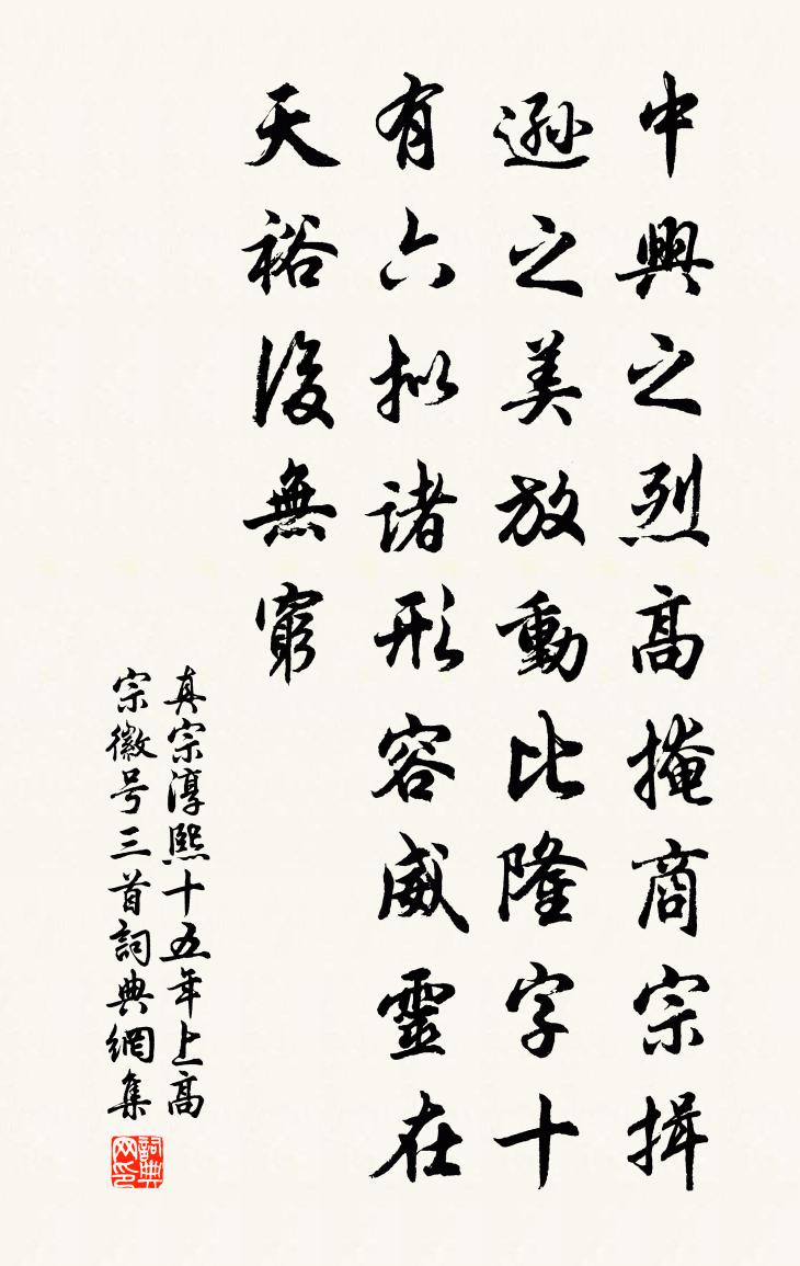 詩詞名句歷史字典書法欣賞書法字典國語詞典說文解字康熙字典古漢語字典標 題 作 者 詩 句 淳熙十五年上高宗徽號三首作者:真宗 朝代:宋代淳熙十五年上高宗徽號三首原文中興之烈,高掩商宗。揖遜之美,放動比隆。字十有六,擬諸形容。威靈在天,裕後無窮。詩詞問答問:淳熙十五年上高宗徽號三首的作者是誰?答:真宗問:淳熙十五年上高宗徽號三首寫於哪個朝代?答:宋代真宗淳熙十五年上高宗徽號三首書法欣賞淳熙十五年上高宗徽號三首書法作品詩詞推薦頌古一○一首釋子淳〔宋代〕少林續焰事堪可,臘夜梅開雪後枝。黃櫱昔年曾有語,大唐國里沒禪師。詠鷹夏竦〔宋代〕獲自野羅知性巧,飼之鮮食已恩豐。下鞲未便隨人意,須是經春更一籠。燈市行范成大〔宋代〕吳台今古繁華地,偏愛元宵燈影戲;春前臘後天好晴,已向街頭作燈市。疊玉千絲似鬼工,剪羅萬眼人力窮;兩品詠史上張釋之三首陳普〔宋代〕帝舜登天四海臣,可憐生殺不由身。持平第一張廷尉,更聽君王誤 * 。和張功父見寄陸游〔宋代〕佐命貂蟬再世孫,手鉏瓜壟傍青門。超騰已得丹換骨,戀著肯求香返魂?正復悲秋如騎省,可令病渴似文園?庭前梅花十絕句趙蕃〔宋代〕疏籬半倒竹修修,下有冰泉斷複流。此地著梅故差勝,杖藜何惜屢經丘。梅谷周文璞〔宋代〕蚝焰雲頭玉雪身,緩行微詠岸烏巾。始從谷里看修行,卻向水濱逢麗人。客子去時方得月,嶺猿啼後便無春。鳳凰題湯正仲墨梅陳耆卿〔宋代〕閒庵筆底回三春,平生愛為梅寫真。只今龍鍾已八十,雙瞳挾電搖青旻。芒鞋轍跡半天下,學語兒曹讀君畫。孤根上元思京輦舊遊三首張耒〔宋代〕隨計當年寄玉京,一時交結盡豪英。倒觥凌亂迷籌飲,醉帽敧斜並轡行。仕路飛騰輸俊傑,山城憔悴感功名。佳晨賦張參政四老堂周麟之〔宋代〕散策相從倚玉鳩,不須更伴赤松游。林塘在眼供舒嘯,花鳥催詩好勸酬。一座幾盈三百歲,四翁宜壽八千秋。堂前雪後書北台壁二首蘇軾〔宋代〕黃昏猶作雨纖纖,夜靜無風勢轉嚴。但覺衾裯如潑水,不知庭院已堆鹽。五更曉色來書幌,半夜寒聲落畫檐。試掃水調歌頭(中秋)京鏜〔宋代〕明月四時好,何事喜中秋。瑤台寶鑑,宜掛玉宇最高頭。放出白毫千丈,散作太虛一色,萬象入吾眸。星斗避光彩剡溪道中五首韓元吉〔宋代〕擬賦歸田未有田,春風聊泛剡溪船。青山滿眼留儂住,處士茅茨阿那邊。對雨思蘇子美韓維〔宋代〕五月陰盛暑不效,飛雲日夕起嵩少。迴風颯颯吹暮寒,翠竹黃蕉雨聲鬧。北軒孤坐默有念,人生會合那可料。昔與懷安光孝寺觀空軒遺圓長老王灼〔宋代〕寶坊鬱郁滿松檜,獨有小軒花數輩。榜以觀空作正觀,要識轉物大三昧。世間眩人萬紅紫,心君已落 * 內。那知白菊三首史鑄〔宋代〕我憐貞白重寒芳,小徑低叢淡薄妝。謝女黃昏吟作雪,天然別是一般香。登襄陽城杜審言〔唐代〕旅客三秋至,層城四望開。楚山橫地出,漢水接天回。冠蓋非新里,章華即舊台。習池風景異,歸路滿塵埃。好事近趙令畤〔宋代〕急雨漲溪渾,小樹帶山秋色。輕棹暮天歸路,裊芙蓉煙白。酒醒香冷夢回時,蟲聲正淒絕。只覺小窗風月,與昨宵寄題悠然閣三絕句張元乾〔宋代〕林端結閣小躋攀,四面嵐光繞曲欄。佛法本來南北異,箇中北望見南山。和慎思秋日同文館詩蔡肇〔宋代〕清月看初滿,黃花吐未齊。小山思隱桂,大谷憶佳梨。節物信可美,詩騷懶自題。長年諳獨宿,聽雨閉秋閨。名句推薦可堪孤館閉春寒,杜鵑聲里斜陽暮。秦觀《踏莎行·郴州旅舍》 長風蕭蕭渡水來,歸雁連連映天沒。盧思道《從軍行》 哀莫大於心死。莊子《莊子·外篇·田子方》 吾生也有涯,而知也無涯。莊子《莊子·內篇·養生主原文》 阿婆還似初笄女,頭未梳成不許看。袁枚《遣興》 夫死戰場子在腹,妾身雖存如晝燭。張籍《征婦怨》 漱冰濯雪,眇視萬里一毫端。張孝祥《水調歌頭·金山觀月》 野曠天清無戰聲,四萬義軍同日死。杜甫《悲陳陶》 鄉書何處達?歸雁洛陽邊。王灣《次北固山下》 隔岸荒雲遠斷,繞磯小樹微明。歸莊《錦堂春·半壁橫江矗起》
