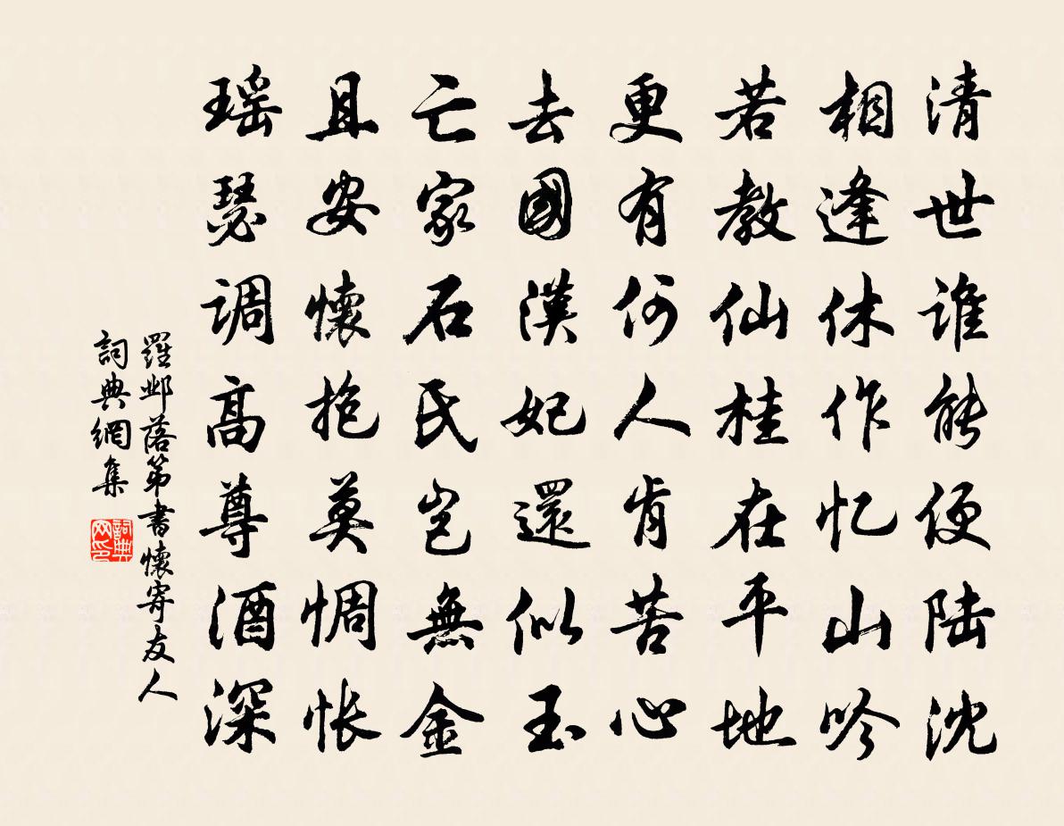 詩詞名句歷史字典書法欣賞書法字典國語詞典說文解字康熙字典古漢語字典標 題 作 者 詩 句 落第書懷寄友人作者:羅鄴 朝代:唐代落第書懷寄友人原文清世誰能便陸沈,相逢休作憶山吟。若教仙桂在平地,更有何人肯苦心。去國漢妃還似玉,亡家石氏豈無金。且安懷抱莫惆悵,瑤瑟調高尊酒深。詩詞問答問:落第書懷寄友人的作者是誰?答:羅鄴問:落第書懷寄友人寫於哪個朝代?答:唐代問:落第書懷寄友人是什麼體裁?答:七律羅鄴落第書懷寄友人書法欣賞落第書懷寄友人書法作品注釋全唐詩:卷654-42詩詞推薦遍地花晁端禮〔宋代〕密約幽歡試思忖。教人又、怎生安穩。算都來、些子精神,誚煩惱、看看瘦損。也擬待、羅織伊家,圖開解、較些貧居冬杪黃滔〔唐代〕數塞未求通,吾非學養蒙。窮居歲杪雨,孤坐夜深風。年長慚昭代,才微辱至公。還愁把春酒,雙淚污杯中。雷神碑趙立〔宋代〕此洞當年本祀雷,棟樑見我忽傾摧。寺僧為報山靈說,不用驚疑俗客來。答余洪範二首黃庭堅〔宋代〕道在東西祖,詩如大小山。一家同雪月,萬事廢機關。天上麒麟閣,山中虎豹閒。何時得丘壑,明鏡失朱顏。為圃二首劉克莊〔宋代〕衰病歸來占把茅,譬如僧葺退居寮。因存橘樹斜通徑,伯礙荷花小著橋。古有功名興釣築,今無物色到漁樵。可憐梅花盧梅坡〔宋代〕梅雪爭春未肯降,騷人閣筆費平章。梅須遜雪三分白,雪卻輸梅一段香。戲題陸游〔宋代〕莫輕凡骨未飛騰,要勝人間粥飯僧。山路近行猶百里,酒杯舉一必三升。茶湯會乞頌釋法薰〔宋代〕鋪心無下亦無高,一等無心次第澆。便是口吞三世佛,霑化涓滴也難消。應百里李天益來求作奉川十詠似之岳林陳著〔宋代〕傳說當年契此翁,偶然來此笑春風。忽拋布袋歸何處,地下天高一閣空。早朝殷堯藩〔唐代〕曙鍾催入紫宸朝,列炬流虹映絳綃。天近鰲頭花簇仗,風低豹尾樂鳴韶。衣冠一變無夷俗,律令重頒有正條。昨日第一百八十二文天祥〔宋代〕儒冠多誤身,識字用心苦。斯文憂患餘,鬱郁流年度。斑竹劉長卿〔唐代〕蒼梧千載後,斑竹對湘沅。欲識湘妃怨,枝枝滿淚痕。紹興享先農十一首佚名〔宋代〕猗歟田祖,粒食之宗。世世仰德,青壇載崇。時惟后稷,躬稼同功。作配平祀,以詔無窮。題樟亭驛樓喻坦之〔唐代〕危檻倚山城,風帆檻外行。日生滄海赤,潮落浙江清。秋晚遙峰出,沙乾細草平。西陵煙樹色,長見伍員情。江上人家釋文珦〔宋代〕江人遂生理,社翁足新醅。家有兒童樂,門無官吏來。潮生漁市合,負便客帆開。水廟迎神罷,喧喧鼓笛回。明妃曲武衍〔宋代〕中國無人虜肆輕,六宮揮淚別傾城。當時誰議誅延壽,益重君王好色名。病中有感四首岳珂〔宋代〕秋近夜初長,開窗病骨涼。心驚嫠婦嘆,肘系越人方。動帳風侵幾,窺檐月在床。呼僮然粥鼎,我欲待晨光。何倫秀才親霄不能舉冀其親戚故人有知之者葉適〔宋代〕兩母久未葬,魂冷常夜嘶。病婦槌心號,血盡身為泥。我死不息惜,少忍賦有甓。何當深九仞,更與崇四尺。驀山溪(停雲竹逕初成)辛棄疾〔宋代〕小橋流水,欲下前溪去。喚取故人來,伴先生、風煙杖屨。行穿窈窕,時歷小崎嶇,斜帶水,半遮山,翠竹栽成路輞川集北垞王維〔唐代〕北垞湖水北,雜樹映朱闌。逶迤南川水,明滅青林端。名句推薦微雨從東來,好風與之俱。陶淵明《讀山海經·其一》 溪雲初起日沉閣,山雨欲來風滿樓。許渾《鹹陽城東樓 / 鹹陽城西樓晚眺 / 西門》 馬不伏歷,不可以趨道;士不素養,不可以重國。班固《漢書·傳·眭兩夏侯京翼李傳》 東風隨春歸,發我枝上花。李白《落日憶山中》 縱使有花兼有月,可堪無酒又無人。李商隱《春日寄懷》 俱懷逸興壯思飛,欲上青天攬明月。李白《宣州謝朓樓餞別校書叔雲》 請君看取東流水,方識人間別意長。嚴仁《鷓鴣天·惜別》 陰陰溪曲綠交加,小雨翻萍上淺沙。晁沖之《春日·陰陰溪曲綠交加》 關河無限清愁,不堪臨鑒岳珂《祝英台近·北固亭》 天入平湖晴不風,夕帆和雁正浮空。陳與義《登岳陽樓》