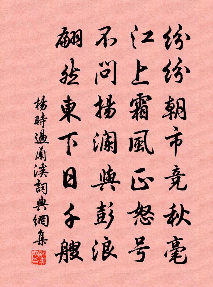 詩詞名句歷史字典書法欣賞書法字典國語詞典說文解字康熙字典古漢語字典標 題 作 者 詩 句 過蘭溪作者:楊時 朝代:宋代過蘭溪原文紛紛朝市競秋毫,江上霜風正怒號。不問揚瀾與彭浪,翩然東下日千艘。詩詞問答問:過蘭溪的作者是誰?答:楊時問:過蘭溪寫於哪個朝代?答:宋代楊時過蘭溪書法欣賞過蘭溪書法作品詩詞推薦湖山小隱林逋〔宋代〕猿鳥分清絕,林蘿擁翠微。步穿僧徑出,肩搭道衣歸。水墅香菰熟,煙崖早筍肥。功名無一點,何要更忘機。贈古樸相士姚勉〔宋代〕巧夫縱誕爭說相,口角瀾翻如剪樣。眼中元不識英奇,隨世炎涼分下上。貢諛乞得貴人詩,紅簽彩軸珍攜持。未遭懷子兼弟時在寧江赴試晁公溯〔宋代〕江晚微收潦,乘流久已歸。沈郎正多病,水帝有餘威。鴻雁幾時到,脊鴒相背飛。題書問行李,東望獨依依。柳枝詞十首徐鉉〔唐代〕金馬詞臣賦上詩,梨園弟子唱新詞。君恩還似東風意,先入靈和蜀柳枝。江行常建〔唐代〕平湖四無際,此夜泛孤舟。明月異方意,吳歌令客愁。鄉園碧雲外,兄弟淥江頭。萬里無歸信,傷心看鬥牛。污亭邵雍〔宋代〕許由為計未為深,洗耳如何不動心。到此洒然如世外,何嘗更有事來侵。宮詞張公庠〔宋代〕綺袖時宜不甚寬,自拈刀尺勘雙鸞。錦茵拂掠春宵靜,怯見飛蛾傍燭盤。除日獄空唯欠租監系頗眾因悉縱遣之期以開歲虞儔〔宋代〕訟牒日已稀,私幸庭無留。胡不了租稅,顧為此拘囚。催科迫星火,對案亦包羞。作苦念田家,歲莫得少休。羔酒自問此心呈諸老伴白居易〔唐代〕朝問此心何所思,暮問此心何所為。不入公門慵斂手,不看人面免低眉。居士室間眠得所,少年場上飲非宜。閒談夏雨王邁〔宋代〕彌旬不雨賴龍乖,乾我茅齋一畝苔。火繖這這當午立,雷車隱隱半天來。催詩笑我孤吟苦,憂國愁眉八字開。池水渡吳江杜牧〔唐代〕堠館人稀夜更長,姑蘇城遠樹蒼蒼。江湖潮落高樓迥,河漢秋歸廣殿涼。月轉碧梧移鵲影,露低紅草濕螢光。文園泛小(舟侖)二首白居易〔唐代〕水一塘,(舟侖)一隻。(舟侖)頭漾漾知風起,(舟侖)背蕭蕭聞雨滴。醉臥船中欲醒時,忽疑身是江南客。船送鍾離郎中知婺州陳襄〔宋代〕皓首潘郎少似君,一麾新得浙江濆。神仙窟宅金華近,吳越封疆寶婺分。沈約瘦來題八詠,張顛醉後掃千文。才高送逐客王勝之不及遂至屠兒原梅堯臣〔宋代〕犯霜出國門,送客客已去。猶意行未遠,策馬過寒戍。川長不見人,沙沒前崗路。始聞雲木深,忽逢朱玄墓。金鎚次黃仲甄峽中韻李流謙〔宋代〕峽水清一線,峽山赭千層。禹力不到處,蜀靈用功深。蛟龍改窟穴,日暮聞微吟。遙想風雨夕,扁舟系楓林。沁園春佚名〔宋代〕姑射瓊仙,論人間世,學宮樣妝。費精神刺繡,裁成雲錦,今朝喜遇,弱線添長。收拾雲情,鋪張雨態,來嫁朱門詠史上光武陳普〔宋代〕丙夜沈沈講未亭,故人重話舊時燈。半篇說命良依約,舜典周官總未曾。和馬郎中畫鶴贊盧綸〔唐代〕高高華亭,有鶴在屏。削玉點漆,乘軒姓丁。暮雲冥冥,雙垂雪翎。晨光炯炯,一直朱頂。含音儼容,絕粒遺影。重慶閫治十詠生意堂李曾伯〔宋代〕碩果食難盡,其機運不停。岷峨幾霜雪,依舊草青青。乞貓二首曾幾〔宋代〕江茗吳鹽雪不如,更令女手綴紅{上須下巾}。小詩卻欠涪翁句,為問銜蟬聘得無。名句推薦春風倚棹闔閭城,水國春寒陰復晴。劉長卿《別嚴士元》 至今雲雨帶愁容,月斜江上,征棹動晨鐘牛希濟《臨江仙·峭壁參差十二峰》 解釋春風無限恨,沉香亭北倚闌乾。李白《清平調·其三》 夜月一簾幽夢,春風十里柔情。秦觀《八六子·倚危亭》 吏呼一何怒,婦啼一何苦。杜甫《石壕吏》 日暮東風怨啼鳥,落花猶似墜樓人。杜牧《金谷園》 少年射虎名豪,等閒赤羽千夫膳元好問《水龍吟·從商帥國器獵於南陽同仲澤鼎玉賦此》 閒坐悲君亦自悲,百年多是幾多時。元稹《遣悲懷三首·其三》 山不在高,有仙則名水不在深,有龍則靈劉禹錫《陋室銘》 惱亂橫波秋一寸。斜陽只與黃昏近。趙令畤《蝶戀花·卷絮風頭寒欲盡》