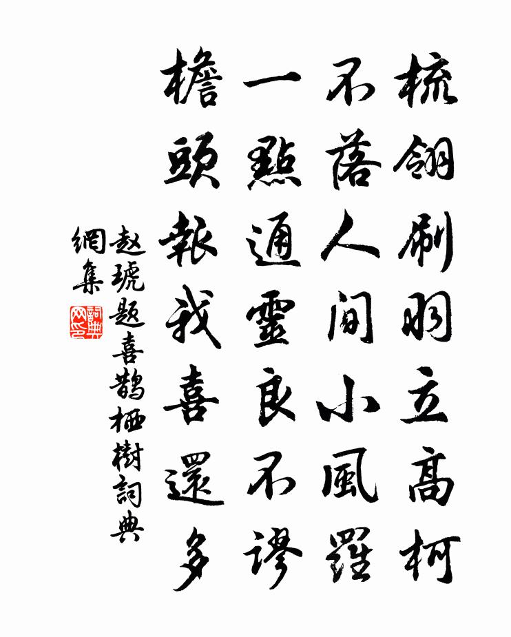 詩詞名句歷史字典書法欣賞書法字典國語詞典說文解字康熙字典古漢語字典標 題 作 者 詩 句 題喜鵲棲樹作者:趙琥 朝代:宋代題喜鵲棲樹原文梳翎刷羽立高柯,不落人間小風羅。一點通靈良不謬,檐頭報我喜還多。詩詞問答問:題喜鵲棲樹的作者是誰?答:趙琥問:題喜鵲棲樹寫於哪個朝代?答:宋代趙琥題喜鵲棲樹書法欣賞題喜鵲棲樹書法作品詩詞推薦百合花韓維〔宋代〕真葩固自異,美 * 華館。葉間鵝翅黃,蕊極銀絲滿。並萼雖可佳,幽根獨無伴。才思羨游蜂,低飛時款款。次韻張丞二首陳造〔宋代〕夫君腹笥盡奇謀,每叩談鋒聽不休。誦賦久嗟無此作,薦賢端合拔其尤。小遲榮路觀掀趠,聊為同寮蓋謬悠。政恐寄題吳仁傑架閣玩芳亭楊萬里〔宋代〕洞庭波上木葉脫,巫山宅前野花發。子規啼殺不見人,空令千載憶靈均。春蘭九畹百畝蕙,自榮自落誰能佩。澤國送蘄春李十九使君赴郡白居易〔唐代〕可憐官職好文詞,五十專城未是遲。曉日鏡前無白髮,春風門外有紅旗。郡中何處堪攜酒,席上誰人解和詩。唯共游李氏園張耒〔宋代〕堂下新年見草芽,驚心強起探年華。柳呈雪後青蒼乾,梅破風前一雨花。綽約風光新物態,哉培園沼好生涯。賓士公擇這門告別口占送之趙蕃〔宋代〕平生幾作送行詩,展卷常增別後思。我分無堪只貧賤,君才未免尚驅驅。江山此去雖多識,桃李何心亦念離。邂逅春晚二首葉茵〔宋代〕閉戶蠶新浴,開簾燕早歸。何曾春欲去,自是物華非。和韋相公話婺州陳事貫休〔唐代〕昔事堪惆悵,談玄愛白牛。千場花下醉,一片夢中游。耕避初平石,燒殘沈約樓。無因更重到,且副濟川舟。征虜亭送新安王應令詩徐陵〔南北朝〕鳳吹臨南浦。神駕餞東平。亭回漳水乘。斾轉洛濱笙。地凍斑輪響。風嚴羽蓋輕。燒田雲色暗。古樹雪花明。歧路復賦河冰四絕蘇轍〔宋代〕輕紈破碎佩環流,顛倒鏘鳴亂觸舟。解紼投篙曾不顧,不知何處擁汀洲。憶秦娥(正月初六日夜月)朱淑真〔宋代〕彎彎曲。新年新月鉤寒玉。鉤寒玉。鳳鞋兒小,翠眉兒蹙。鬧蛾雪柳添妝束。燭龍火樹爭馳逐。爭馳逐。元宵三五酬在伯再用書事之韻趙蕃〔宋代〕西行險絕類中巴,東望悲涼底是家。渺渺春風限啼鴃,悠悠落日送歸鴉。室盈幼稚為腰折,腹有詩書宜氣華。兩日立秋日聞蟬楊萬里〔宋代〕老火薰人慾破頭,喚秋不到得人愁。夜來一雨將秋至,今晚蟬聲始報秋。吳山雪霽陳允平〔宋代〕九天宮闕春風滿,陸地樓台夜月寒。鐵笛一聲吹雁落,片雲不到玉闌乾。入山遇雨宿開先寺二首王阮〔宋代〕雨漲泥痕卒未乾,斷橋無策濟歸鞍。山靈有意留儂住,不作尋常俗駕看。觀釣熊禾〔宋代〕暫停窗間詩,觀此池上釣。魚尾何沉沉,竹午何嫋嫋。一絲波面動,搖曳出深沼。校人畜我時,活我良謂厚。作鱠人雁吟張翥〔元代〕雁飛渡江謀稻梁,江人趁熟亦渡江。雁下江中唼苹藻,人飢盡屬江中央。天長水闊羅網多,無衣無食可奈何?人聲艷歌行曹勛〔宋代〕陽春麗華旦,杲日延清暉。庭前夭桃花,灼灼流芳菲。佳人惜良辰,遊子行不歸。君看夭桃花,芳菲能幾時。羅湖八首劉克莊〔宋代〕平生不作賈胡留,怪底江邊未發舟。瀧吏不須前白事,更忙定要看羅浮。夜坐白居易〔唐代〕斜月入前楹,迢迢夜坐情。梧桐上階影,蟋蟀近床聲。曙傍窗間至,秋從簟上生。感時因憶事,不寢到雞鳴。名句推薦唯燒蒿棘火,愁坐夜待晨白居易《村居苦寒》 忽如一夜春風來,千樹萬樹梨花開。岑參《白雪歌送武判官歸京》 我本不棄世,世人自棄我。李白《送蔡山人》 自是浮生無可說。人間第一耽離別。王國維《蝶戀花·滿地霜華濃似雪》 見面憐清瘦,呼兒問苦辛。蔣士銓《歲暮到家》 知我者,謂我心憂;不知我者,謂我何求。佚名《黍離》 惜恐鏡中春。不如花草新。張先《菩薩蠻·憶郎還上層樓曲》 相知無遠近,萬里尚為鄰。張九齡《送韋城李少府》 粉色全無飢色加,豈知人世有榮華。杜荀鶴《蠶婦》 不忘故鄉,仁也;不戀本土,達也。房玄齡《晉書·列傳·第三章》