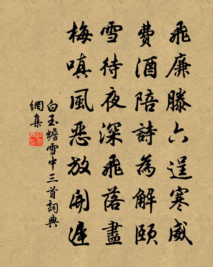 詩詞名句歷史字典書法欣賞書法字典國語詞典說文解字康熙字典古漢語字典標 題 作 者 詩 句 雪中三首作者:白玉蟾 朝代:宋代雪中三首原文飛廉滕六逞寒威,費酒陪詩為解頤。雪待夜深飛落盡,梅嗔風惡放開遲。詩詞問答問:雪中三首的作者是誰?答:白玉蟾問:雪中三首寫於哪個朝代?答:宋代問:雪中三首是什麼體裁?答:七絕白玉蟾雪中三首書法欣賞雪中三首書法作品詩詞推薦句喻鳧〔唐代〕顏凋明鏡覺,思苦白雲知。滄洲迷釣隱,紫閣負僧期。題義門胡氏華林書院和蒙〔宋代〕累葉聚居旌孝行,一齋崇講待儒注。滿堂書史勝金玉,入檻峰巒逼鬥牛。墨客四來深慕義,本奴千樹等封侯。南昌水調歌頭王之道〔宋代〕暑雨濕修竹,涼吹入高檐。鷺洲鍾阜如畫,霽色為穠纖。檻外藕花無數,妝點休祥嘉應,不覺有秋炎。謫仙墮人世覽古五首方回〔宋代〕人有好與惡,造化無頗偏。種穀匪種稗,稗實在谷先。謂天不佑惡,細察似不然。麟鳳世罕識,蛇虎動百千。泗水得古釋師範〔宋代〕麥已登場稻滿田,蕢桴土鼓樂平平。不知將謂羲皇世,元是天開寶慶年。雲韓維〔宋代〕抱石情雖久,為霖意若何。天心如見用,風力不消多。冷濕朝仙洞,寒迷宿島窠。飛揚終得路,曾入漢皇歌。胡文廣仲與范伯崇自岳市來同登絕頂舉酒極談林用中〔宋代〕自得中峰住,憐君冒雪來。共登福岩寺,齊上古層台。頭酒酬佳興,詩懷喜獨開。飄然塵世隔,談論轉堪哀。蕭何張耒〔宋代〕蕭公俯仰系安危,功業君王心獨知。猶道邵平能緩頰,君臣從古固多疑。插秧歌鄭樵〔宋代〕漠漠兮水田,裊裊兮輕煙。布穀啼兮人比肩,縱橫兮陌阡。入峽寄弟孟浩然〔唐代〕吾昔與汝輩,讀書常閉門。未嘗冒湍險,豈顧垂堂言。自此歷江湖,辛勤難具論。往來行旅弊,開鑿禹功存。壁立枕上和圓機絕句梅花十有四首晁說之〔宋代〕漢騎蜀兵下辯開,今朝惟有鳳凰台。瑤凰瓊鳳方為瑞,此地宜多白玉梅。鼓山史季溫〔宋代〕上到瑤峰第幾間,御風騎氣渺人寰。天高陡覺星辰近,地迥偏饒日月間。去海茫茫疑十里,望州隱隱見三山。閱武喜晴和厲寺正韻游清夫〔宋代〕閱武堂前宿雨晴,柳營刁斗五更鳴。風生貔虎夸身健,日射旌旗照眼明。管領春光三月暮,雕鐫詩句十分清。折衝和張倅湖上十絕姜特立〔宋代〕湖邊柳色媚清漣,湖上新荷疊綺錢。料得高人初出郭,眼中風物一醒然。長安疾後首秋夜即事(一作陳羽詩)盧綸〔唐代〕九重深鎖禁城秋,月過南宮漸映樓。紫陌夜深槐露滴,碧空雲盡火星流。清風刻漏傳三殿,甲第歌鐘樂五侯。楚客次韻葉茵〔宋代〕看月過天中,貪幽臭味同。竹光延野碧,燈影染窗紅。聽客談時務,呼兒誦國風。還思浮世事,到底是匆匆。用韻還學者詩卷方岳〔宋代〕制芰以為衣,緝荷以為屋。樵水秋夜寒,悲風入琴曲。不怨山澤癯,有道式金玉。百年肘屈伸,萬事手翻覆。拙哉金陵懷古陳元鑒〔宋代〕英雄戰守幾春秋,虎踞龍蟠古石頭。北固只憑江水在,中原長對夕陽愁。曹劉謾有經營志,王謝空遺富貴羞。舉目皇恐灘劉黻〔宋代〕十八灘中第一灘,舟行風順不知艱。諸生歷落誠皇恐,世上何人敢怨顏。寄張無頗廣利王女〔唐代〕羞解明璫尋漢渚,但憑春夢訪天涯。紅樓日暮鶯飛去,愁殺深宮落砌花。燕語春泥墮錦筵,情愁無意整花鈿。寒閨名句推薦虛牖傳寒柝,孤燈照絕編。歐陽詹《除夜長安客舍》 大直若屈,大巧若拙,大辯若訥。老子《老子·德經·第四十五章》 惜別浮橋駐馬時,舉頭試望南山嶺。李頎《少室雪晴送王寧》 一時勸人以口,百世勸人以書。袁黃《了凡四訓·積善之方》 燕子歸來,雕梁何處,底事呢喃語。王瀾《念奴嬌·避地溢江書於新亭》 幽人歸獨臥,滯慮洗孤清。張九齡《感遇十二首》 生怕見花開花落,朝來塞雁先還。辛棄疾《漢宮春·立春日》 念碎劈芳心,縈思千縷,贈將幽素,偷翦重雲。吳文英《風流子·黃鐘商芍藥》 堂上遠於百里,堂下遠於千里,門庭遠於萬里。管仲《管子·法法》 吾言甚易知,甚易行。天下莫能知,莫能行。老子《老子·德經·第七十章》
