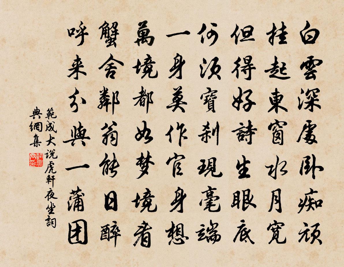 詩詞名句歷史字典書法欣賞書法字典國語詞典說文解字康熙字典古漢語字典標 題 作 者 詩 句 說虎軒夜坐作者:范成大 朝代:宋代說虎軒夜坐原文白雲深處臥痴頑,掛起東窗水月寬。但得好詩生眼底,何須寶剎現毫端。一身莫作官身想,萬境都如夢境看。蟹舍鄰翁能日醉,呼來分與一蒲1~1團。詩詞問答問:說虎軒夜坐的作者是誰?答:范成大問:說虎軒夜坐寫於哪個朝代?答:宋代問:范成大的名句有哪些?答:范成大名句大全范成大說虎軒夜坐書法欣賞說虎軒夜坐書法作品詩詞推薦次韻賓暘令郎見示二首方回〔宋代〕盛名從昔起寒微,逆旅蕭條未必非。政可夜樓觀月落,不應曉枕嘆霜飛。妙年振鬣思千里,他日乾霄會百圍。通介維摩贊李昴英〔宋代〕丈室著不得文殊,眾香國里薰教臭。無端詐病卻成喑,只為從前多業口。有懷十首劉子翬〔宋代〕青錢學士妙文章,便合含毫侍帝傍。寂寂閩山余舊隱,憶君時到讀書堂。潛佚名〔先秦〕猗與漆沮,潛有多魚。有鱣有鮪,鰷鱨鰋鯉。以享以祀,以介景福。送崔郎中赴幕溫庭筠〔唐代〕一別黔巫似斷弦,故交東去更悽然。心游目送三千里,雨散雲飛二十年。發跡豈勞天上桂,屬詞還得幕中蓮。相思頌古九十八首釋印肅〔宋代〕鼻孔遼天老古錐,入泥入水驚貧兒。死中得活機鋒疾,不斷玄風徹紫微。去年十一月十二日致宏如秦州仆餞之餘口復到張嵲〔宋代〕憶昔遊河梁,對床三夜語。平生慷慨心,遠別顏亦苦。朔風黃葉深,尚記軀車去。君行已映林,我首猶屢顧。重經夜臥舟中聞有唱山歌者倚其聲作二首王道父〔宋代〕生來不識大門邊,一片丹心石樣堅。聞道阿郎難得婦,無媒爭得到郎前。奉和聖制寒食五七言二首劉筠〔宋代〕垣禁申嚴日,余萌盡達初。踏青游騎遠,浮棗禊波舒。餳市喧簫吹,雞場隘酒車。俗康春更樂,綺榭煥晴虛。小重山賀鑄〔宋代〕飄徑梅英雪未融。芳菲訊息到,杏梢紅。隔年歡事水西東。凝思久,不語坐書空。回想夾城中。采山簫鼓沸,綺羅三月十二日晚雨因取淵明詩微雨洗高林清飈矯滕岑〔宋代〕蠶婦正望晴,耕夫又須雨。蠶既惡濕葉,牛惟便潤土。我不事農桑,薄祿仰官府。衣食有不足,何敢怨貧窶。送許處士堅往茅山潘佑〔唐代〕天壇雲似雪,玉洞水如琴。白雲與流水,千載清人心。君攜布囊去,路長風滿林。一入華陽洞,千秋那可尋。秋後二首徐文卿〔宋代〕種豆山園中,土瘠豆不實。攟收能幾何,倚杖三嘆息。況此山下田,旱久苗葉赤。無豆尚猶可,無禾孰供食。已孤木蘭花/玉樓春佚名〔宋代〕蓂開五葉。正是瑤池逢誕節。昨夜觀星。南極邊頭婺女明。家鄰九曲。壽比群仙何待祝。滿勸金鍾。但問蟠桃幾度月下口占戲子溫李新〔宋代〕萬埯層陰宿霧消,冰輪初上鏡天遙。此時仙漢欄乾曲,竹影梅風笑寂寥。和陶歸園田居六首蘇軾〔宋代〕老人八十餘,不識城市娛。造物偶遺漏,同儕盡丘墟。平生不渡江,水北有幽居。手插荔支子,合抱三百株。莫言送梁仁伯赴江陵丞三首趙蕃〔宋代〕直道多不容,枉道夫豈可。直道誠忤人,枉道還喪我。如君直有餘,為計亦多左。而我枉未能,若為逃轗軻。喜小兒輩到行在陸游〔宋代〕阿綱學書蚓滿幅,阿繪學語鶯囀木,截竹作馬走不休,小車駕羊聲陸續。書窗涴壁誰忍嗔,啼呼也復可憐人。卻思句吳沆〔宋代〕為兵不願作刀鋸,刑人未必皆不忠。為器不願作鐘鼎,銘勛未為皆有功。為吳太初題初鄰齋二首方回〔宋代〕三兩茅廬一徑深,略知住處未知心。元來有物先天地,難向君家屋畔尋。名句推薦吾言甚易知,甚易行。天下莫能知,莫能行。老子《老子·德經·第七十章》 未知生,焉知死?孔子弟子《論語·先進篇》 還怕兩人俱薄命,再緣慳、剩月零風裡。納蘭性德《金縷曲·亡婦忌日有感》 佳人獨立相思苦。薄袖欺寒脩竹暮。劉鎮《玉樓春·東山探梅》 洛陽城東桃李花,飛來飛去落誰家?劉希夷《代悲白頭翁 / 白頭吟 / 有所思》 城上風光鶯語亂,城下煙波春拍岸。錢惟演《木蘭花·城上風光鶯語亂》 但使龍城飛將在,不教胡馬度陰山。王昌齡《出塞二首》 智之所貴,存我為貴;力之所賤,侵物為賤。然身非我有也,既生,不得不全之列子及其弟子《列子·楊朱》 自憐十五餘,顏色桃李紅。李白《長干行二首》 武帝宮中人去盡,年年春色為誰來。岑參《登古鄴城》