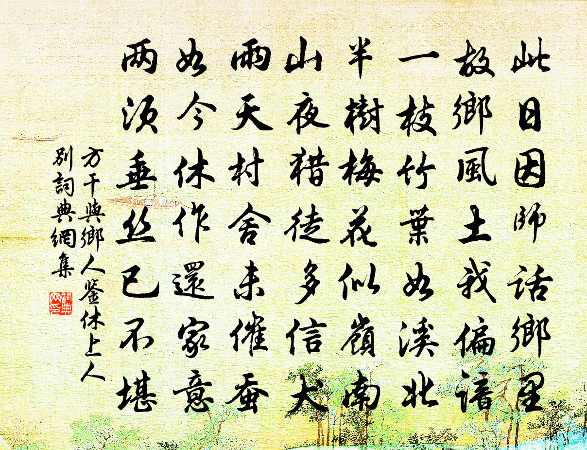 詩詞名句歷史字典書法欣賞書法字典國語詞典說文解字康熙字典古漢語字典標 題 作 者 詩 句 與鄉人鑒休上人別作者:方乾 朝代:唐代與鄉人鑒休上人別原文此日因師話鄉里,故鄉風土我偏諳。一枝竹葉如溪北,半樹梅花似嶺南。山夜獵徒多信犬,雨天村舍未催蠶。如今休作還家意,兩須垂絲已不堪。詩詞問答問:與鄉人鑒休上人別的作者是誰?答:方乾問:與鄉人鑒休上人別寫於哪個朝代?答:唐代問:與鄉人鑒休上人別是什麼體裁?答:七律方乾與鄉人鑒休上人別書法欣賞與鄉人鑒休上人別書法作品注釋全唐詩:卷651-4詩詞推薦水調歌頭佚名〔宋代〕風流九霞客,名在五雲鄉。十年出入華禁,簪橐奉君王。黃傘西清日轉,寶月紅鸞影里,長近赭袍光。彩筆賡歌處解連環劉之才〔宋代〕晚雲粘濕。正吳峰慘澹,雨 * 接。早陡頓、秋事分攜,甚連苑暮牆,菊荒苔匝。空闊愁鄉,更天外、怨鴻聲黠。句宋祁〔宋代〕金衣瑞羽迎風展,琮栗仙杯壓霧斜。絕句陳師道〔宋代〕老著江湖才一得,病占風雨漫多知。身將白鳥同歸日,夢到黃粱未熟時。六月初七日雨小止游蒲溪臨獨木橋而還張嵲〔宋代〕石岩兩相束,竹樹交柯綠。因聽林外聲,遂來幽澗曲。濕煙深不散,淺瀨漂寒玉。木杪見雲生,前峰聊注目。調笑/調笑令晁補之〔宋代〕波惡。倚江閣。大艑軻峨帆夜落。橫堂朱戶多行樂。大堤花容綽約。宜城春酒郎同酌。醉倒銀缸羅幕。船子和尚遺蹟在華亭朱涇之間圭上人即其所誅劉克莊〔宋代〕萬頃煙波百尺絲,禪家宗旨有誰知。自嫌固陋如高叟,卻為僧箋把釣詩。擬輓歌辭 其二陶淵明〔魏晉〕在昔無酒飲,今但湛空觴。春醪生浮蟻,何時更能嘗?餚案盈我前,親舊哭我傍。欲語口無音,欲視眼無光。昔在京使回自臨川,得從兄書寄詩,依韻和徐鉉〔唐代〕珍重還京使,殷勤話故人。別離長掛夢,寵祿不關身。趣向今成道,聲華舊絕塵。莫嗟客鬢老,詩句逐時新。丙辰年別龜峰曹源和尚釋道沖〔宋代〕葛溪深處定宗綱,一任乾坤大地荒。但得棒頭明似日,可無臨濟解承當。塞下曲郎士元〔唐代〕寶刀塞下兒,身經百戰曾百勝,壯心竟未嫖姚知。白草山頭日初沒,黃沙戍下悲歌發。蕭條夜靜邊風吹,獨倚營門野廟方回〔宋代〕金甲朱衣畫壁昏,軍聲不到暫開門。數家祈福來澆奠,剪紙糊燈作上元。偶作二首宋祁〔宋代〕衰翁好藏密,移病此僑居。白眼慵迎客,青泥倦補書。風侵殘晝綱。煙鎖蔽春樗。惟有伊蒲士,相從樂飯蔬。東陽方韶卿惠古意七篇久不得和五月二十六日戴表元〔宋代〕德孤誰願高,氣寒誰願清。斯文鄒魯來,壈坎勞其生。豈無性命憂,艱難愈同情。如何及門士,亦作胡越聲。歸塗許月卿〔宋代〕望外雲頭日高掛,竹間亭子雪猶存。啣蘆雁起瀟湘暮,賣炭人行煙火村。綺疏月照窗如晝,寶鼎香銷帳似雲。欲轉沁園春(冰漕鑿方泉,賓客請以名齋,邀賦)吳文英〔宋代〕澄碧西湖,軟紅南陌,銀河地穿。見華星影里,仙棋局靜,清風行處,瑞玉圭寒。斜谷山深,望春樓遠,無此崢嶸罷徐州,往南京,馬上走筆寄子由五首蘇軾〔宋代〕卜田向何許,石佛山南路。下有爾家川,千畦種粳稌。山泉宅龍蜃,平地走膏乳。異時畝一金,近欲為逃戶。逝將送蔡迨赴桂陽令周必大〔宋代〕工部詩題滿劍川,儀曹文筆照湖南。身行蜀棧曾幽討,舟掛吳帆又飽參。睎驥有心真自得,拔茅無術定誰慚。金蘭和司徒侍中壬子寒食會壓沙寺詩二首強至〔宋代〕四照梨花一色中,他時珍賞有雌雄。高牙就景開芳宴,皓齒停歌誦正風。樂極光陰窮日御,詩成造化奪春工。佳辰九月雪十月雷記異方回〔宋代〕九月二十五夜雪,南天稻梁未全結。十月二十五夜雷,東風桃李俱誤開。七十三翁駭何謂,雷舊慣聞雪則未。水旱名句推薦兩岸月橋花半吐。紅透肌香,暗把遊人誤。真德秀《蝶戀花·兩岸月橋花半吐》 晚來天欲雪,能飲一杯無?白居易《問劉十九》 不痴不聾,不作家翁。司馬光《資治通鑑·唐紀四十》 秋霜切玉劍,落日明珠袍李白《白馬篇》 近者說,遠者來。孔子弟子《論語·子路篇》 少年不識愁滋味,愛上層樓。愛上層樓,為賦新詞強說愁。辛棄疾《醜奴兒·書博山道中壁》 誰人背後無人說,哪個人前不說人?佚名《增廣賢文·上集》 道傍榆莢仍似錢,摘來沽酒君肯否。岑參《戲問花門酒家翁》 汀洲無浪復無煙,楚客相思益渺然。劉長卿《自夏口至鸚鵡洲夕望岳陽寄源中丞》 孔雀東南飛,五里一徘徊。佚名《孔雀東南飛 / 古詩為焦仲卿妻作》