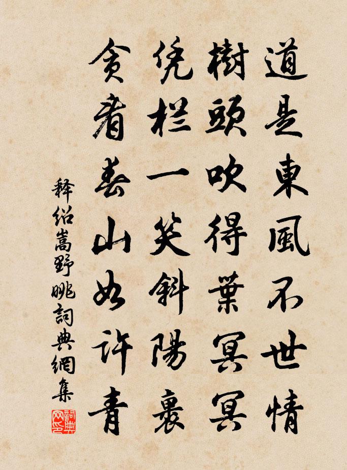 詩詞名句歷史字典書法欣賞書法字典國語詞典說文解字康熙字典古漢語字典標 題 作 者 詩 句 野眺作者:釋紹嵩 朝代:宋代野眺原文道是東風不世情,樹頭吹得葉冥冥。憑欄一笑斜陽裹,貪看春山如許青。詩詞問答問:野眺的作者是誰?答:釋紹嵩問:野眺寫於哪個朝代?答:宋代釋紹嵩野眺書法欣賞野眺書法作品詩詞推薦舟中倦甚晁說之〔宋代〕櫓聲出入如謳發,晝長夜短睡蛇絕。船窗跼蹐天地隘,出向船頭望寒月。月寒不照孤征人,自與紅爐得意親。何日道中二首宋祁〔宋代〕故歲南趨壽,今茲北向陳。淹留桂枝客,還入玉關人。鬢髮都成葆,纓瓖幸濯塵。心知來往數,不敢問迷津。午晴試筆陸游〔宋代〕葉脫園林夜夜霜,風和巷陌日猶長。軒車但怪容孤鶴,稊米安能盆太倉。此去得非窮李廣,向來元是老馮唐。明窗藥翁吟彭龜年〔宋代〕有翁憂思深,挾藥救一世。大聲疾其呼,負篋即都市。凝視徹河漢,覘色見腸胃。巍峨一男子,面澤勝粉膩。翁前贈歐陽明府杜荀鶴〔唐代〕賢宰宰斯邑,政聞閭裡間。都緣民訟少,長覺吏徒閒。帆落樽前浦,鐘鳴枕上山。回舟卻惆悵,數宿釣魚灣。好事近仲並〔宋代〕閥閱盛中州,冠冕共推華族。耐久松筠交契,更襟懷金玉。諸儒皆自愧盧前,小試暫符竹。行看世官入踐,繼西樞早梅芳近/早梅芳李德載〔宋代〕殘臘里,早梅芳。春信報新陽。曉來枝上斗寒光。輕點壽陽妝。雪難欺,霜莫妒。別是一般風措。望林人意正夭饒玩松竹滕岑〔宋代〕馬目在屋南,龍峰在屋北。南為山所障,北半露山色。賴有竹與松,足供予燕息。竹乃前贈栽,種自別墅得。松長寒食戴表元〔宋代〕寒食清明卻過了,故鄉風物祗依然。窮中有客分青飯,亂後誰墳掛白錢。落魄暖春為麥地,陰沉溽雨近梅天。間情感春張籍〔唐代〕遠客悠悠任病身,謝家池上又逢春。明年各自東西去,此地看花是別人。西興阻風王炎〔宋代〕小市西興渡,年來一再行。花開方淑景,木落又寒聲。雲破日還晦,潮回江未平。壯年曾試險,遲莫敢輕生。惜花李建勛〔唐代〕白髮今如此,紅芳莫更催。預愁多日謝,翻怕十分開。點滴無時雨,荒涼滿地苔。閒階一杯酒,惟待故人來。下水船黃庭堅〔宋代〕總領神仙侶。齊到青雲歧路。丹禁風微,咫尺諦聞天語。盡榮遇。看即如龍變化,一擲靈梭風雨。真游處。上苑尋德壽宮即事六首任希夷〔宋代〕慈福修齡八十春,微陽才動寶書新。天家慶事古無有,奕葉重光似顯仁。漁家傲毛滂〔宋代〕鬢底青春留不住。功名薄似風前絮。何似瓮頭春沒數。都占取。只消一紙長門賦。寒日半窗桑柘暮。倚闌目送繁雲玄沙和尚釋重顯〔宋代〕本是釣魚船上客,偶除鬚髮著袈裟。祖佛位中留不得,夜來依舊宿薦花。別墅懷歸陸龜蒙〔唐代〕水國初冬和暖天,南榮方好背陽眠。題詩朝憶復暮憶,見月上弦還下弦。遙為晚花吟白菊,近炊香稻識紅蓮。何人自和山房十詠李曾伯〔宋代〕新來詩思與秋清,野徑無人適意行。道盡青松知小雨,隔林怪在竹雞鳴。感事四首歐陽修〔宋代〕仙境不可到,誰知仙有無。或乘九斑◇,或駕五雲車。朝倚扶桑枝,暮游崑崙墟。◇來幾萬里,誰復遇諸塗。富貴偈頌八十五首釋妙倫〔宋代〕阿呵呵,瑞岩與么道,大似落湯螃蟹,七手八腳一時露現。名句推薦獨立小橋風滿袖,平林新月人歸後。馮延巳《鵲踏枝·誰道閒情拋擲久》 生而知之;或學而知之;或困而知之:及其知之,一也。子思《中庸·第二十章》 飢而欲食,寒而欲暖,勞而欲息,好利而惡害,是人之所生而有也。荀子《荀子·榮辱》 金風飄菊蕊,玉露泫萸枝。韋安石《奉和九日幸臨渭亭登高應制得枝字》 宴爾新婚,以我御窮。佚名《谷風》 畫船捶鼓催君去。高樓把酒留君住。舒亶《菩薩蠻·畫船捶鼓催君去》 五更櫪馬靜無聲。鄰雞猶怕驚。吳文英《醉桃源·元日》 鏡水夜來秋月,如雪。溫庭筠《荷葉杯·鏡水夜來秋月》 佳人獨立相思苦。薄袖欺寒脩竹暮。劉鎮《玉樓春·東山探梅》 竹色溪下綠,荷花鏡里香。李白《別儲邕之剡中》