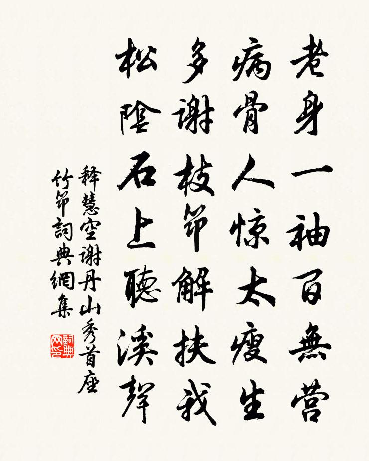 詩詞名句歷史字典書法欣賞書法字典國語詞典說文解字康熙字典古漢語字典標 題 作 者 詩 句 謝丹山秀首座竹筇作者:釋慧空 朝代:宋代謝丹山秀首座竹筇原文老身一袖百無營,病骨人驚太瘦生。多謝枝筇解扶我,松陰石上聽溪聲。詩詞問答問:謝丹山秀首座竹筇的作者是誰?答:釋慧空問:謝丹山秀首座竹筇寫於哪個朝代?答:宋代釋慧空謝丹山秀首座竹筇書法欣賞謝丹山秀首座竹筇書法作品詩詞推薦婁師德引諺佚名〔唐代〕卒客無卒主人。還李彀士雄卷張舜民〔宋代〕河汾之會,韓晉之津。在昔王馬今何人,青衫木笏排風塵。面如桃花髭如銀,長篇大字妙入神。關輔後輩誰等倫,游歙州興唐寺張喬〔唐代〕山橋通絕境,到此憶天台。竹里尋幽徑,雲邊上古台。鳥歸殘照出,鍾斷細泉來。為愛澄溪月,因成隔宿回。清平樂黃機〔宋代〕風韶煙膩。春事三之二。說與人生行樂耳。富貴古來如此。西園已有心期。姚黃魏紫開時。纖指金荷瀲灩,香唇銀塞翁吟方千里〔宋代〕暮色催更鼓,庭戶月影朧。記舊跡、玉樓東。看枕上芙蓉。雲屏幾軸江南畫,香篆爐暖煙空。睡起處,繡衾重。中秋後一夕獨臥月台曹彥約〔宋代〕分得秋容半,添來爽氣深。靜中無罣礙,此處好登臨。老景當風臥,平生愛月心。幾回烏鵲動,曉色上平林。口伐王遂〔宋代〕口伐歸來戰馬閒,詩書只守一編殘。治安策裹多流涕,莫作興亡異代看。別飾道二十弟晃沖之〔宋代〕飄零南北一衰門,知是澶淵五世孫。嗟我獨無兄弟在,憐君尚有典刑存。老身素苦貧常瘦,病目仍緣哭轉昏。它日贈蓮花洞僧二首董嗣杲〔宋代〕山枯葉落晴紛紛,蓮花洞前流水分。流水自送夕陽去,洞上白猿啼白雲。田家劉學箕〔宋代〕堆槃野柿間山梨,酒美雞肥稻滑匙。婦子團樂常見面,一醉寧識別離悲。同潘丈游東平瀑陳宓〔宋代〕天公特地放初晴,許我聯鑣琬琰行。新著茅亭憑到晚,難將一字扁佳名。聽穎師琴歌李賀〔唐代〕別浦雲歸桂花渚,蜀國弦中雙鳳語。芙蓉葉落秋鸞離,越王夜起游天姥。暗佩清臣敲水玉,渡海蛾眉牽白鹿。誰看十月七日夜夢中作兩長句覺而忘之別成長句視晁說之〔宋代〕冬來羇旅更迢迢,撫枕燈殘百感饒。飢鼠翻空疑有鬼,驚烏誤曉尚中宵。詩成與夢俱零落,劍出低眉亦寂寥。無分真藥物頌周無所住〔宋代〕天地之先,無根靈草。一意制度,產成至寶。題鍾白玉蟾〔宋代〕聞道琳宮欲范鍾,上皇敕賜萬斤銅。一模脫出等閒事,千古要知陶鑄功。敲得星飛驚落月,撞教雲破響呼風。於今送晁堯民守徐陳師道〔宋代〕中年為別不堪憂,束髮登門到白頭。南省望郎仍國士,東方千騎更吾州。彭翁老壽終遺骨,燕子飛來只故樓。知己偈傾一百三十三首釋法薰〔宋代〕九夏安居,眉毛廝結。一人發真歸源,十方虛空迸裂。嘲高士廉木履選人〔唐代〕刺鼻何曾嚏,蹋面不知嗔。高生兩個齒,自謂得勝人。比因和首座詩有故欲撩公懶是真之句名其室日趙蕃〔宋代〕少日經禪暇,猶余文字嬉。老來無復事,日用亦奚為。衲被忘宵度,團蒲失晝移。謂公真是懶,如我不其痴。次韻汪翔甫和西城呂全州見過四首方回〔宋代〕驟見累侯印,遄聞趣相裝。相期終古事,未用暫時香。清論玉霏麈,高眠雷撼床。前魚又堪笑,紅袖泣龍陽。名句推薦不教而誅,則刑繁而邪不勝;教而不誅,則奸民不懲。荀子《荀子·富國》 此日六軍同駐馬,當時七夕笑牽牛。李商隱《馬嵬·其二》 兩行疏柳,一絲殘照,萬點鴉棲。劉基《眼兒媚·秋思》 紅板橋空,濺裙人去,依舊曉風殘月。納蘭性德《淡黃柳·詠柳》 銅鑄金鏞振紀綱,聲傳海外播戎羌。曹雪芹《交趾懷古》 採得百花成蜜後,為誰辛苦為誰甜。羅隱《蜂》 深村時節好,應為去年豐。范成大《寒食郊行書事》 王顧左右而言他。孟子《孟子·梁惠王章句下·第六節》 君是南山遺愛守,我為劍外思歸客。蘇軾《滿江紅·江漢西來》 今日山城對垂淚,傷心不獨為悲秋。李益《上汝州郡樓》