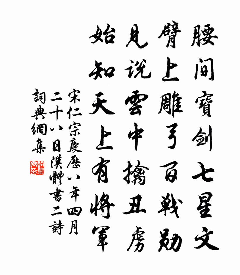 詩詞名句歷史字典書法欣賞書法字典國語詞典說文解字康熙字典古漢語字典標 題 作 者 詩 句 慶曆八年四月二十八日漢體書二詩作者:宋仁宗 朝代:宋代原文腰間寶劍七星文,臂上雕弓百戰勛。見說雲中擒醜虜。始知天上有將軍。詩詞問答問:《慶曆八年四月二十八日漢體書二詩》的作者是誰?答:宋仁宗問:該詩寫於哪個朝代?答:宋代問:該詩是什麼體裁?答:樂府書法欣賞慶曆八年四月二十八日漢體書二詩書法作品詩詞推薦哭棲白供奉李洞〔唐代〕聞說孤窗坐化時,白莎蘿雨滴空池。吟詩堂里秋關影,禮佛燈前夜照碑。賀雪已成金殿夢,看濤終負石橋期。逢山訪何茂恭於南湖作三絕句喻良能〔宋代〕十里相望煙樹,旬月不絕籃輿。漱石枕流戲彩,浮家泛宅南湖。過柳州戴叔倫〔唐代〕地盡江南戍,山分桂北林。火雲三月合,石路九疑深。暗谷隨風過,危橋共鳥尋。羈魂愁似絕,不復待猿吟。幽州送景僧錄歸錢塘汪元量〔宋代〕天目山前景老禪,長安傳法舊沙門。十年不見身為累,萬里相逢舌尚存。漠漠塵埃凝破衲,淒淒風露襲歸轅。到家西江月(憶仙)劉辰翁〔宋代〕曾與回翁把手,自宜老子如龍。懷胎不敢問春冬。等待鞭鸞笞鳳。昨夜又遲黃石,今朝重叩鴻濛。碧桃花下醉相逢入青城山門詩程公許〔宋代〕入山佳氣異他山,翠邏周遭幾復關。流水白雲無盡藏,莫教容易到人間。如夢令(秋懷)張仲宇〔宋代〕送過雕梁舊燕。聽到妝樓新雁。菊訊一何遲,倒盡清樽誰伴。魂斷。魂斷。人與暮雲俱遠。句劉得仁〔唐代〕外家雖是帝,當路且無親。白日只如哭,黃泉免恨無。身閒甘旨下,白髮太平人。同游芳草寺,見示白雲詩。猶祈梅花二首陳與義〔宋代〕畫取維摩室中物,小瓶春色一枝斜。夢回映月窗間見,不是桃花與李花。夏日雜詩陳文述〔清代〕水窗低傍畫欄開,枕簟蕭疏玉漏催。一夜雨聲涼到夢,萬荷葉上送秋來。移床楊萬里〔宋代〕清晨暑氣已愁予,何況腸蟲午及脯。尋得松風小涼處,移床來坐又還無。雪中失白馬仇博〔宋代〕絲繮誤解白龍,滿地瓊瑤{示親}粉蹄。愁殺塞翁尋不見,月明風靜只聞嘶。謝張直閣示南湖編項安世〔宋代〕少時機杼入思惟,老去工夫更不疑。二十卷詩除我讀,一生心事更誰知。字逢生處安逾穩,語到平時出轉奇。直與忘已釋文珦〔宋代〕身榮如美疢,身退是良方。雲月皆成趣,悲歡不入腸。閒門清晝永,宴坐綠陰涼。昔者惟忘物,今焉已亦忘。桔柏渡(在昭化縣)杜甫〔唐代〕青冥寒江渡,駕竹為長橋。竿濕煙漠漠,江永風蕭蕭。連笮動裊娜,征衣颯飄颻。急流鴇鷁散,絕岸黿鼉驕。西轅用一代不數人百年能幾見為韻詩賦十章呈陳君趙蕃〔宋代〕人言會合難,會合端有數。公不絕櫧洲,我政長沙住。四快圖劉克莊〔宋代〕一人筅耳手不柱,一人坦背抓癢處。一人理髮虱禽獲,一人噴嚏虎驚去。余鼻久塞耳驟聾。虱無附麗頭已童。惟背上元後連數日小雨作寒戲作陸游〔宋代〕春風催暖入園林,一片雲生又作陰。留得梅花三日住,誰雲造物本無心?奉酬魯望夏日四聲四首平上聲皮日休〔唐代〕溝渠通疏荷,浦嶼隱淺筱。舟閒攢輕蘋,槳動起靜鳥。陰稀余桑閒,縷盡晚繭小。吾徒當斯時,此道可以了。過虎頭狼尾灘避險出陸到譚晉仲故居有謝公昌魏了翁〔宋代〕尚記翩然下帝傍,七年才入屈公鄉。山銜西日去家近,風遞北氛吹袂涼。新事感傷心力短,舊交零落話頭長。況堪名句推薦藕花珠綴,猶似汗凝妝。閻選《臨江仙·雨停荷芰逗濃香》 將欲歙之,必故張之;將欲弱之,必故強之;將欲廢之,必故興之;將欲取之,必故與之。是謂微明。老子《老子·道經·第三十六章》 一川菸草,滿城風絮,梅子黃時雨。賀鑄《青玉案·凌波不過橫塘路》 白馬金羈遼海東,羅帷繡被臥春風。李白《春怨》 年年雪裡。常插梅花醉。李清照《清平樂·年年雪裡》 浮雲蔽白日,遊子不顧返。佚名《行行重行行》 南國辛居士,言歸舊竹林孟浩然《都下送辛大之鄂》 憶昔西池池上飲,年年多少歡娛。晁沖之《臨江仙·憶昔西池池上飲》 雁聲不到東籬畔,滿城但、風雨淒涼吳文英《惜黃花慢·菊》 櫪馬苦踡跼,籠禽念遐征。張九齡《秋晚登樓望南江入始興郡路》
