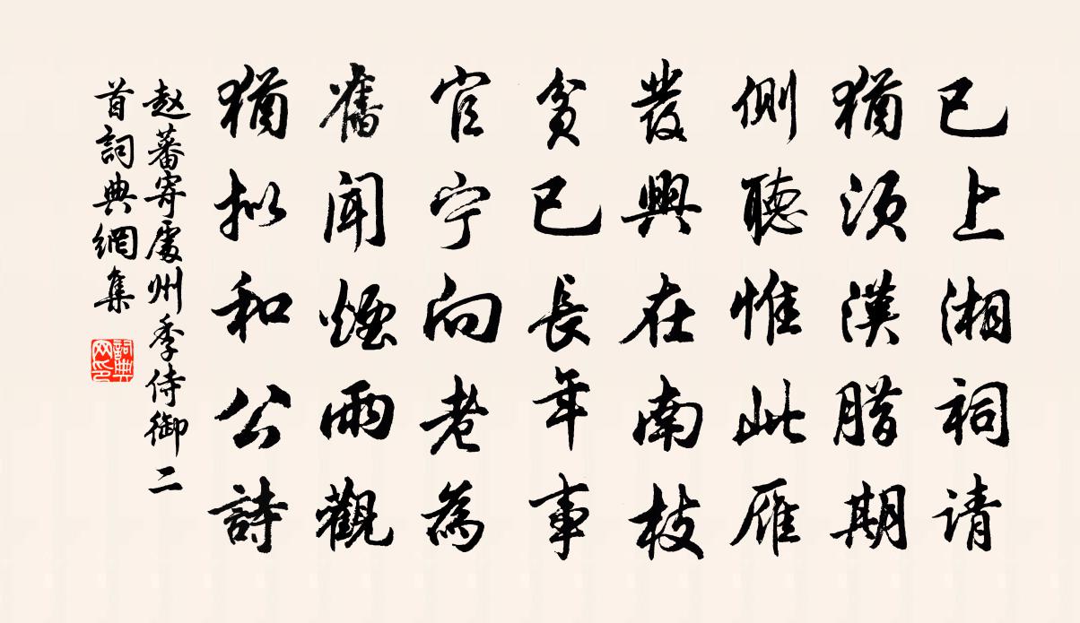 詩詞名句歷史字典書法欣賞書法字典國語詞典說文解字康熙字典古漢語字典標 題 作 者 詩 句 寄處州季侍御二首作者:趙蕃 朝代:宋代寄處州季侍御二首原文已上湘祠請,猶須漢臘期。側聽惟此雁,發興在南枝。貧已長年事,官寧向老為。舊聞煙雨觀,猶擬和公詩。詩詞問答問:寄處州季侍御二首的作者是誰?答:趙蕃問:寄處州季侍御二首寫於哪個朝代?答:宋代趙蕃寄處州季侍御二首書法欣賞寄處州季侍御二首書法作品詩詞推薦晏元獻公輓辭三首歐陽修〔宋代〕四鎮名藩忽十春,歸來白首兩朝臣。上心方喜親耆德,物論猶期秉國鈞。退食圖書盈一室,開樽談笑列嘉賓。昔人讀晦翁遺文悽愴有作孫應時〔宋代〕先生千載人,浩氣隘穹壤。早薄聲利交,超然傲塵鞅。飲酒讀離騷,追游必豪克。風月飽高吟,雲泉擅奇賞。切骨菩薩蠻(夏)鑒堂〔宋代〕竹枝高映荷池綠。綠池荷映高枝竹。流水碧浮鷗。鷗浮碧水流。酒尊陪舊友。友舊陪尊酒。吟客坐時斟。斟時坐客依韻酬毋湜推官范仲淹〔宋代〕聖門非入室,文陣敢爭盟。不意棲雲閣,何才隸月卿。珍群憐未至,霄鶚引修程。直舍有仙味,秘庭無俗聲。午陰峨眉真人陳圖南真贊黃庭堅〔宋代〕一藤出山,來正人紀。見藝祖太宗,曰天下定矣。如月在天,去來無疵。巍巍頎頎,為帝王師。聖哲肺腑,天人眉遣吏視諸公塋樹回有感文靖呂丞相宋祁〔宋代〕慶曆公三入,邊陲擾太平。啖金真間敵,撓酒不寒盟。上印情雖切,然髭病遽輕。惜哉天弗憗,宸幄淚先橫。送徐茂功西上二首王邁〔宋代〕有司具眼柬時髦,此士今纏入約羅。好去南宮平步過,向來東閣閱才多。孤忠畎畎常憂國,大對軒墀莫主和。有問菩薩蠻·富陽道中毛滂〔宋代〕春潮曾送離魂去。春山曾見傷離處。老去不堪愁。憑闌看水流。東風留不住。一夜檐前雨。明日覓春痕。紅疏桃杏過襄陽上於司空頔李涉〔唐代〕方城漢水舊城池,陵谷依然世自移。歇馬獨來尋故事,逢人唯說峴山碑。書窗劉克莊〔宋代〕跳丸屋角去如馳,蠹簡窗間卷復披。元老豈無揮玉麈,大儒曾有奮金樵。釣牽鰲極靈根動,斧入牛山傑木衰。白首天聽吟邵雍〔宋代〕天聽寂無音,蒼蒼何處尋。非高亦非還,都只在人心。依韻和晁十七落花二首張耒〔宋代〕投老殷勤向物華,風前猶欲拾余花。更將夢逐殘紅去,遍入長安百萬家。送封州方法曹劉克莊〔宋代〕地遠無迎吏,州城若個邊。寧甘茅屋粥,勿飲石門泉。旋橐挑詩卷,家書托客船。安知二千石,不薦議曹賢。贈歡娘(八歲善吹笙)薛能〔唐代〕一束龍吟細竹枝,青娥擎在手中吹。當時縱使雙成在,不得如伊是小時。同坰寄黃濟川五首吳則禮〔宋代〕今年一尺雪,大盎想春沽。烏帽有何好,青鞋絕世無。老泓元有韻,瘦潁要時呼。跛跛沒伎倆,歸來真老盧。招約之職方並示正甫書記王安石〔宋代〕往時江總宅,近在青溪曲。井滅非故桐,台傾尚余竹。池塘三四月,菱蔓芙蕖馥。蒲柳亦競時,冥冥一川綠。方坻達磨大師贊釋普濟〔宋代〕五一竺國,東震旦土。傳佛心宗,無本可據。無本據,一葦橫趨,大江東去。郎官湖春日四首李祁〔宋代〕十日春陰到水亭,水邊楊柳一時青。梅花過盡桃花惡,乞取山礬入淨瓶。句王繹〔宋代〕荔陳貢篚清香馥,峰倚三山秘篆奇。游保寧院練光亭同丘程凌林四君分題用業字韻蘇頌〔宋代〕寺本梁瓦棺,地臨吳建業。何人構虛亭,勝概壓危堞。岩扃豁常開,江練靜相協。洪濤雖震騰,迅流終妥帖。遠窮名句推薦馬蹄濃露,雞聲淡月,寂歷荒村路。張榘《青玉案·被檄出郊題陳氏山居》 以小人尚民而威,以非所取於民而巧,是傷國之大災也。荀子《荀子·王霸》 孤山寺北賈亭西,水面初平雲腳低。白居易《錢塘湖春行》 昨夜狂風度,吹折江頭樹李白《長干行二首》 活水源流隨處滿,東風花柳逐時新。于謙《觀書》 煙霏霏。雪霏霏。雪向梅花枝上堆。吳淑姬《長相思令·煙霏霏》 隔水氈鄉,落日牛羊下,區脫縱橫。張孝祥《六州歌頭·長淮望斷》 世之道,人不自害而人害也;人之道,人不恕己而自恕也。來俊臣《羅織經·保身卷第七》 河水傾潑丈余,雞鳴犬吠滿城中。蒲松齡《地震》 牆外行人,牆裡佳人笑。蘇軾《蝶戀花·春景》