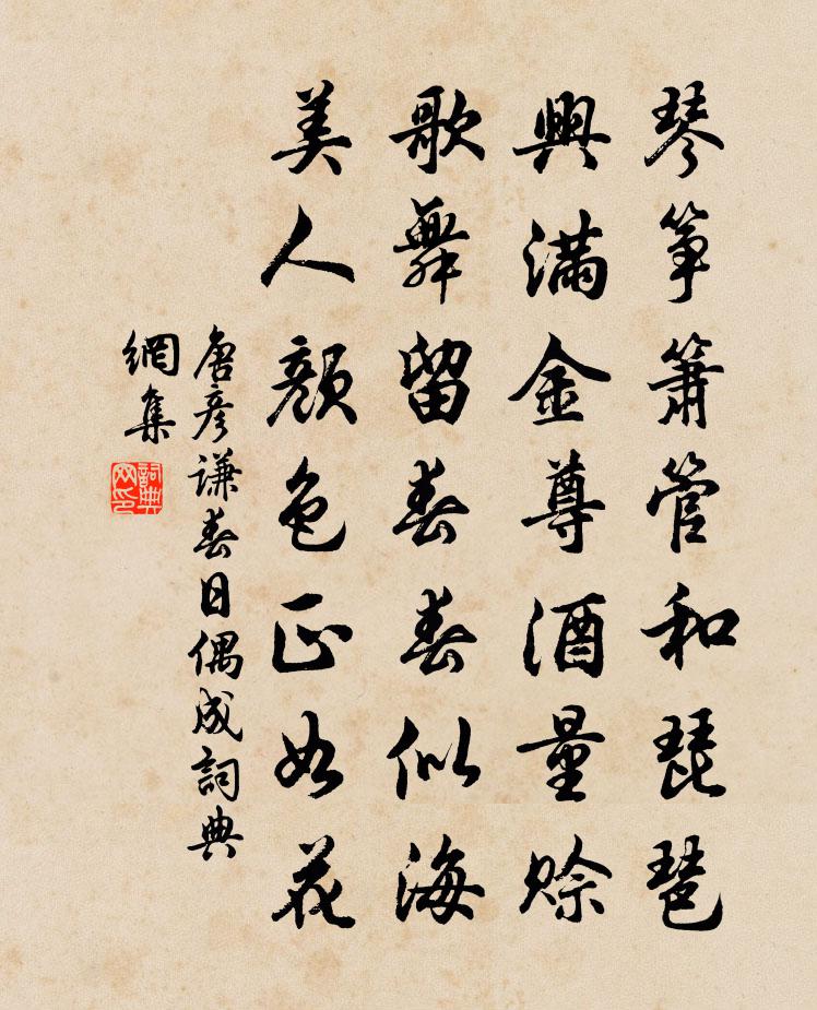 詩詞名句歷史字典書法欣賞書法字典國語詞典說文解字康熙字典古漢語字典標 題 作 者 詩 句 春日偶成作者:唐彥謙 朝代:唐代春日偶成原文琴箏簫管和琵琶,興滿金尊酒量賒。歌舞留春春似海,美人顏色正如花。詩詞問答問:春日偶成的作者是誰?答:唐彥謙問:春日偶成寫於哪個朝代?答:唐代問:春日偶成是什麼體裁?答:七絕唐彥謙春日偶成書法欣賞春日偶成書法作品注釋全唐詩:卷671-16詩詞推薦太子太保致仕李公輓辭二首蘇頌〔宋代〕子厚論先友,文章憶稚年。一時陪俊傑,四紀奉周旋。蘭玉高門盛,松筠晚歲堅。風流今已矣,感舊獨潸然。寧浦書事六首秦觀〔宋代〕洛邑太師奄謝,龍川僕射雲亡。他日巋然獨在,不知誰似靈光。闕題周南〔宋代〕天憐羈跡寄諸侯,付與危欄早得秋。相見便知懸榻意,闞亡時得挾書游。山容老去蒼崖在,水潦痕存淺碧收。高我傳上人丐鹽求頌釋正覺〔宋代〕瀕海人居不事田,生涯清白是家傳。雷鳴山麓潮橫雪,津出泥沙鹵泛蓮。冰玉色承熬煉力,蕨薇滋藉合和緣。舌頭以虎臂杖送李任道二首黃庭堅〔宋代〕未衰筋力先扶杖,能救衰年十二三。八百老彭嗟杖晚,可憐矍鑠馬征南。答友人趙嘏〔唐代〕詩家才子酒家仙,遊宦曾依積水邊。窗戶動搖三島樹,琴尊安穩五湖船。羅浮道士分瓊液,錦席佳人艷楚蓮。今日龐居士見馬祖釋了惠〔宋代〕孰是心空者,誰為選佛人。笊籬二尺柄,簸箕三寸唇。答陳傳道五首之一賀鑄〔宋代〕客子厭京塵,長街風眯目。安得臥南陽,清潭漬寒菊。黃石榴吾里所未有僕始攜自中都植之二年方著喻良能〔宋代〕但見蹙紅巾,未聞衣黃里。一試縷金裳,世職真西子。覽古衛宗武〔宋代〕治忽無常形,今古無常勢。必有非常人,以制非常世。南鄉子李之儀〔宋代〕睡起繞回塘。不見銜泥燕子忙。前日花梢都綠遍,西牆。猶有輕風遞暗香。步懶恰尋床。臥看遊絲到地長。自恨無棣華驛見楊八題夢兄弟詩白居易〔唐代〕遙聞旅宿夢兄弟,應為郵亭名棣華。名作棣華來早晚,自題詩後屬楊家。謝李端明惠李翰林集林季仲〔宋代〕江漢滔滔去不回,幾人留得詩名來。要須洗以千斛水,莫令胸臆生纖埃。清狂我愛李太白,亂之鷗鷺誰嫌猜。一生秋興王令〔宋代〕秋風吹人有高興,醉懷感物傷盛衰。秋來縱得蒿艾死,歲晚已非蘭蕙時。哀歌不入俗耳聽,大笑自與萬古期。長鴻嚴寬桂岩堂二絕句周必大〔宋代〕岩桂標名本在山,城居翻以桂為岩。香浮仙籍書生事,早拜恩袍映彩衫。哭李觀孟郊〔唐代〕志士琴不得老,琴多為直氣琴傷。阮公終日哭,壽命固難長。顏子既殂謝,孔門無輝光。文星落奇曜,寶劍摧修鋩贈樊著作白居易〔唐代〕陽城為諫議,以正事其君。其手如屈軼,舉必指佞臣。卒使不仁者,不得秉國鈞。元稹為御史,以直立其身。其心謁金門馮延巳〔唐代〕楊柳花陌,寶馬花嘶空無跡花。新著花荷衣人未識,年年江海客。夢覺巫山春色,醉眼花飛狼籍。起舞不辭無氣力奉和聖制謁玄元皇帝廟齋張九齡〔唐代〕興運昔有感,建祠北山巔。雲雷初締構,日月今悠然。紫氣尚蓊鬱,玄元如在焉。迨茲事追遠,輪奐復增鮮。洞府頌古三十一首釋原妙〔宋代〕落花台上重鋪錦,瑪瑙階前布赤沙。情義盡從貧處斷,世人偏向有錢家。名句推薦智者畏禍,愚者懼刑;言以誅人,刑之極也。來俊臣《羅織經·刑罰卷第十一》 慘慘時節盡,蘭葉復凋零。徐幹《室思》 忽然一夜清香發,散作乾坤萬里春。王冕《白梅》 豈知民力艱,顆米皆琳琅。黃燮清《秋日田家雜詠》 無錢休入眾,遭難莫尋親。佚名《增廣賢文·上集》 離恨又迎春,相思難重陳。和凝《菩薩蠻·越梅半拆輕寒里》 霜風漸欲作重陽,熠熠溪邊野菊香。蘇軾《捕蝗至浮雲嶺山行疲苶有懷子由弟二首·其二》 道不拾遺,民不妄取劉向《戰國策·秦一·衛鞅亡魏入秦》 把吳鉤看了,欄桿拍遍,無人會,登臨意。辛棄疾《水龍吟·登建康賞心亭》 錦江春色來天地,玉壘浮雲變古今。杜甫《登樓》