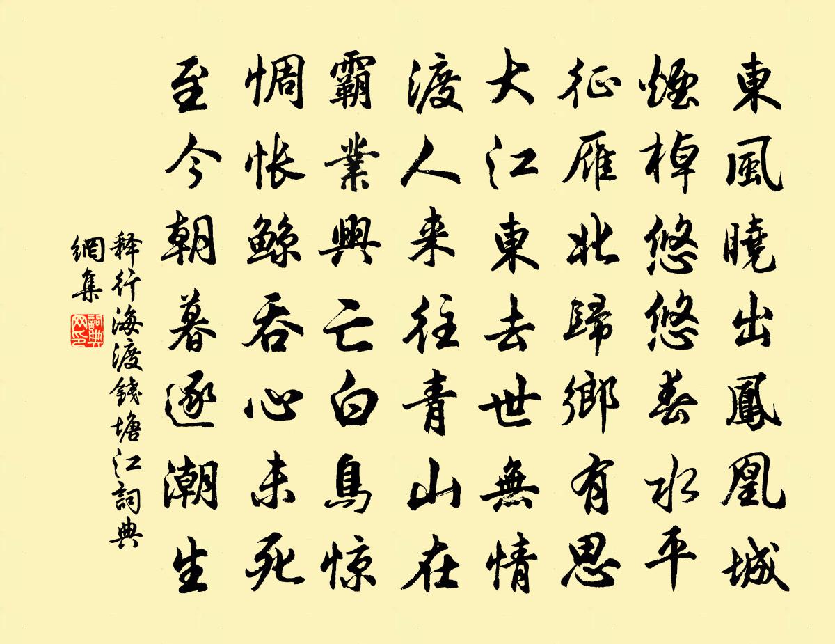 詩詞名句歷史字典書法欣賞書法字典國語詞典說文解字康熙字典古漢語字典標 題 作 者 詩 句 渡錢塘江作者:釋行海 朝代:宋代渡錢塘江原文東風曉出鳳凰城,煙棹悠悠春水平。征雁北歸鄉有思,大江東去世無情。渡人來往青山在,霸業興亡白鳥驚。惆悵鯨吞心未死,至今朝暮逐潮生。詩詞問答問:渡錢塘江的作者是誰?答:釋行海問:渡錢塘江寫於哪個朝代?答:宋代釋行海渡錢塘江書法欣賞渡錢塘江書法作品詩詞推薦洛陽道中黃庶〔宋代〕秋風滿巾衣,洛水行飲馬。山川氣象老,身若在士畫。嵩雲知客心,峰色如掃灑。荒草遍丘墟,沉吟動舒瀉。丙子兵禍台溫為烈寧海雖經焚掠然耕者不廢丁舒岳祥〔宋代〕白兔秋毫綻,青蟲樹色並。興亡誰與吊,聊復快新晴。西垣榴花晏殊〔宋代〕山木有甘實,托根清禁中。歲芳搖落盡,獨自向炎風。答王甫判官示遊興慶池之作黃庶〔宋代〕東池十里近,遭匝風物飽。南山若戶屏,登臨四時好。我初來長安,腳擬朝夕到。 * 簿書間,拘窘若囚盜。一歲秋山二首楊萬里〔宋代〕休道秋山索莫人,四時各自一番新。西風盡有東風手,柿葉楓林別樣春。滄洲亭懷古沈遼〔宋代〕湘水悠悠天際來,夾江古木抱山回。城中人物若可數,日晏市散多蒼苔。九嶷巉天古雲埋,遙想帝子龍車回。心衰遊仙四首曹勛〔宋代〕飛轡絡絕景,訪我同心人。解駕三秀嶺,濯足玉華津。晤言會良契,攜手凌高晨。揚旌出閶闔,羽節趣群真。入宴道中逢牧童跨牛者李流謙〔宋代〕田空已不耕,草瘦尚可齕。搰搰一歲勞,昨此休頃刻。阿童拍腹臥,短箠聽驅策。早晚穡事動,努力進芻粒。減字木蘭花李之儀〔宋代〕亂魂無據。黯黯只尋來處路。燈盡花殘。不覺長更又向闌。幾回枕上。那件不曾留夢想。變盡星星。一滴秋霖是一哀蜀人為南蠻俘虜五章初出成都聞哭聲雍陶〔唐代〕但見城池還漢將,豈知佳麗屬蠻兵。錦江南度遙聞哭,儘是離家別國聲。水龍吟(方外述懷)黃裳〔宋代〕五城中鎖奇書,世間睡里無人喚。家家自有,月中丹桂,朱衣仙子。能駐光陰,解留顏鬢,引君霄漢。便西歸、休孤館深沈權無染〔宋代〕瓊英雪艷嶺梅芳。天付與清香。向臘後春前,解壓萬花,先占東陽。擬待折、一枝相贈,奈水遠天長。對妝面、忍記雜畫□□□劉克莊〔宋代〕舜提歸□□,□□□□梁。束手無爭執,應慚此璽郎。將至海豐劉克莊〔宋代〕漁鹽舊俗慣恬熙,兵火新民脫亂離。石路樹陰三十里,今猶仿佛太平時。同水心吊薛子舒墓戴栩〔宋代〕自劚青雲去,長途墜玉鑣。有名天所吝,無病藥為妖。月斧千家寂,霓梭五色銷。夢靈虛吐鳳,數短實如鴞。筦庫題惠老松竹圖章甫〔宋代〕風細聲音互答,月明體用全彰。二士為君提唱,老僧無法商量。偈六首釋法智〔宋代〕一不成,二不是,火雲堆裹秋風起。堪笑耘田車水翁,手腳忙亂同兒戲。同兒戲,有巴鼻。但得豐年賀太平,四海游法雲陸游〔宋代〕放船三家村,進棹十字港。雲山互吞吐,水草遙莽蒼。沙鷗下拍拍,野鶩浮兩兩。蕭騷菰蒲中,小艇時來往。匡山頌趙州無字示陳太尉釋原妙〔宋代〕澄潭千載毒龍蟠,倒岳傾湫誰解看。直下一刀成兩段,虛空粉碎髑髏乾。偈傾一百六十九首釋智朋〔宋代〕碌碌復碌碌,良馬白日足。咬牙定關,掀翻地軸。神不敢呵,鬼不敢哭。世尊入地獄,調達出地獄。名句推薦笑殺陶淵明,不飲杯中酒。李白《嘲王歷陽不肯飲酒》 這次第,算人間沒個並刀,剪斷心上愁痕。黃孝邁《湘春夜月·近清明》 德不孤,必有鄰。孔子弟子《論語·里仁篇》 人生若只如初見,何事秋風悲畫扇。納蘭性德《木蘭花·擬古決絕詞柬友》 今古長如白練飛,一條界破青山色。徐凝《廬山瀑布》 昨日鄰家乞新火,曉窗分與讀書燈。王禹偁《清明》 日往菲薇,月來扶疏。左思《三都賦》 正護月雲輕,嫩冰猶薄。辛棄疾《瑞鶴仙·賦梅》 便做春江都是淚,流不盡,許多愁。秦觀《江城子·西城楊柳弄春柔》 明敕星馳封寶劍,辭君一夜取樓蘭。王昌齡《從軍行七首》