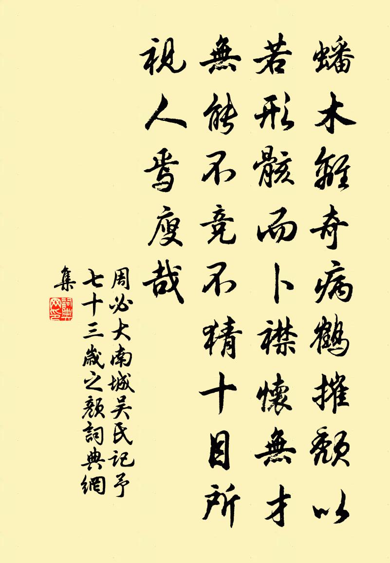 詩詞名句歷史字典書法欣賞書法字典國語詞典說文解字康熙字典古漢語字典標 題 作 者 詩 句 南城吳氏記予七十三歲之顏作者:周必大 朝代:宋代南城吳氏記予七十三歲之顏原文蟠木離奇,病鶴摧頹。以若形骸,而卜襟懷。無才無能,不競不猜。十目所視,人焉廋哉。詩詞問答問:南城吳氏記予七十三歲之顏的作者是誰?答:周必大問:南城吳氏記予七十三歲之顏寫於哪個朝代?答:宋代周必大南城吳氏記予七十三歲之顏書法欣賞南城吳氏記予七十三歲之顏書法作品詩詞推薦司空贈太傅康國韓公輓辭五首蘇頌〔宋代〕文物衣冠萃一門,如公終始見輿言。三登慶曆三人第,四入熙寧四輔尊。繼世拜封前及後,並時當政弟連昆。漢袁次韻子瞻題郭熙平遠二絕蘇轍〔宋代〕亂山無盡水無邊,田舍漁家共一川。行篇江南識天巧,臨窗開卷兩茫然。題新繁句氏盤溪句昌泰〔宋代〕從俗鮮所得,九牛中一毛。強牽麋鹿性,要學豹龍韜。野服顏常好,晴窗首自蚤。向來誤應聘,塵土污吾袍。滿江紅(甲午豫章和李思永)趙師俠〔宋代〕渺渺春江,迷望眼、蒲萄漲綠。春過也、蕭疏庭戶,寂寥心目。念遠不禁啼鴂鬧,愁多易遣修蛾蹙。向小窗、時把和李天麟秋懷五絕句楊萬里〔宋代〕雙井無人後山死,只今誰子定得燈。老夫言語渾無味,不但秋來面可憎。滿江紅劉將孫〔宋代〕千里酸風,茂陵客、鹹陽古道。宮門夜、馬嘶無跡,東關雲曉。牽上魏車將漢月,憶君清淚知多少。悵土花、三十送趙介之赴舂陵十首彭龜年〔宋代〕訪舊知俗非,好書與理近。氣味既如此,況復少畦畛。銘座六言二首劉克莊〔宋代〕象防跡露埋齒,麝以香聞割臍。群兒爭放紙鷂,老子寧為木雞。菩薩蠻謝逸〔宋代〕縠紋波面浮鸂涑力鳥,。蒲芽出水參差碧。滿院落梅香。柳梢初弄黃。衣輕紅袖皺。春困花枝瘦。睡起玉釵橫。隔和沈進可檢法秋夜飲客待月王之道〔宋代〕欲雨雲容合,瀕江水氣浮。笑談初入夜,燈火適逢秋。巧借三豪便,還成一醉謀。投瓊酬木李,只使老夫羞。過岳冠山二首李彌遜〔宋代〕岳冠山下月黃昏,石立波蠶勢莫分。回首風前魂欲斷,東西南北水邊雲。懷寄寇元弼王文舉十首之三出小市門賀鑄〔宋代〕小市門南路,舊遊聯馬行。只從前日別,秋草一番生。蕭文學山池宴集獨孤及〔唐代〕檀欒千畝綠,知是辟疆園。遠岫當庭戶,諸花覆水源。主人邀盡醉,林鳥助狂言。莫問愁多少,今皆付酒樽。春江行曹勛〔宋代〕浦嶼連芳草,夭桃間柳堤。征鴻下天際,游女過前溪。魚沒驚帆影,林疎見鳥啼。王孫聯繡騎,章子解香觽。吳姬調笑令佚名〔宋代〕花酒。滿筵有。酒滿金杯花在手。頭上戴花方飲酒。飲罷了高叉手。琵琶撥盡相思調。更向當筵舞袖。題涇縣水西寺李忱〔唐代〕大殿連雲接爽溪,鐘聲還與鼓聲齊。長安若問江南事,說道風光在水西。八月十日夜夢登青城最高峰醮仙迷惘醮罷同羽程公許〔宋代〕崷崒孤岑碧四圍,分明佳氣是祠西。星壇醮罷天如水,羽褐追游月滿溪。真境可容兵劫壞,在涯長恐夢魂迷。煙霞三月八日百五節林敬輿攜酒約盛元仁戴帥初方方回〔宋代〕生長西湖死葬湖,興言舟子與農夫。全家衣食憑搖櫓,歷世兒孫學荷鋤。布衲劣兼蓑笠有,虀湯恐並醬醯無。金盤四紋四時楊冠卿〔宋代〕輕風透幕羅衾薄,滿萼嬌紅綴小桃。明月對愁縈錦字,斷弦空暗紫檀槽。雙峰定水璘老送木犀香五首楊萬里〔宋代〕春得鄿江信,香從定水來。今年有奇事,正月木犀開。名句推薦日長睡起無情思,閒看兒童捉柳花。楊萬里《閒居初夏午睡起》 微陽下喬木,遠色隱秋山。馬戴《落日悵望》 無言暗將紅淚彈闌珊,香銷輕夢還納蘭性德《河傳·春淺》 不戚戚於貧賤,不汲汲於富貴。陶淵明《五柳先生傳》 器乏雕梁器,材非構廈材。趙彥昭《奉和元日賜群臣柏葉應制》 春風來不遠,只在屋東頭。于謙《除夜太原寒甚》 故人西辭黃鶴樓,煙花三月下揚州。李白《黃鶴樓送孟浩然之廣陵》 今宵絕勝無人共,臥看星河盡意明。陳與義《雨晴·天缺西南江面清》 力田已告成,計日宜收藏。黃燮清《秋日田家雜詠》 再折柳穿魚,賞梅催雪。詹玉《齊天樂·送童瓮天兵後歸杭》