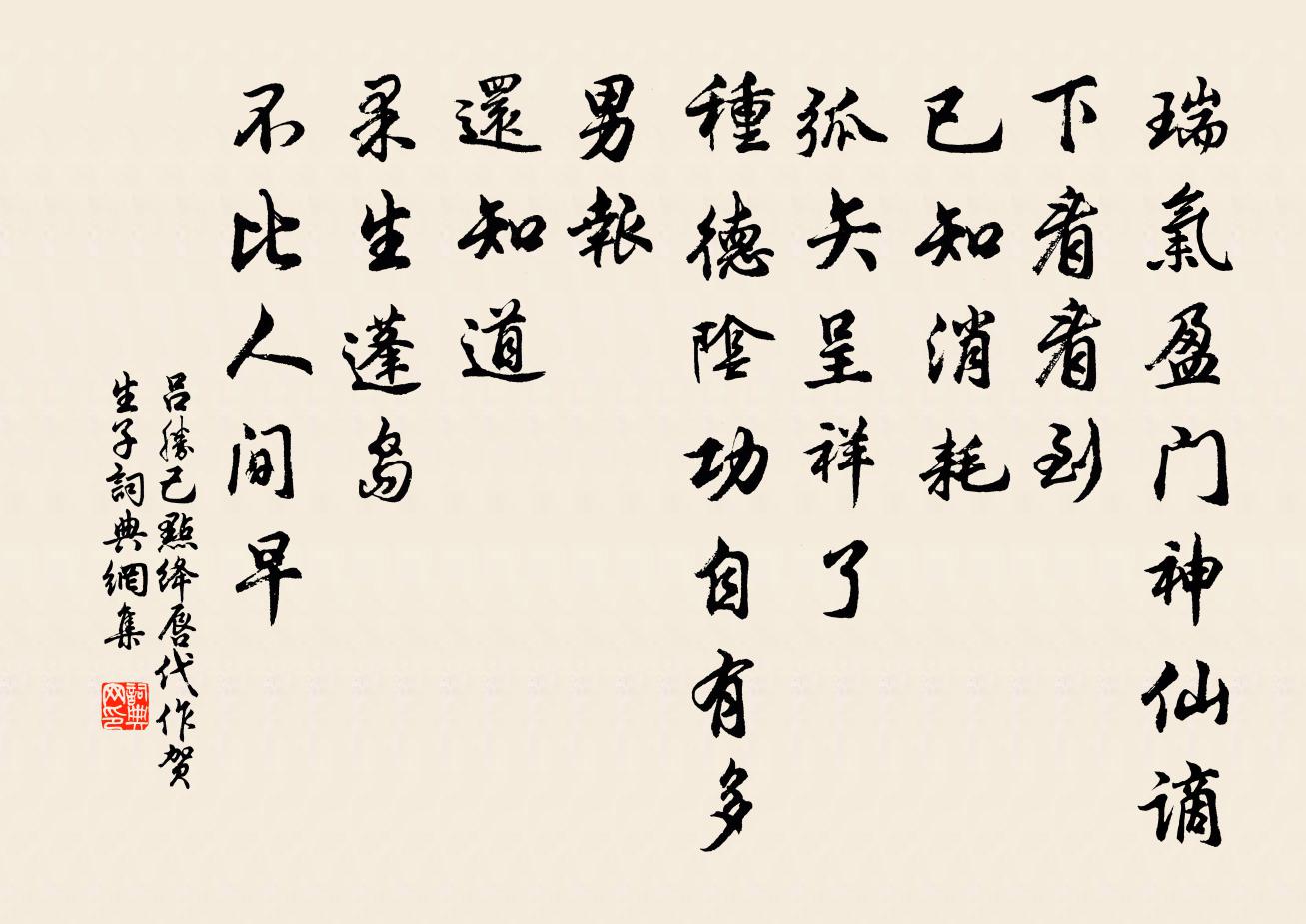 詩詞名句歷史字典書法欣賞書法字典國語詞典說文解字康熙字典古漢語字典標 題 作 者 詩 句 點絳唇(代作,賀生子)作者:呂勝己 朝代:宋代點絳唇(代作,賀生子)原文瑞氣盈門,神仙謫下看看到。已知消耗。弧矢呈祥了。種德陰功,自有多男報。還知道。果生蓬島。不比人間早。詩詞問答問:點絳唇(代作,賀生子)的作者是誰?答:呂勝己問:點絳唇(代作,賀生子)寫於哪個朝代?答:宋代問:點絳唇(代作,賀生子)是什麼體裁?答:詞呂勝己點絳唇(代作,賀生子)書法欣賞點絳唇(代作,賀生子)書法作品注釋劉夢得詩云:海中仙果子生遲。詩詞推薦讀書燈錢時〔宋代〕讀書燈,明暳暳,溪堂硬度人親送似。歷落平生未見書,與汝間關幾半世。幾年來,味無味,並與青編共捐棄。半重嘆董嗣杲〔宋代〕心知天地厭羈留,痴坐忘言不點頭。活脫世間泥塑樣,痴貽江表陸沉羞。思仙廨竹招蒼鳳,學老溪梅縛翠虬。歲晚古龍孺人曹氏輓詞林亦之〔宋代〕寒原何處哭,下馬欲銷魂。白日數行淚,黃柑十里村。傳家猶墨綬,聘婦盡朱門。似此何多恨,空漚不要論。次韻李漢老詩劉子翬〔宋代〕蒙莊嘆隙駒,孔聖悲逝川。百年生有涯,萬感情無邊。賢愚真唯阿,繫心同一緣。內熱蠱其中,伊誰肯求痊。樂哉登裴公亭借用杜牧之登齊山詩韻二首趙善括〔宋代〕風簾斜捲燕于飛,天氣清和酒力微。極目煙波無盡藏,關心春夢有時歸。香飄十里喧朝市,翠積千山斷晚暉。杖屨鷓鴣天辛棄疾〔宋代〕翦燭西窗夜未闌。酒豪詩興兩聯綿。香噴瑞獸金三尺,人插雲梳玉一彎。傾笑語,捷飛泉。觥籌到手莫留連。明朝舫齋王孝嚴〔宋代〕我本湖漘一漫郎,生來住處波茫茫。時尋畫舸破煙水,菰蒲滿路荷花香。一川窈窕詫紅蓼,兩岸蘆葦明秋霜。船頭亂後山中作杜荀鶴〔唐代〕自從天下亂,日晚別庭闈。兄弟團圞樂,羈孤遠近歸。文章甘世薄,耕種喜山肥。直待中興後,方應出隱扉。晨起裴吳二直講過門雲鳳閣韓舍人物故作五梅堯臣〔宋代〕昨時賓晏地,今見繐緯遮。棲室那因鵬,從杯不為蛇。曾無越人術,竟起漢臣嗟。明日東城陌,悲涼後部笳。木蘭花慢盧祖皋〔宋代〕翠陰春晝永,乍簾幕、暖飄香。正玉節來歸,斑衣戲舞,□□熒煌。椿期始開九秩,看芝蘭、奕葉早傳芳。都把一正月四日大雨不已愈暖不寒方回〔宋代〕吳山勝概甲杭州,正旦晴明到上頭。紅袖南人簪翡翠,金鞍北客驟驊騮。豐年似覺春尤好,新歲何為雨不休。自笑謁孔先生狄遵度〔宋代〕月出高樹枝,影動酒樽處。樹深月色薄,稍以燈火助。主人喜我過,斟酌亦云屢。於時幸無累,所談非近務。涼風少年游晏幾道〔宋代〕西樓別後,風高露冷,無奈月分明。飛鴻影里,搗衣砧外,總是玉關情。王孫此際,山重水遠,何處賦西征。金閨八聲甘州(感興)何夢桂〔宋代〕嘆人生聊爾,便晨風、翼倦也回飛。況自騎款段,欲追騏驥,千里安之。種得玄芝瑤草,不染滿頭絲。一醉梅花下金陵懷古江立信〔宋代〕勝地尚存龍虎氣,荒台已失鳳凰蹤。六朝文物山川古,霸氣終歸指雇中。和陳述古仙居岩老堂詩章望之〔宋代〕岩前未老客,期在老樵漁。撫俗多閒暇,開軒適起居。讀詩明治亂,學易體盈虛。頻許相從否,吾將當故廬。病中書懷衛博〔宋代〕平生技拙笑屠龍,去國尤慚易道東。回望飛雲親舍下,不堪伏枕左書空。四方未了男兒志,一飯長懷國士風。憐我【黃鐘】人月圓_為細君壽冷魏初〔元代〕為細君壽冷雲凍雪褒斜路,泥滑似登天。年來又到,吳頭楚尾,風雨江船。但教康健,心頭過得,莫論無錢。從今岣嶁山韓愈〔唐代〕岣嶁山尖神禹碑,字青石赤形模奇。科斗拳身薤倒披,鸞飄鳳泊拿虎螭。事嚴跡秘鬼莫窺,道人獨上偶見之,我來次韻八侄三首陳著〔宋代〕花開便是候催歸,濟楚生香清復微。遙想折來深院宇,似初勻粉小青衣。名句推薦眾鳥高飛盡,孤雲獨去閒。李白《獨坐敬亭山》 芳菲歇。故園目斷傷心切。向子諲《秦樓月·芳菲歇》 九月九日眺山川,歸心歸望積風煙。盧照鄰《九月九日玄武山旅眺》 人非人不濟,馬非馬不走,土非土不高,水非水不流。戴聖《大戴禮記·曾子制言上第五十四》 石溪久住思端午,館驛樓前看發機。盧肇《競渡詩 / 及第後江寧觀競渡寄袁州剌史成應元》 再折柳穿魚,賞梅催雪。詹玉《齊天樂·送童瓮天兵後歸杭》 遊子乍聞征袖濕,佳人才唱翠眉低。鄭谷《鷓鴣》 地勢,坤;君子以厚德載物。佚名《易傳·象傳上·坤》 遺廟丹青落,空山草木長。杜甫《武侯廟》 不義而富且貴,於我如浮雲。孔子弟子《論語·述而篇》