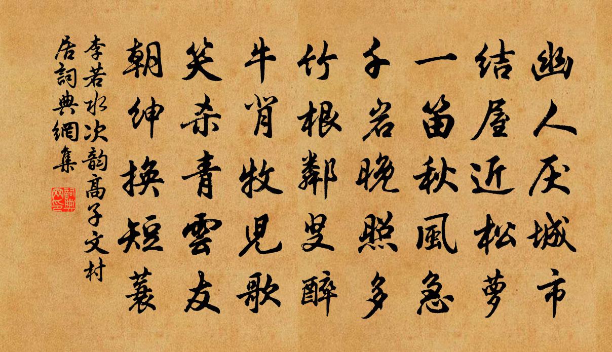 詩詞名句歷史字典書法欣賞書法字典國語詞典說文解字康熙字典古漢語字典標 題 作 者 詩 句 次韻高子文村居作者:李若水 朝代:宋代次韻高子文村居原文幽人厭城市,結屋近松蘿。一笛秋風急,千岩晚照多。竹根鄰叟醉,牛背牧兒歌。笑殺青雲友,朝紳換短蓑。詩詞問答問:次韻高子文村居的作者是誰?答:李若水問:次韻高子文村居寫於哪個朝代?答:宋代李若水次韻高子文村居書法欣賞次韻高子文村居書法作品詩詞推薦先公三池祠室學官相傳占為公署同年李南才毅李流謙〔宋代〕末俗何由到古人,傷心祠室漫史存。風榱雨棟那堪說,石刻污漫像設昏。寄賀鄭常侍李洞〔唐代〕山亦懷恩地,高禽盡下飛。吏穿霞片望,僧掃月棱歸。省拜墀煙近,林居玉漏微。曾令駐錫話,聊用慰攀依。寄畢叔文二首趙蕃〔宋代〕小園春物比如何,想見花稠草作窠。老去不能知許事,顧懷修碧可磨挲。所苦之中無以遣悶更堤題新竹別獻五章幸賜披李至〔宋代〕請公屈指數朱門,誰肯孜孜愛此君。小檻縱多栽紫艷,閒庭且要曳紅裙。三冬翠色終難犯,五月秋聲早已聞。不是定風波(三山送盧國華,約上元重來)辛棄疾〔宋代〕少日猶堪話別離。老來怕作送行詩。極目南雲無過雁。君看。梅花也解寄相思。無限江山行未了。父老。不須和淚東軒消海初開勸客酒二首邵雍〔宋代〕春色融融滿洛城,莫辭行樂慰平生。深思閒友開眉笑,重惜梅花照眼明。況是山翁差好事,可憐芳酒最多情。此時金沙亭金君卿〔宋代〕亭闞方池物物新,花中名品富長春。詩僧用意栽培處,四季常教有主人。城上夜宴白居易〔唐代〕留春不住登城望,惜夜相將秉燭游。風月萬家河兩岸,笙歌一曲郡西樓。詩聽越客吟何苦,酒別吳娃勸不休。從道秋思陸游〔宋代〕老子齋居罷擊鮮,木盤竹箸每隨緣。鄰僧不用分香缽,蓮芡猶堪過半年。同張明府游漊水亭李群玉〔唐代〕草色綠溪晚,梅香生縠文。雲天斂余霽,水木籠微曛。垂釣坐方嶼,幽禽時一聞。何當五柳下,酌醴吟庭筠。贈寓客還瓜州張昱〔元代〕把酒臨風聽棹聲,河邊官柳綠相迎。幾潮路到瓜州渡,隔岸山連鐵瓮城。月色夜留江叟笛,花枝春覆寺樓箏。贈行呂守之暮到三首錢時〔宋代〕此山風月久塵埃,拂試重新桂卻開。正要好詩相料理,昏鴉忽報守之來。四料簡奪人不奪境釋正覺〔宋代〕懶問誰持造化權,門前春事正暄妍。雨晴花色明如錦,風暖鶯聲滑似弦。滿庭芳侯善淵〔元代〕生喜亡悲,虛勞塵世,許年多少傾危。是非成敗,榮辱兩虧衰。富足於身大患,貧窮又、遣我寒飢。急如個,不來次韻春日即事六首洪皓〔宋代〕何腓百鳥獻花紅,懶似吾師有祖風。儒釋自來曾結社,不妨俱隱小堂中。擬楚詞李廌〔宋代〕匠執斤兮道周,稱百尋以弗用兮谷之幽。屈輪囷以為杯兮,孰謂賢於杞柳。揉吾性以矯真兮。寧全天以為壽。樂吾久不得池陽書劉克莊〔宋代〕黑幟遊魂尚未還,列城處處受風寒。遙知魯女悲而嘯,深愧龐公遺以安。道遠家人無恙否,時危身世苟全難。何時和陳侍郎韻寄題林尉肯堂陳淳〔宋代〕肯堂題扁自名公,表里須教實一同。門閱不夸車馬大,家聲端藉禮詩隆。熟仁便足膏粱味,殉義能傳清白風。終始偈頌一百零二首釋紹曇〔宋代〕顯大機,明大用。六月黃河連底凍。千聖不攜,已靈不重。帶角披毛異類行,漆桶漆桶。自悼薛令之〔唐代〕朝日上團團,照見先生盤。盤中何所有,苜蓿長闌乾。飯澀匙難綰,羹稀箸易寬。只可謀朝夕,何由保歲寒。名句推薦孝有三:大孝尊親,其次弗辱,其下能養。戴聖《禮記·祭義》 士不以利移、不為患改。劉向《說苑·談叢》 濤瀾洶湧,風雲開闔。蘇轍《黃州快哉亭記》 憶昨車聲寒易水,今朝,慷慨還過豫讓橋。陳維崧《南鄉子·邢州道上作》 少年心事當拿雲,誰念幽寒坐嗚呃。李賀《致酒行》 冬夜夜寒覺夜長,沉吟久坐坐北堂。李白《夜坐吟》 野竹分青靄,飛泉掛碧峰。李白《訪戴天山道士不遇》 白鳥一雙臨水立,見人驚起入蘆花。戴復古《江村晚眺》 惆悵南朝事,長江獨至今。劉長卿《秋日登吳公台上寺遠眺》 洛陽親友如相問,一片冰心在玉壺。王昌齡《芙蓉樓送辛漸》