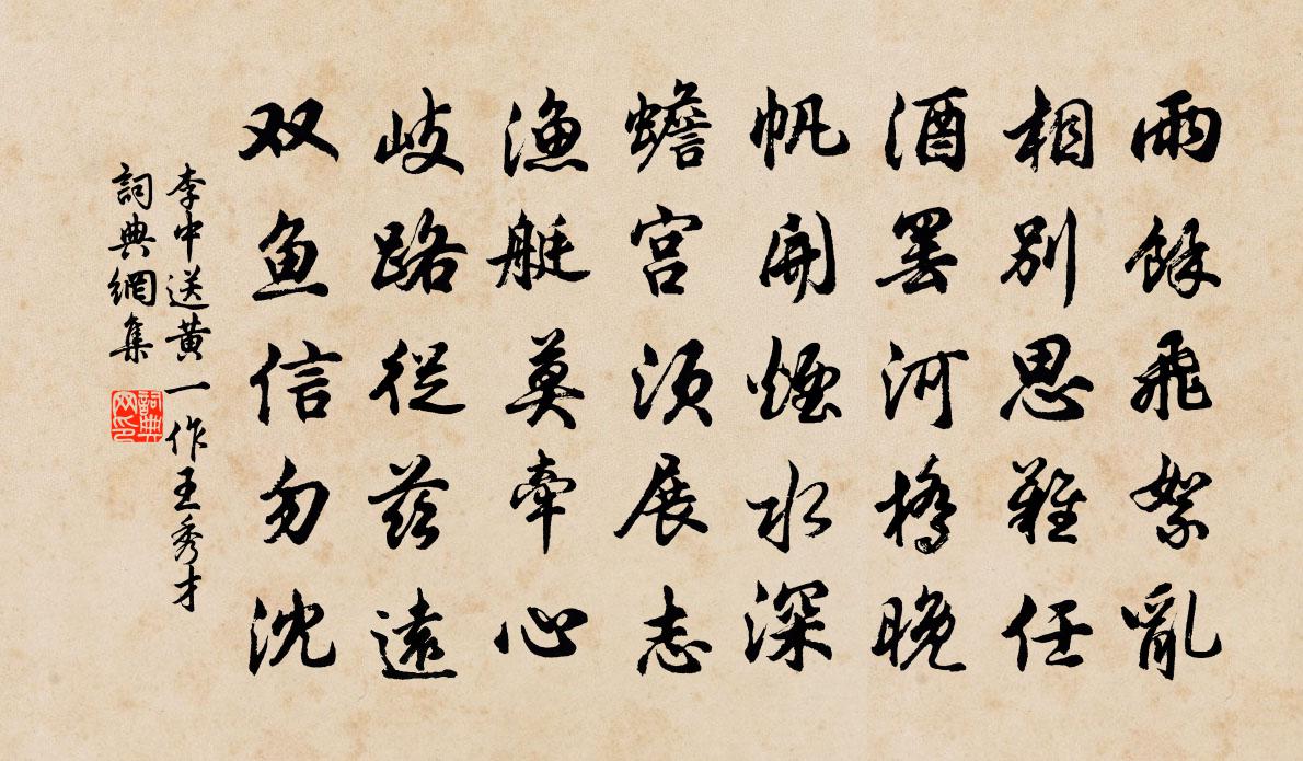 詩詞名句歷史字典書法欣賞書法字典國語詞典說文解字康熙字典古漢語字典標 題 作 者 詩 句 送黃(一作王)秀才作者:李中 朝代:唐代送黃(一作王)秀才原文雨余飛絮亂,相別思難任。酒罷河橋晚,帆開煙水深。蟾宮須展志,漁艇莫牽心。岐路從茲遠,雙魚信勿沈。詩詞問答問:送黃(一作王)秀才的作者是誰?答:李中問:送黃(一作王)秀才寫於哪個朝代?答:唐代李中送黃(一作王)秀才書法欣賞送黃(一作王)秀才書法作品注釋全唐詩:卷748-52詩詞推薦滴翠峰陳岩〔宋代〕春氣薰空草木浮,綠雲冉冉起山頭。嵐光浥翠濃於染,潤入衣襟冷欲秋。獵騎薛逢〔唐代〕兵印長封入衛稀,碧空雲儘早霜微。滻川桑落雕初下,渭曲禾收兔正肥。陌上管弦清似語,草頭弓馬疾如飛。豈知海棠高惟幾〔宋代〕故國庸岷外,孤根楚苑中。使梅林忌白,仙杏已饒紅。旋恐陽城破,尋尤下蔡空。幾時夢巫峽,獨立怨春風。妻侄師如石同婦見過晁公溯〔宋代〕古人重生孫,欲為王父屍。爾姑念爾祖,宰木今風悲。不得見爾生,況當逆婦歸。我獨賀乃翁,有婦能奉匜。食上紹興中興上復古詩張嵲〔宋代〕天監我宋,受命以人。咋為亂階,以啟聖人。皇帝嗣位,其仁如春。萬邦欣載,共惟帝臣。垂衣高拱,惟務儉勤。送孟延昌歸蘭溪陳傅良〔宋代〕典同周命士,律協漢諸郎。師友今千載,妻孥各一方。發從何處白,菊有去年黃。惜別無多語,關雎三斷章。和公實早行二首卷剛中〔宋代〕夢破事行李,窗燈尚半存。寒更傳古縣,落月暗孤村。道遠馬蹄薄,形勞神觀昏。高眠憶吾里,布被擁朝暾。六月朔日再會次韻與胡氏謙避暑戴表元〔宋代〕台屋深難暑,湖林近易風。高歌送長日,醉眼睨涼空。雀舌纖纖碧,雞頭淡淡紅。行藏數子別,談笑一樽同。晚花虞儔〔宋代〕花開春已去,春在此中藏。可恨芳菲晚,翻令氣味長。繁陰供翠幄,輕暑絢紅妝。莫起後時嘆,時來未遽央。送喬江州將漕江右岳珂〔宋代〕昔日東州看陣圖,武昌陸續拜魚書。我歸舊齒邦人版,公去新乘使者車。但原世官居鼎鼐,從教野老自犁鋤。西風詠齋詩李廌〔宋代〕古昔詩客長風騷,雲間野鶴鳴九皋。六丁極天十萬遭,攝提執策窮牛毛。玄珠罔象誰能及,或長壯麗稱雄豪。九原浣溪沙(方響)蘇軾〔宋代〕花滿銀塘水漫流。犀槌玉板奏涼州。順風環佩過秦樓。遠漢碧雲輕漠漠,今宵人在鵲橋頭。一聲敲徹絳河秋。至啟三伏之中苦熱尤甚連假之內度日且長忽辱李至〔宋代〕夷門山北是朱門,長有丹心感舊恩。魏勃更乖持故箒,曹參猶憶舊芳樽。梧桐影里蟬聲急,菡萏香中雨氣昏。應得渡興樂江望祝融林用中〔宋代〕今日溪雲迷小槎,層層錦浪映晴霞。須臾直至前村去,遙望群峰真可夸。謁吳傳正因贈孔武仲〔宋代〕宴坐足觀妙,朝歸還閉門。身居丞相第,室似人孤園。競逐浮雲駛,難揩古鏡昏。相期荷君厚,商榷有清言。次韻子由舍人先生追讀邇英絕句四首張耒〔宋代〕恭默誰聆金玉音,陶甄萬物付無心。君王好學真天意,憂國論思不厭深。雜曲歌辭。太和第二佚名〔唐代〕國鳥尚含天樂轉,寒風猶帶御衣香。為報碧潭明月夜,會須留賞待君王。詠竹劉孝先〔南北朝〕竹生荒野外,梢雲聳百尋。無人賞高節,徒自抱貞心。恥染湘妃淚,羞入上宮琴。誰能制長笛,當為吐龍吟。舟行六言陳造〔宋代〕風頭正帆影駛,雨腳轉天容開。黃雲覆野未極,青山趁人慾回。水調歌頭趙師俠〔宋代〕心景兩無著,情物豈能移。超然遠覽失笑,名利苦紛馳。一品官資榮顯,百萬金珠豪富,寬自喜家肥,會得箇中理名句推薦了卻君王天下事,贏得生前身後名。辛棄疾《破陣子·為陳同甫賦壯詞以寄之》 秋風別蘇武,寒水送荊軻。庾信《擬詠懷二十七首·其二十六》 雲里帝城雙鳳闕,雨中春樹萬人家。王維《奉和聖制從蓬萊向興慶閣道中留春雨中春望之作應制》 君子敬以直內,義以方外,敬義立而德不孤。佚名《易傳·文言傳·坤文言》 雷填填兮雨冥冥,猿啾啾兮狖夜鳴;屈原《九歌》 棹動芙蓉落,船移白鷺飛。蕭綱《採蓮曲》 千古江山,英雄無覓孫仲謀處辛棄疾《永遇樂·京口北固亭懷古》 榮所眾羨,亦引眾怨。來俊臣《羅織經·固榮卷第六》 廣陵城裡昔繁華,煬帝行宮接紫霞。曾棨《維揚懷古》 結交在相知,骨肉何必親。佚名《箜篌謠》