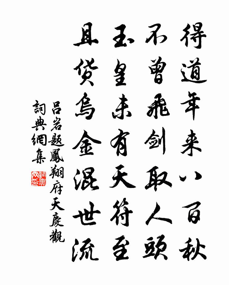 詩詞名句歷史字典書法欣賞書法字典國語詞典說文解字康熙字典古漢語字典標 題 作 者 詩 句 題鳳翔府天慶觀作者:呂岩 朝代:唐代題鳳翔府天慶觀原文得道年來八百秋,不曾飛劍取人頭。玉皇未有天符至,且貨烏金混世流。詩詞問答問:題鳳翔府天慶觀的作者是誰?答:呂岩問:題鳳翔府天慶觀寫於哪個朝代?答:唐代問:題鳳翔府天慶觀是什麼體裁?答:七絕呂岩題鳳翔府天慶觀書法欣賞題鳳翔府天慶觀書法作品注釋全唐詩:卷858-11詩詞推薦瑞龍吟周邦彥〔宋代〕章台路,還見褪粉梅梢,試華桃樹。愔愔坊陌人家,定巢燕子,歸來舊處。黯凝佇,因記個人痴小,乍窺門戶,侵沁園春陳人傑〔宋代〕詩不窮人,人道得詩,勝如得官。有山川草木,縱橫紙上,蟲魚鳥獸,飛動毫端。水到渠成,風來帆速,廿四中書怨郎詩卓文君〔兩漢〕一朝別後,二地相懸。只說是三四月,又誰知五六年?七弦琴無心彈,八行書無可傳。九連環從中折斷,十里長亭晚春即事二絕楊萬里〔宋代〕尺許新條長杏栽,文余班箏出牆隈。浪愁草草酴醾過,不道婷婷芍藥來。送陳戶曹之官襄陽二首劉克莊〔宋代〕幕府秋風事日生,參軍匹馬去兼程。起為楚舞何其壯,吟退胡兵在此行。且喜峴山碑有跋,不愁江表傳無名。老儒句葛公綽〔宋代〕為是山堂似草堂。贈梁將軍許渾〔唐代〕曾經黑山虜,一劍出重圍。年長窮書意,時清隱釣磯。高齋雲外住,瘦馬月中歸。唯說鄉心苦,春風雁北飛。酬薛奉禮見贈之作姚合〔唐代〕棲棲滄海一耕人,詔遣江邊作使君。山頂雨餘青到地,濤頭風起白連雲。詩成客見書牆和,藥熟僧來就鼎分。珍重次和花字韻酬正仲實父少白三友舒岳祥〔宋代〕不讀口生棘,多愁眼易花。江湖四閒客,今古幾詩家。吟是蠲憂藥,功如解困茶。艱難俱已歷,好景夕陽斜。水龍吟(雲麓新葺北墅園池)吳文英〔宋代〕好山都在西湖,斗城轉北多流水。屋邊五畝,橋通雙沼,平煙蘸翠。旋疊雲根,半開竹徑,鷗來須避。四時長把酒示子虡陸游〔宋代〕好學承家夙所奇,蠹編殘簡共娛嬉。一婚倘畢吾無累,三釜雖微汝有期。聿弟元知是難弟,德兒稍長豈常兒。要令晉靈公不君左丘明〔先秦〕 晉靈公不君。厚斂以雕牆。從台上彈人,而觀其辟丸也。宰夫胹熊蹯不熟,殺之,寘諸畚,使婦人載以過朝。雪中送黃希聲西歸陳起〔宋代〕可是歸心急,行裝冒雪夫。向來期重任,未可羨先鞭。人事虧盈月,煙波遠近船。明時困英特,此別又三年。贈邊縣尹何夢桂〔宋代〕君家久富五經儲,更有兒孫讀祖書。事究麟經明亥豕,理窮羲易得筌魚。枳業不是棲鸞處,花縣來觀展驥初。北道伯父《送先人下第歸蜀》詩云︰人稀野店休安蘇軾〔宋代〕乞墦何足羨,負米可忘艱。莫為無車馬,含羞入劍關。子猷訪戴圖謝幼謙〔宋代〕溪山雪夜本清奇,底事扁舟只憑歸。誰識去來皆興耳,歸時更好似來時。詩一首陳堯佐〔宋代〕雨網蛛絲斷,風枝鳥夢搖。詩家零落景,採拾合如樵。和石庵洪府理金沙酴醾牡丹二首何夢桂〔宋代〕洛茶欲放趁春忙,一架花添兩樣芳。倚檻白紅多侍女,臨軒黃紫是真王。只愁吳苑館娃老,無奈唐宮春恨長。說與駕部鄭郎中三十八丈尹貳東周榮加金紫谷以末派…因賀送鄭谷〔唐代〕香浮玉陛曉辭天,袍拂蒲茸稱少年。郎署轉曹雖久次,京河亞尹是優賢。縱游雲水無公事,貴買琴書有俸錢。今日淳熙二年發太上皇帝太上皇后冊寶十一首佚名〔宋代〕重翟出房,社衣被躬。委委佗佗,河潤山容。聖皇臨軒,聖母在宮。定受鴻名,興天無窮。名句推薦明年豈無年,心事恐蹉跎。蘇軾《守歲》 無一語,對芳尊。安排腸斷到黃昏。秦觀《鷓鴣天·枝上流鶯和淚聞》 浮雲終日行,遊子久不至。杜甫《夢李白二首·其二》 玉皇開碧落,銀界失黃昏。毛滂《臨江仙·都城元夕》 馬作的盧飛快,弓如霹靂弦驚。辛棄疾《破陣子·為陳同甫賦壯詞以寄之》 灞涘望長安,河陽視京縣。謝朓《晚登三山還望京邑》 清濁,小大,短長,疾徐,哀樂,剛柔,遲速,高下,出入,周疏,以相濟也。左丘明《左傳·昭公·昭公二十年》 斜風細雨作春寒。對尊前。朱淑真《江城子·賞春》 雁啼紅葉天,人醉黃花地,芭蕉雨聲秋夢裡。張可久《清江引·秋懷》 集中什九從軍樂,亘古男兒一放翁。梁啓超《讀陸放翁集》