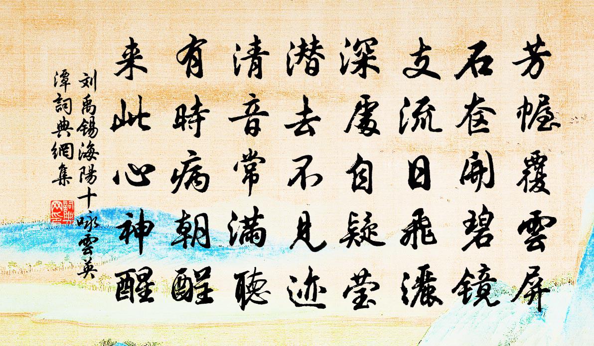 詩詞名句歷史字典書法欣賞書法字典國語詞典說文解字康熙字典古漢語字典標 題 作 者 詩 句 海陽十詠雲英潭作者:劉禹錫 朝代:唐代海陽十詠雲英潭原文芳幄覆雲屏,石奩開碧鏡。支流日飛灑,深處自疑瑩。潛去不見跡,清音常滿聽。有時病朝酲,來此心神醒。詩詞問答問:海陽十詠雲英潭的作者是誰?答:劉禹錫問:海陽十詠雲英潭寫於哪個朝代?答:唐代問:劉禹錫的名句有哪些?答:劉禹錫名句大全劉禹錫海陽十詠雲英潭書法欣賞海陽十詠雲英潭書法作品注釋全唐詩:卷355-45詩詞推薦題沅陵縣治廊軒趙蕃〔宋代〕昔我過此屋,四壁蔽莫窺。屋外何所有,榛草連污池。今我重來過,壁去檐竹垂。榛草既除屏,洿池出漣漪。檐前句諶祜〔宋代〕月行虛空閒,月影印在水。月落影還無,一笑人閒世。病中寄武公望二首廖行之〔宋代〕四十餘年尚轉蓬,渠論南北與西東。但知愛子三遷教,不辦謀生一畝宮。北海可憐真意廣,步兵良苦漫途窮。人生題陶淵明醉石陳光〔唐代〕片石露寒色,先生遺素風。醉眠芳草合,吟起白雲空。道出乾坤外,聲齊日月中。我知彭澤後,千載與誰同。聞角呈宗諭方蕙岩武衍〔宋代〕曉角吹愁客夢寒,一聲聲落曲屏閒。吳兒可殺無風味,老卻梅花只當閒。春夕寄友人時有與歌者南北羅鄴〔唐代〕芳徑春歸花半開,碧山波暖雁初回。滿樓月色還依舊,昨夜歌聲自不來。愁眼向誰零玉箸,征蹄何處駐紅埃。中宵重陽日即事李适〔唐代〕令節曉澄霽,四郊煙靄空。天清白露潔,菊散黃金叢。寡德荷天貺,順時休百工。豈懷歌鐘樂,思為君臣同。至化早春陪崔中丞浣花溪宴,得暄字張謂〔唐代〕旌節臨溪口,寒郊斗覺暄。紅亭移酒席,畫鷁逗江村。雲帶歌聲颺,風飄舞袖翻。花間催秉燭,川上欲黃昏。吳門秋懷賀鑄〔宋代〕吳門客鬢再經秋,城郭籃舁久倦遊。平靜松江三萬頃,不應無處著魚舟。示林侍者釋大觀〔宋代〕點墨如將當已長,長明白飯糝椒姜。出門相送都無說,堂下秋花自吐香。再贈陳季張拒霜花二首之二黃庭堅〔宋代〕倒著接?吾素風,當時酩酊似山公。且看小檻新花蕊,休泥他家晚菊叢。顧笑千金延客醉,解酲五斗為君空。歡娛拾諸公餘韻贈輝禪師兼奉答勾龍伯秋謁廣利輝王灼〔宋代〕舊飾蓮花座,新繙貝葉科。朝餐葷味少,夜誦篆煙多。不執鐵如意,睛偷金叵羅。猶堪試綿力,法海激頹波。詠月三首王安石〔宋代〕一片清光萬里兼,幾回圓極又纖纖。君看出沒非無意,豈為辛懃養玉蟾。對竹黃庚〔宋代〕門對南鄰竹,青青玉萬竿。雖然無地種,且得隔籬看。露葉晴猶濕,風枝夏亦寒。但教休剪伐,日用報平安。足虞叟兄句蘇泂〔宋代〕六月還當月盡休,今年節令卻齊頭。蕭蕭不待聽梧葉,一見銀河認得秋。齊天樂佚名〔宋代〕百龜香里龜鶯聲好,晴日暖風天氣。詩境春融,壺天晝永,今日祥開弧矢。疏龜約翠。想歌遏行雲,暖薰沉水。羽和李才甫先輩快閣五首黃庭堅〔宋代〕赤欄終日倚西風,山色挼藍小雨中。將老鬢毛秋著木,相思親舊水連空。漁父詞十三首蒲壽宬〔宋代〕明月愁人夜未央,篷窗如晝水浪浪。何處笛,起淒涼。梅花噴作一天霜。蝶戀花趙令畤〔宋代〕一夢行雲還暫阻。盡把深誠,綴作新詩句。幸有青鸞堪密付。良宵從此無虛度。兩意相歡朝又暮。爭奈郎鞭,暫指金蓮繞鳳樓趙佶〔宋代〕絳燭朱籠相隨映。馳繡轂、塵清香襯。萬金光射龍軒瑩。繞端門、瑞雷輕振。元宵為開聖景。嚴敷坐、觀燈錫慶。名句推薦歌泣不成天已暮,悲風日夜起江生。魏禧《登雨花台》 惟順於父母,可以解憂。孟子《孟子·萬章章句上·第一節》 休言女子非英物,夜夜龍泉壁上鳴。秋瑾《鷓鴣天·祖國沉淪感不禁》 亂之所生也,則言語以為階。佚名《易傳·繫辭傳上·第八章》 今朝此為別,何處還相遇。韋應物《初發揚子寄元大校書》 算陰晴,渾似幾番,渭城故人離會。吳文英《永遇樂·乙巳中秋風雨》 可憐報國無路,空白一分頭。楊炎正《水調歌頭·登多景樓》 水繞陂田竹繞籬,榆錢落盡槿花稀。張舜民《村居·水繞陂田竹繞籬》 願妾身為紅菡萏。年年生在秋江上。歐陽修《漁家傲·近日門前溪水漲》 卻憶安石風流,東山歲晚,淚落哀箏曲辛棄疾《念奴嬌·登建康賞心亭呈史致道留守》