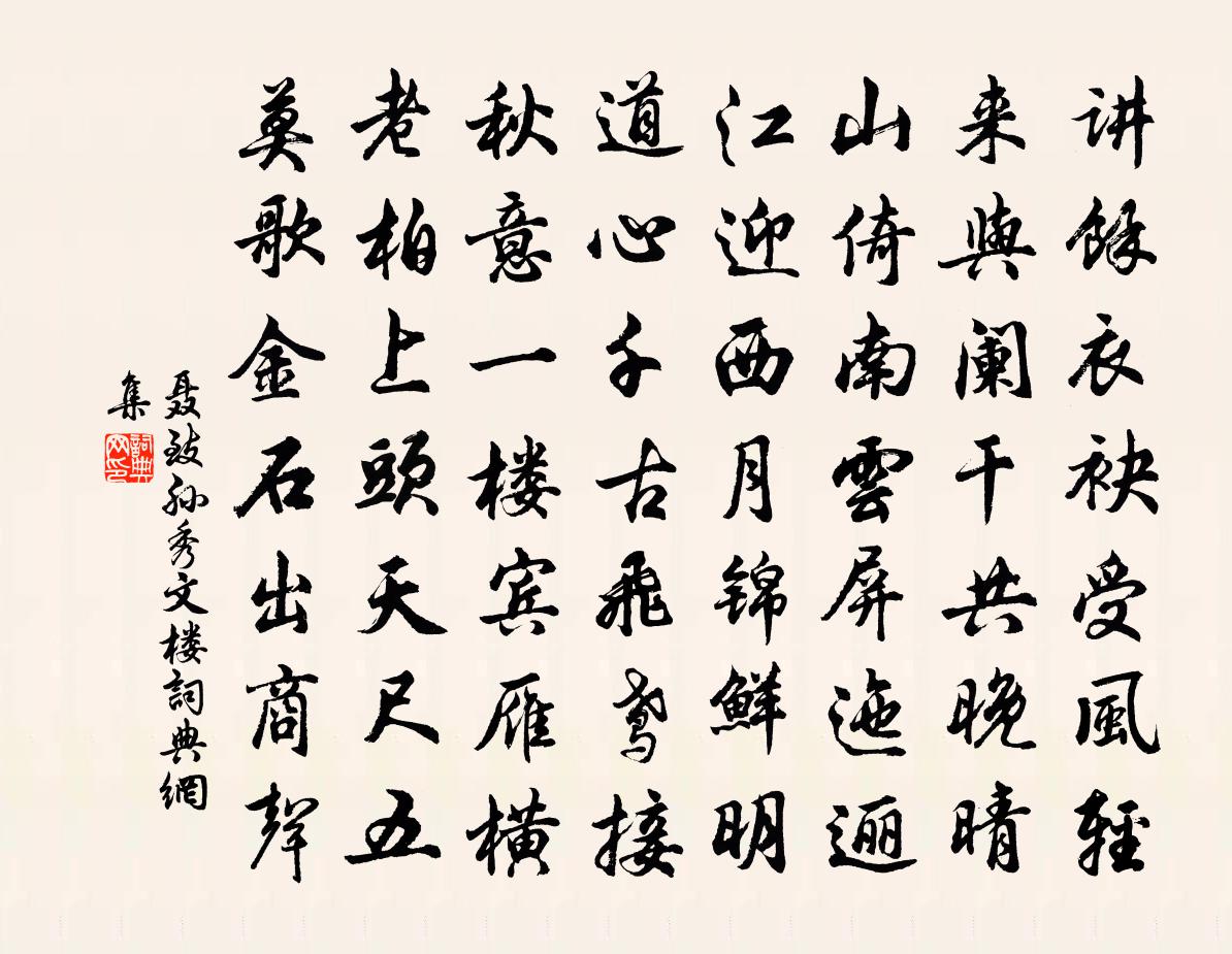 詩詞名句歷史字典書法欣賞書法字典國語詞典說文解字康熙字典古漢語字典標 題 作 者 詩 句 秀文樓作者:聶致孫 朝代:宋代秀文樓原文講餘衣袂受風輕,來與闌乾共晚晴。山倚南雲屏迤邐,江迎西月錦鮮明。道心千古飛鳶接,秋意一樓賓雁橫。老柏上頭天尺五,莫歌金石出商聲。詩詞問答問:秀文樓的作者是誰?答:聶致孫問:秀文樓寫於哪個朝代?答:宋代聶致孫秀文樓書法欣賞秀文樓書法作品詩詞推薦偈頌一百五十首釋心月〔宋代〕蜀山楚水,江北江南。步步穩密,念念相諳。前三三後三三,眨上眉毛早不堪。凜凜孤風藏不得,倒騎角虎出山來次胡濟鼎同年三律曹涇〔宋代〕五經為笥腹便便,千佛名高此作緣。貴仕直堪梅和鼎,貧交猥為酒供錢。連章秋月雁回翅,貯袖天香龍吐涎。舊話己未過太湖僧寺得宗汝為書寄山蕷白酒長韻詩黃庭堅〔宋代〕從學晚聞道,謀官無見功。早衰觀水鑒,內熱愧鄰邦。比鄰有宗侯,治劇乃雍容。摩手撫鰥寡,蒿碪磔強梁。桃李內翰程端明輓詩方岳〔宋代〕倒瀉銀河洗肺肝,初傳冰句落人間。吾州誰繼龍溪老,內相寧論豹尾斑。汲冢以來書盡讀,商盤而上筆追還。豈無吳苑思陳陶〔唐代〕今人地藏古人骨,古人花為今人發。江南何處葬西施,謝豹空聞采香月。判府蒲左丞寵贈佳篇謹次韻朱長文〔唐代〕高文大冊耀天衢,新句鏘金擲隱居。廊廟方將歸輔弼,江湖猶復念耕漁。百城草木知威望,一代賢能入薦書。近日過婺港李洪〔宋代〕已辭悍石嚴灘險,稍快平波婺港行。夜宿喜逢漁酒市,南風拂面月朧明。擬古沈與求〔宋代〕日月雙高懸,朝昏自升沉。有如轉轆轤,引絙環相尋。而我生其間,所閱幾古今。爾來三十年,又作裘氏吟。眠飯因石令君行有感成古詩一章呈丞尉二丈不知退劉宰〔宋代〕絕代有佳人,潔齊處深宮。組識成文章,黼黻可帝躬。蘭菊媚幽姿,桃李自春風。出門非所識,所識非所從。婉孌次韻吉老十小詩黃庭堅〔宋代〕斲鼻昔常爾,絕弦知者稀。無人與爭長,惟有釣魚磯。九鎖山十詠大滌洞呂同老〔宋代〕巍巍元蓋天,岩穴閟仙宅。別戶穿虛明,層輝盪空碧。神鼓振玉音,丹崖落瓊液。深道潛龍井,外障隔凡石。緬懷謁蘇州守劉過〔宋代〕十年狂盪客征途,歸為文章未剖符。引臂欲攀天上月,回身卻礙日中烏。窮愁自是真男子,慷慨須投大丈夫。聞道寄鄉中親友二首陳造〔宋代〕棋酒游從嘆離群,酒慶吟筆漫飛塵。潮乎可奈才力老,甫也尚為南北人。主人不隨秋雁到,流年倏復野梅新。南崗四安道中所見牟巘五〔宋代〕每羨向平婚嫁了,恣游五嶽可曾回。也應未斷塵緣在,依舊挑包科浙來。晨雨陸游〔宋代〕揮汗驅蚊廢夜眠,清晨一雨便翛然。涼生池閣衣巾爽,潤入園林草木鮮。青蒻雲腴開斗茗,翠甖玉液取寒泉。飯余莊居野行姚合〔唐代〕客行野田間,比屋皆閉戶。借問屋中人,盡去作商賈。官家不稅商,稅農服作苦。居人盡東西,道路侵壟畝。采玉新構亭台,示諸弟侄白居易〔唐代〕平台高數尺,台上結茅茨。東西疏二牖,南北開兩扉。蘆簾前後卷,竹簟當中施。清冷白石枕,疏涼黃葛衣。開衿舟行次南都遇雨鄭獬〔宋代〕雨聲飄斷忽南去,雲勢旋生從北流。料得涼風訊息近,蕭蕭只在柳梢頭。余壯歲嘗假居塔山寺後三十年重到賦二絕姜特立〔宋代〕故山重到思依依,不見霜眉雪頂師。三十年間真一夢,夜檠猶記讀書時。富池祠李流謙〔宋代〕蕭何識信在逡巡,此事從來妙若神。不是將軍難著眼,正應黃祖是凡人。名句推薦善政得民財,善教得民心。孟子《孟子·盡心章句上·第十四節》 上智不教而成,下愚雖教無益,中庸之人,不教不知也。顏之推《顏氏家訓·教子篇》 去年折贈行人遠,今年恨、依然縴手。吳文英《花心動·柳》 春已歸來,看美人頭上,裊裊春幡。辛棄疾《漢宮春·立春日》 田舍清明日,家家出火遲。王建《寒食》 來如春夢幾多時?去似朝雲無覓處。白居易《花非花》 錦江近西煙水綠,新雨山頭荔枝熟。張籍《成都曲》 貂不足,狗尾續。房玄齡《晉書·列傳·第二十九章》 窮愁千萬端,美酒三百杯。李白《月下獨酌四首》 順天者存,逆天者亡。孟子《孟子·離婁章句上·第七節》