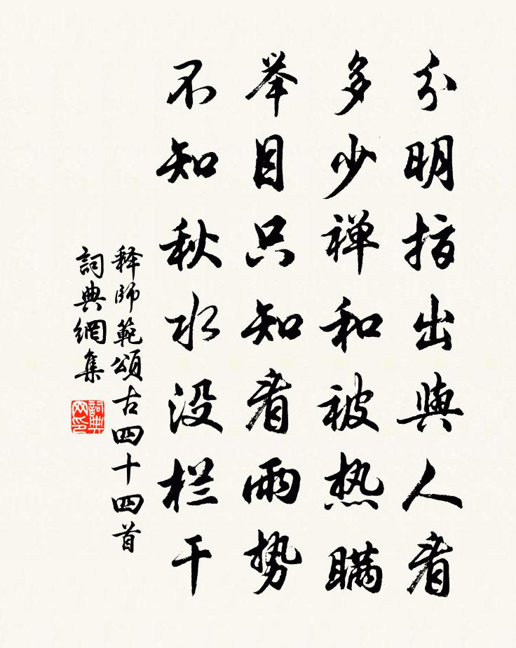 詩詞名句歷史字典書法欣賞書法字典國語詞典說文解字康熙字典古漢語字典標 題 作 者 詩 句 頌古四十四首作者:釋師範 朝代:宋代頌古四十四首原文分明指出與人看,多少禪和被熱瞞。舉目只知看雨勢,不知秋水沒欄乾。詩詞問答問:頌古四十四首的作者是誰?答:釋師範問:頌古四十四首寫於哪個朝代?答:宋代釋師範頌古四十四首書法欣賞頌古四十四首書法作品詩詞推薦水調歌頭(七夕)姚述堯〔宋代〕三五半圓夜,二七素秋天。銀河耿耿,中渡絳節會星軿。寶鵲喜傳佳信,丹鳳歡迎仙仗,瑞彩映珠躔。此意天長久踏莎行陳德武〔宋代〕霧失南樓,雲低東閣。枝頭不見南飛鵲。姮娥何事太多情,今宵故誤年時約。天易陰晴,人多哀樂。從來此事難憑東郎山曹鄴〔唐代〕東郎屹立向東方,翹首朝朝候太陽。一片丹心存萬古,誰雲坐處是遐荒?褭娜(丁卯年作)韓偓〔唐代〕褭娜腰肢淡薄妝,六朝宮樣窄衣裳。著詞暫見櫻桃破,飛盞遙聞豆蔻香。春惱情懷身覺瘦,酒添顏色粉生光。此時秋月望上陽宮劉滄〔唐代〕苔色輕塵鎖洞房,亂鴉群鴿集殘陽。青山空出禁城日,黃葉自飛宮樹霜。御路幾年香輦去,天津終日水聲長。此時途中賦落梅周南〔宋代〕一段幽奇破臘忙,只將遲暮了年光。從教籬落飄零盡,也勝房櫳半面妝。華清宮楊正倫〔宋代〕休罪明皇與貴妃,大都衰盛兩相隨。惟憐一派溫泉水,不逐人心冷暖移。海棠周弼〔宋代〕海棠最佳須老叢,遠及百年花始紅。歷看名葩此為盛,剛柯硬葉交相映。倚石攢青二三丈,雨膏倒吸胭脂上。仿佛送謝錄事之越孟浩然〔唐代〕清旦江天迥,涼風西北吹。白雲向吳會,征帆亦相隨。想到耶溪日,應探禹穴奇。仙書倘相示,予在北山陲。賦詩二首呈懶翁白玉蟾〔宋代〕驚秋鏡里鬢邊星,到處溪山皆洞庭。怒雨打蓮欹沼綠,顛風掣竹過牆青。趁船紫燕辭芹渚,縮頸白鷗眠蓼汀。荷笠烏麻賈似道〔宋代〕烏麻頭路透銀絲,項闊毛班肉帶黑。更若翅烏牙鉗赤,得遇此蟲真有益。富陽南樓望浙江風起張南史〔唐代〕南樓渚風起,樹杪見滄波。稍覺征帆上,蕭蕭暮雨多。沙洲殊未極,雲水更相和。欲問任公子,垂綸意若何。採珠歌張伯端〔宋代〕貧兒衣中珠,本自圓明好。不會自尋求,卻數他人寶。數他寶,終無益,只是教君空費力。爭如認取自家珍,價值戰掉醜奴兒馬鈺〔元代〕茶來酒去人情事,匪道根由。惟獻惟酬。酒去無茶回奉休。便為讎。憐貧設粥非求報,建德如偷。更好真修。定是山中文天祥〔宋代〕倏忽當年遇,蒙茸幾度披。水霞明畫卷,草樹幻騷詞。鳥過目不瞬,江流意自遲。世人空黑白,一色看坡棋。故市王洋〔宋代〕樵牧無人記故侯,崎崎林壑水經邱。道傍若問五承福,應嘆人間萬事休。柳梢青(釣台。紹興甲子赴試南宮登此,今三十三年矣)袁去華〔宋代〕一水縈迴。參天古木,夾岸蒼崖。三十三年,客星堂上,幾度曾來。眼看變化雲雷。分白首、煙波放懷。細細平章次韻季申樞宇萬象亭李彌遜〔宋代〕丈人手筆與仟通,點化虛無若轉蓬。妙寄七言千嶂外,全收萬象一檐中。深堂細篆觀澄水,落日危欄數去鴻。更壓和鄧成材五絕鄧肅〔宋代〕句法徒能泣鬼神,文窮欲餞嘆無因。臨存多謝知音鮑,為洗胸中萬斛塵。夜坐油盡戲作陸游〔宋代〕金樽畫燭少年豪,白首孤燈不厭勞。夜漏雖深書未竟,半缸誰與續殘膏?名句推薦砧杵敲殘深巷月,井梧搖落故園秋。陸游《秋思》 辭之待骨,如體之樹骸;情之含風,猶形之包氣。劉勰《文心雕龍·風骨》 綠蟻新醅酒,紅泥小火爐。白居易《問劉十九》 牛困人飢日已高,市南門外泥中歇。白居易《賣炭翁》 溫故,而知新,敦厚以崇禮。子思《中庸·第二十七章》 時危見臣節,世亂識忠良。鮑照《代出自薊北門行》 桃李春風一杯酒,江湖夜雨十年燈。黃庭堅《寄黃幾復》 合意客來心不厭,知音人聽話偏長。馮夢龍《警世通言·卷一》 好問則裕,自用則小佚名《尚書·商書·仲虺之誥》 但使情親千里近,須信。無情對面是山河。辛棄疾《定風波·席上送范廓之游建康》