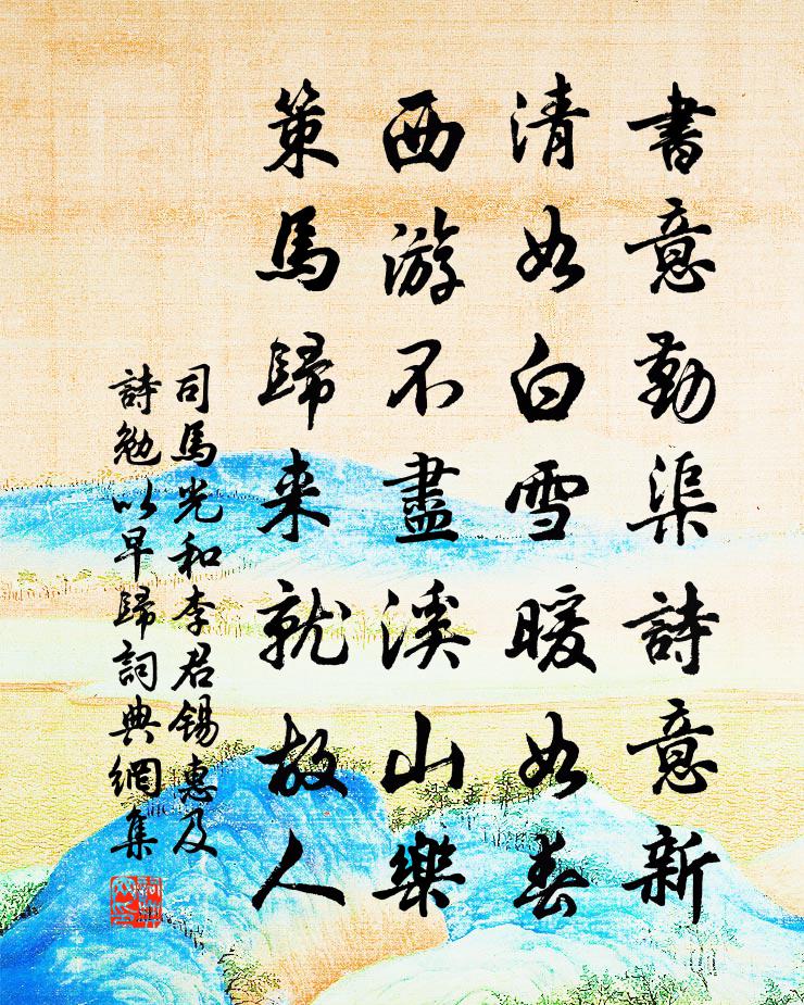 詩詞名句歷史字典書法欣賞書法字典國語詞典說文解字康熙字典古漢語字典標 題 作 者 詩 句 和李君錫惠及詩勉以早歸作者:司馬光 朝代:宋代和李君錫惠及詩勉以早歸原文書意勤渠詩意新,清如白雪暖如春。西遊不盡溪山樂,策馬歸來就故人。詩詞問答問:和李君錫惠及詩勉以早歸的作者是誰?答:司馬光問:和李君錫惠及詩勉以早歸寫於哪個朝代?答:宋代問:司馬光的名句有哪些?答:司馬光名句大全司馬光和李君錫惠及詩勉以早歸書法欣賞和李君錫惠及詩勉以早歸書法作品詩詞推薦次韻何文縝墨梅二絕張子文〔宋代〕仙衣雲樣拂輕緇,林下神情特地宜。妒婦津頭風恐急,壞妝聊為變冰姿。和段校書冬夕寄題廬山劉得仁〔唐代〕名高身未到,此恨蓄多時。是夕吟因話,他年必去隨。嘗聞廬岳頂,半入楚江湄。幾處懸崖上,千尋瀑布垂。爐峰送趙君十絕汪莘〔宋代〕風雨黃昏自掩扉,燈前時復一噓欷。兒曹相問緣何事,為道君侯早晚歸。三日侍華光殿曲水宴代人應詔詩 六謝朓〔南北朝〕文教已肅。武節即馳。榮光可照。合璧如規。載懷姑射。尚想瑤池。濯龍乃飾。天淵在斯。和較藝將畢歐陽修〔宋代〕槐柳來時綠未勻,開門節物一番新。踏青寒食追游騎,賜火清明忝侍臣。拂面蜘蛛占喜事,入簾蝴蝶報家人。莫瞠溫其示梅詩用韻為謝兼簡士特李處權〔宋代〕可喜劉郎鬢未霜,能容宋玉近東牆。自知老眼無春事,誰意窮途得放光。前日桃園真有路,何時蘭室可無香。便須和人過韓柱國廟一首尹洙〔宋代〕隋氏一宇內,三將皆勇夫。賀公活以累,楊素死有誅。賢哉韓柱國,身與功名俱。廟食垂後世,祀典誠有諸。荒忽鄭漕生辰仲並〔宋代〕象緯祥光動,門弧瑞氣盈。小陽春在序,幾望月偏明。他日三千牘,清時九萬程。名因使粵重,功自備吳成。偉量桃源關韙〔宋代〕流水洞門三數里,落花松逕幾千年。山南蜀國新開路,洞下秦人舊種田。東山精舍戲書釋紹嵩〔宋代〕迥磧沙銜日,荒溪眾樹分。行人隨旅雁,尋寺入幽雲。遠岫林間見,啼鶯夢裹聞。湖山雖不語,心緒已紛紛。沁園春(早春)曹勛〔宋代〕春點菸紅,露晞新綠,土膏漸香。散懶慵情性,尋幽選靜,一筇煙雨,幾處松篁。恨我求閒,已成遲暮,石淺泉甘送王定國通判河南陳師道〔宋代〕孤身十載客都城,白社雙林諱姓名。授館不為他日計,解衣真出故人情。翹材必定延枚叟,宣室終須記賈生。萬里試劍池楊備〔宋代〕 * 凝霜照水寒,當時人匣便迴鑾。岩前片石猶中斷,切玉如泥也不難。古相思曲·其二佚名〔兩漢〕十三與君初相識,王侯宅里弄絲竹。只緣感君一回顧,使我思君朝與暮。再見君時妾十五,且為君作霓裳舞。可嘆憶揚州徐凝〔唐代〕蕭娘臉薄難勝淚,桃葉眉尖易覺愁。天下三分明月夜,二分無賴是揚州。贈僧曹汝弼〔宋代〕一從叨命服,乘興入天台。院接石橋住,門臨瀑布開。松閒應獨坐,雪裡更誰來。時復攜藜杖,看雲上古台。萬年歡晁補之〔宋代〕憶惜論心,盡青雲少年,燕趙豪俊。二十南遊,曾上會稽千仞。捐袂江中往歲,有騷人、蘭蓀遺韻。嗟管鮑、當日雲門寺訪靈一上人劉長卿〔唐代〕所思勞日夕,惆悵去西東。禪客知何在,春山到處同。獨行殘雪裡,相見白雲中。請近東林寺,窮年事遠公。西郊即事三首廖行之〔宋代〕曉行出日歸流螢,二童一馬塵蒙纓。道傍老翁笑相語,道上夫子真勞生。有田觀我奉甘旨,無技聳世難公卿。從渠次韻蒲大受書懷十首郭印〔宋代〕茅檐同廣廈,野蔌當珍羞。擬作蓑衣放,寧為肉食謀。沉思如有得,寡慾自無求。嘆息吾衰甚,年來不夢周。名句推薦家國興亡自有時,吳人何苦怨西施。羅隱《西施》 誰念文園病客?夜色沉沉,獨抱一天岑寂。張埜《奪錦標·七夕》 波面澄霞,蘭艇采香去。高觀國《祝英台近·荷花》 雪似梅花,梅花似雪。似和不似都奇絕。呂本中《踏莎行·雪似梅花》 男兒西北有神州,莫滴水西橋畔淚。劉克莊《玉樓春·戲林推》 長水塘南三日雨,菜花香過秀州城查慎行《曉過鴛湖》 玉容寂寞淚闌乾,梨花一枝春帶雨。白居易《長恨歌》 胡風吹代馬,北擁魯陽關。李白《豫章行》 雪照山城玉指寒,一聲羌管怨樓間。劉著《鷓鴣天·雪照山城玉指寒》 畫樓洗淨鴛鴦瓦,彩繩半濕鞦韆架。王元鼎《醉太平·寒食》