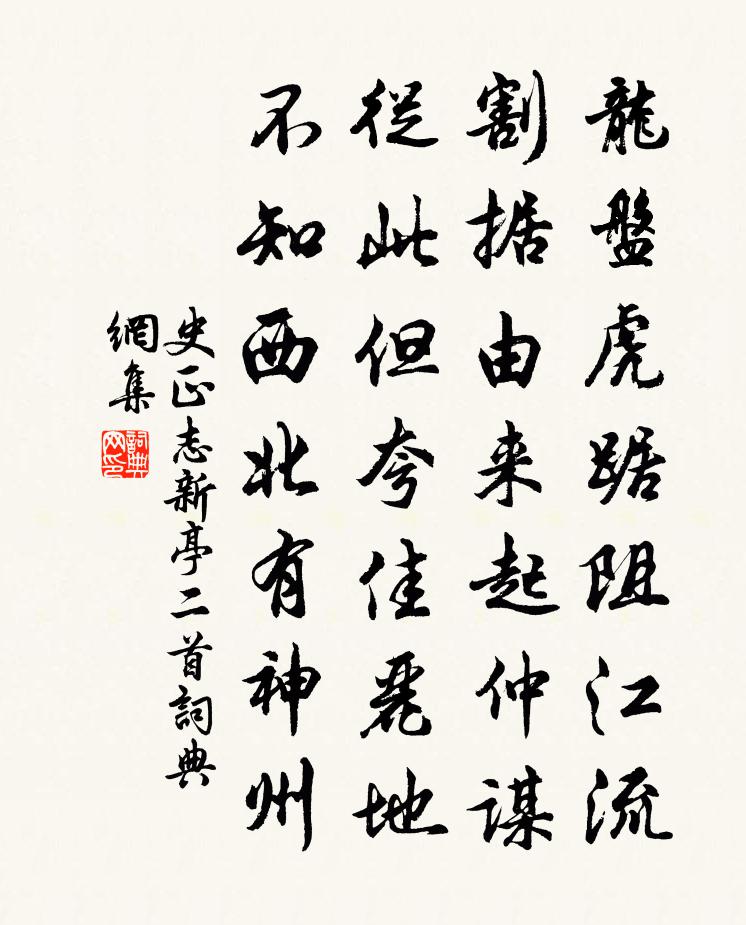 詩詞名句歷史字典書法欣賞書法字典國語詞典說文解字康熙字典古漢語字典標 題 作 者 詩 句 新亭二首作者:史正志 朝代:宋代新亭二首原文龍盤虎踞阻江流,割據由來起仲謀。從此但夸佳麗地,不知西北有神州。詩詞問答問:新亭二首的作者是誰?答:史正志問:新亭二首寫於哪個朝代?答:宋代史正志新亭二首書法欣賞新亭二首書法作品詩詞推薦邳州汪元量〔宋代〕身如傳舍任西東,夜榻荒郵四壁空。鄉夢漸生燈影外,客愁多在雨聲中。淮南火後居民少,河北兵前戰鼓雄。萬里小重山蔣捷〔宋代〕晴浦溶溶明斷霞。樓台搖影處,是誰家。銀紅裙襉皺宮紗。風前坐,閒斗鬱金芽。人散樹啼鴉。粉團黏不住,舊繁和鄭自正長官陳宓〔宋代〕讀書尚友古人賢,一日逢君勝一年。可嘆常時成獨學,喜於今日得師傳。身居吏鞅供塵底,心在風雲沂水邊。雖有劉相公中書江山畫障岑參〔唐代〕相府征墨妙,揮毫天地窮。始知丹青筆,能奪造化功。瀟湘在簾間,廬壑橫座中。忽疑鳳凰池,暗與江海通。粉白靈龜泉上黃庭堅〔宋代〕大靈壽日月,化石皖公陂。偶無斧斤尋,不作宰上碑。傾首若有謂,指泉來自西。泉甘崖木老,坐嘯欲忘歸。風流朝退偶題王禹偁〔宋代〕吏隱金門祗似閒,退朝窮巷懶開關。經年不到公卿宅,五日空隨侍從班。禁漏出花寒歷歷,御泉通市細潺潺。功名寒山背身立贊釋智遇〔宋代〕罵豐乾,是者漢。竹筒盛菜查,指出教人見。共實只要知機,不欲彰頭露面。西江月晁端禮〔宋代〕洛浦神仙流品,姑山冰雪肌膚。誰家池館雨晴初。腸斷風標白鷺。國艷枉教無語,玉顏不待施朱。采菱人散夜蟾孤夜陰梅堯臣〔宋代〕月色明還暗,雲寒散復濃。古堂移魍魎,積霧合蛟龍。濕菌飛瑩出,蒼苔上朽重。獨吟嗟向老,氣澀覺偏慵。陳待制輓詩葉適〔宋代〕昔年行住偶相同,舍策追羊徑未通。只麽空歸在何處,一竿紅日海門東。自詠陸游〔宋代〕夢歸不恨故山深,霜雪今年已滿簪。報國有心身潦倒,養生無術病侵尋。晨興聊取經遮眼,夜坐時憑易洗心。安用題扇上畫陳深〔宋代〕老樹千年古,精靈變化奇。純陽有道士,獨且被渠知。偈頌一百零四首釋紹曇〔宋代〕半夜客船鐘,漁火愁眠省。不見老寒山,淚濕吳雲冷。幽鳥啼霜月影斜,野橋楓葉翻紅錦。擊碎重關,枯山未泯。偈頌三十首釋慧暉〔宋代〕綠岩枯木,不落人間。紅谷芳草,不厭溫寒。西南東北,各不相關。游白鶴山張公庠〔宋代〕初眠宮柳未成陰,馬上聊為擁鼻吟。遠宦情懷消壯志,好花時節負歸心。別離長恨人南北,會歙要辭酒淺深。欲把次知縣兄韻蘇泂〔宋代〕市少全依郭,人稀卻似村。湖山春氣早,煙雨畫圖昏。倚樹花微落,吟詩酒屢溫。親朋各南北,步屐款誰門。張千里惠詩次韻葛立方〔宋代〕十年風攪海波翻,未報穹廬氣踴山。且把毛錐覷天巧,異時方叔要威蠻。挽余丞相虞儔〔宋代〕暑路驅紅旆,天書趣紫泥。長沙元忌鵩,太歲又逢雞。挽鐸春風咽,銘旌夕照低。冠車紛會葬,桃李自成蹊。道人彭永年來番禺過訪相約歸日游閣皂曾豐〔宋代〕雅性苦無他嗜好,山之佳處吾皆到。江西山半入詩中,點檢怪猶無閣皂。吾家十世江西居,南來始得閣皂圖。堊文筍乾唐士恥〔宋代〕此君風味殊不薄,莫笑當年煮簀人。坐使普寧增譜字,遙知端是壓前新。名句推薦君子不以冥冥墮行。張廷玉《明史·列傳·卷三十七》 衣不如新,人不如故。佚名《古艷歌》 酒酣應對燕山雪,正冰河月凍,曉隴雲飛。周密《高陽台·送陳君衡被召》 犬吠水聲中,桃花帶露濃。李白《訪戴天山道士不遇》 白日地中出,黃河天外來。張蠙《登單于台》 道存則國存,道亡則國亡。荀子《荀子·君道》 唯明主為能愛其所愛,闇主則必危其所愛。荀子《荀子·君道》 共眠一舸聽秋雨,小簟輕衾各自寒。朱彝尊《桂殿秋·思往事》 亦知合被才名折,二十三年折太多。白居易《醉贈劉二十八使君》 揚子江頭楊柳春,楊花愁殺渡江人。鄭谷《淮上與友人別》